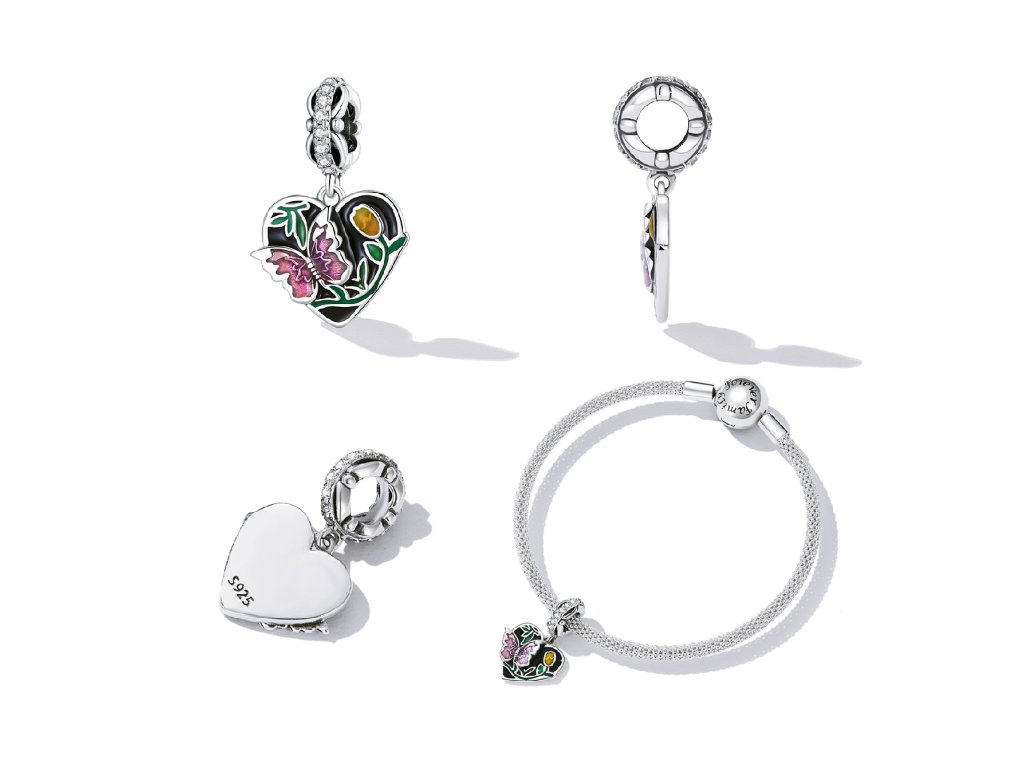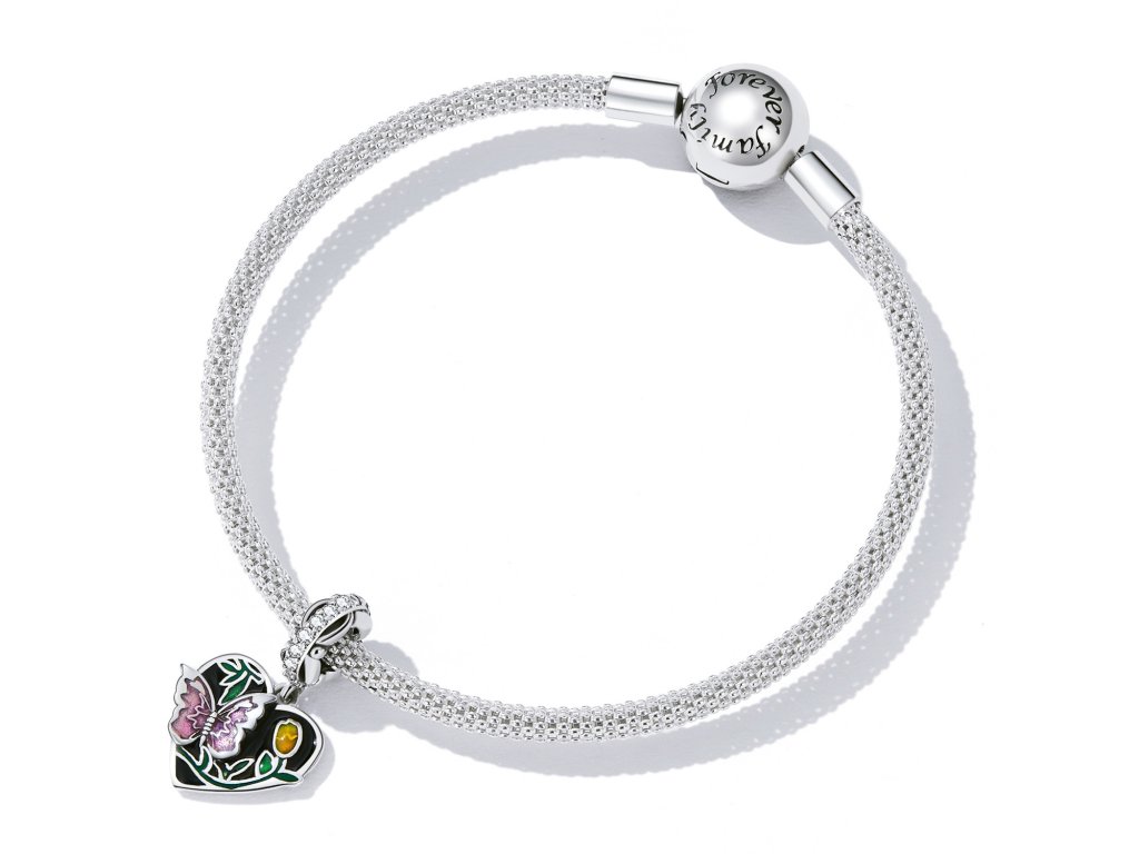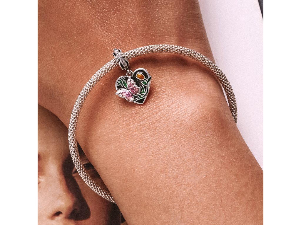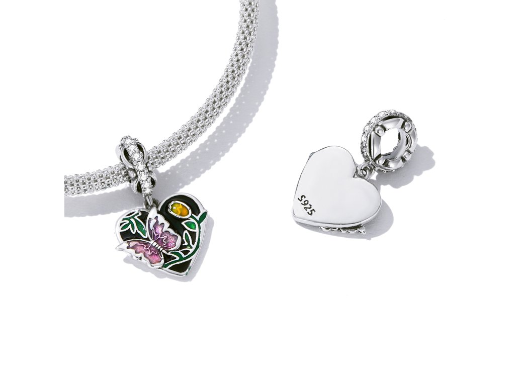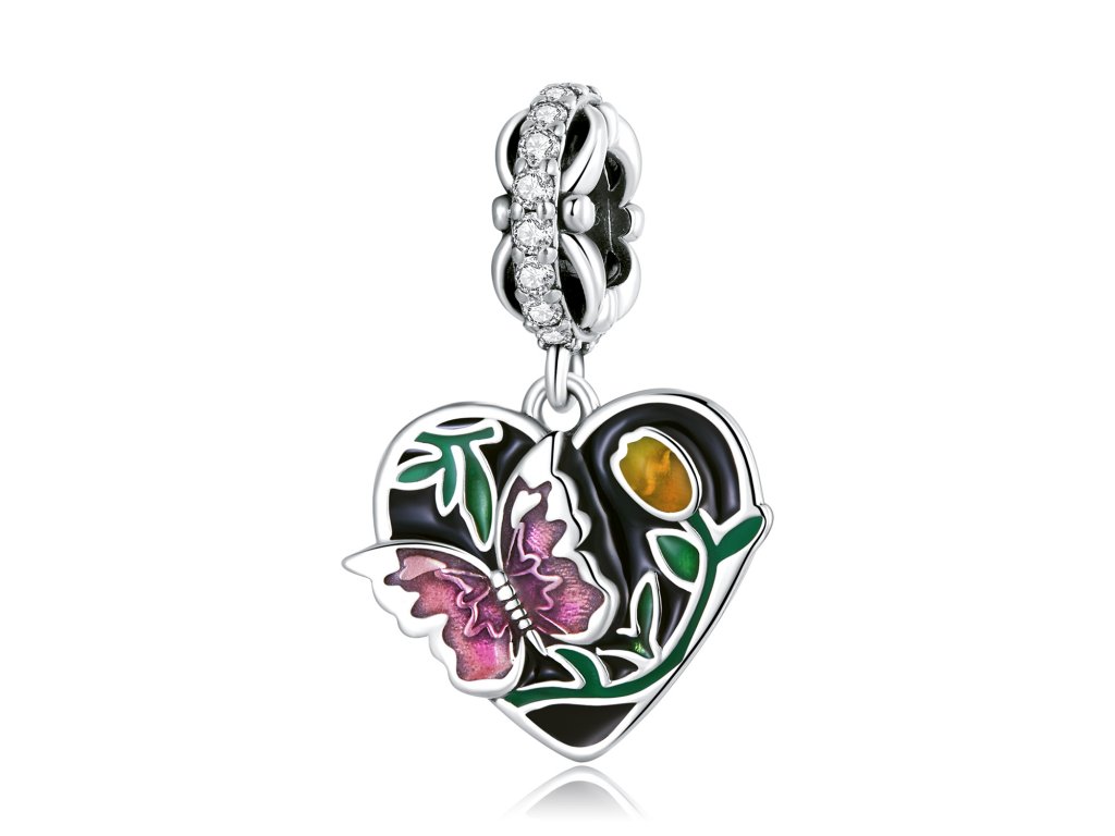 - Stříbrný visací přívěsek v designu kouzelné přírody s motivem motýlka a tulipánu. Přívěsek je zdoben čirými třpytivými zirkony a ručně nanášenou barevnou glazurou. Originální design přívěsku, kvalitní zpracování a materiál, ručně dohotovené.