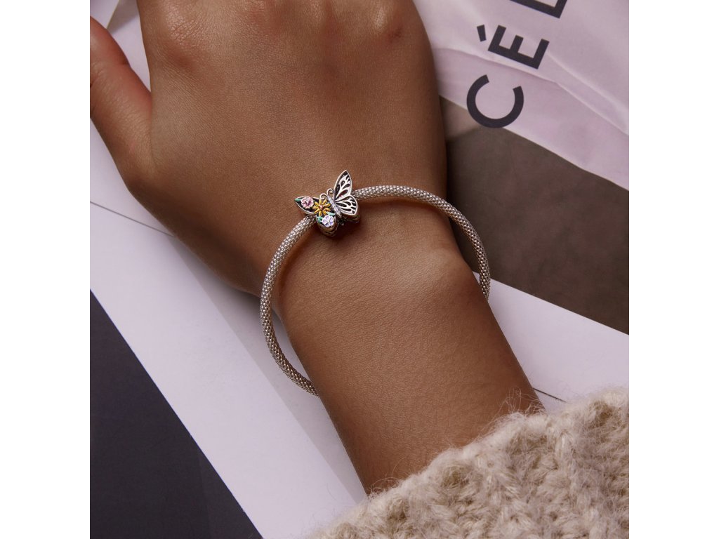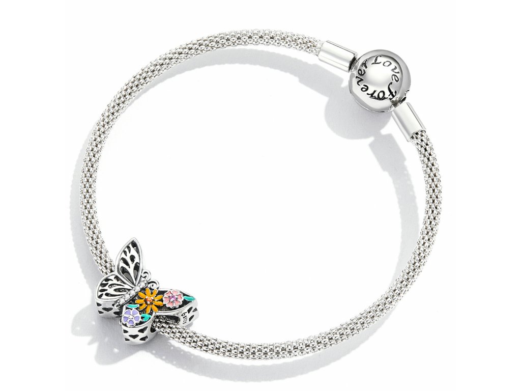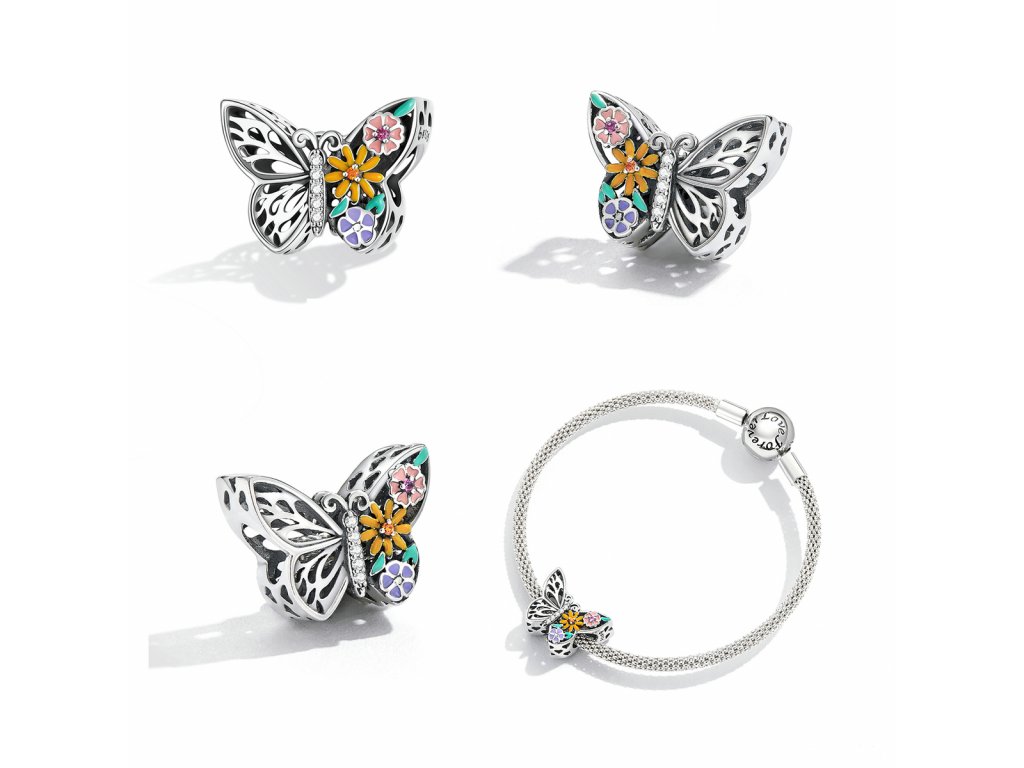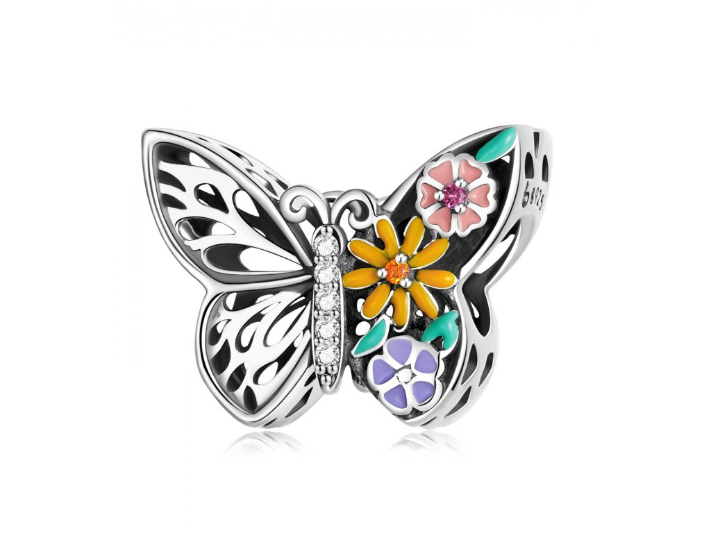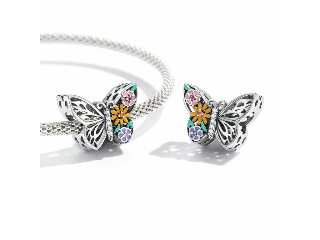 - Stříbrný přívěsek v designu krásného květovaného motýla zdobeného třpytivými zirkony, ručně nanášenou barevnou glazurou a vyřezávanými milovanými srdíčky po stranách. Originální design přívěsku, kvalitní zpracování a materiál, ručně dohotovené.