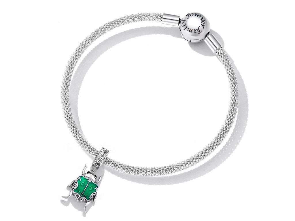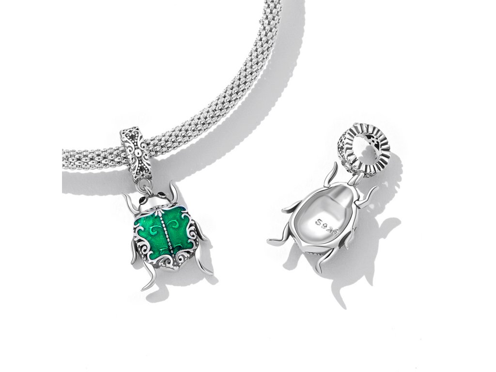 - Stříbrný visací přívěsek v designu krásného broučka zdobeného ručně nanášenou třpytivou zelenou glazurou. Originální design přívěsku, kvalitní zpracování a materiál, ručně dohotovené.