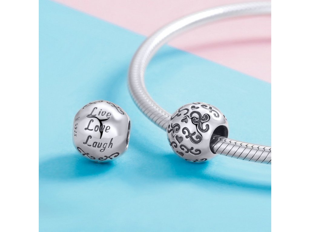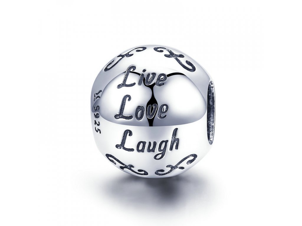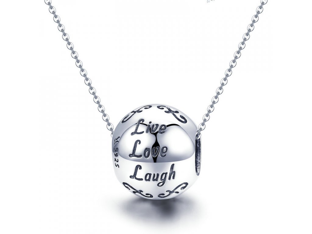 Stříbrný přívěsek v designu krásný život s anglickým textem "Live, Love, Laugh" v překladu "Žít, Milovat, Smát se". Originální design přívěsku, kvalitní zpracování a materiál, ručně dohotovené.