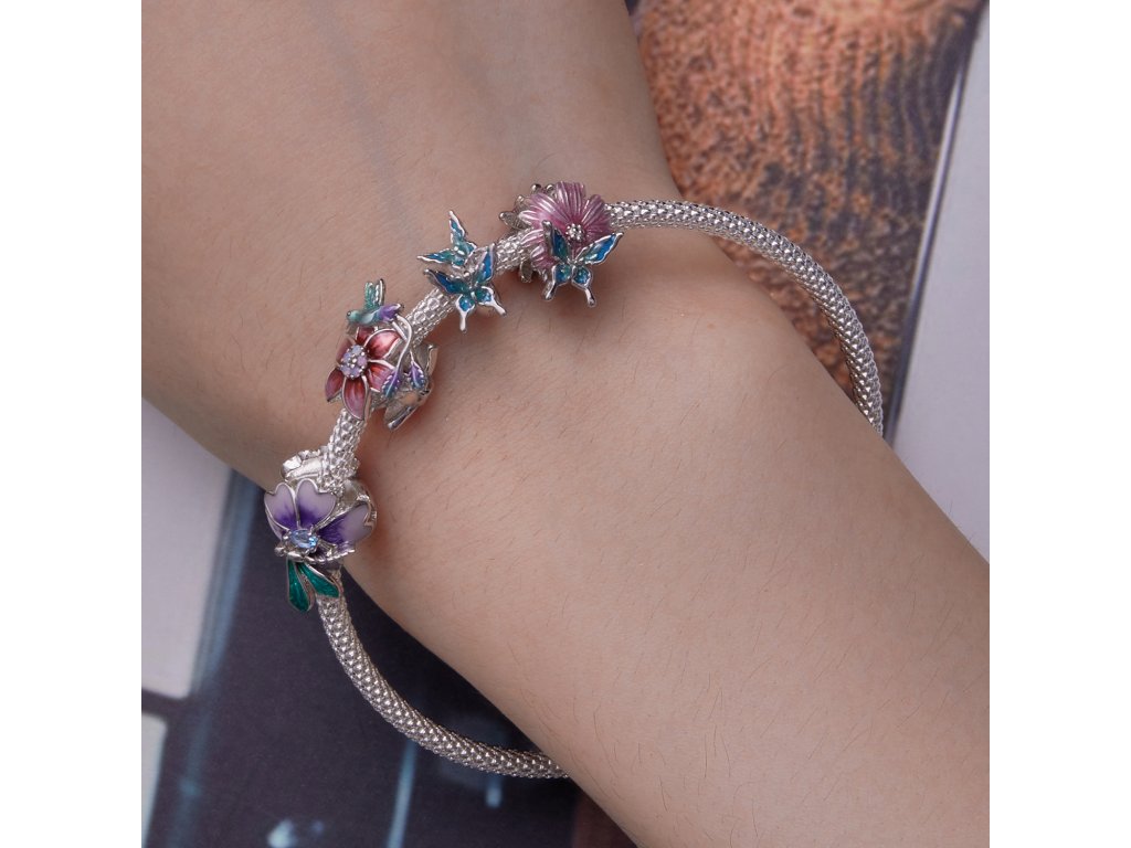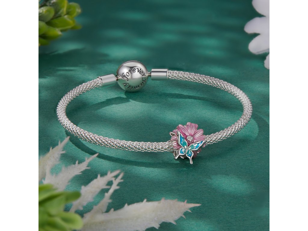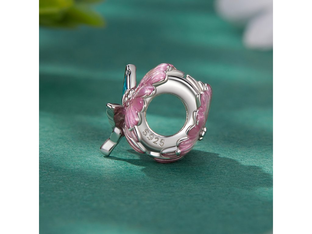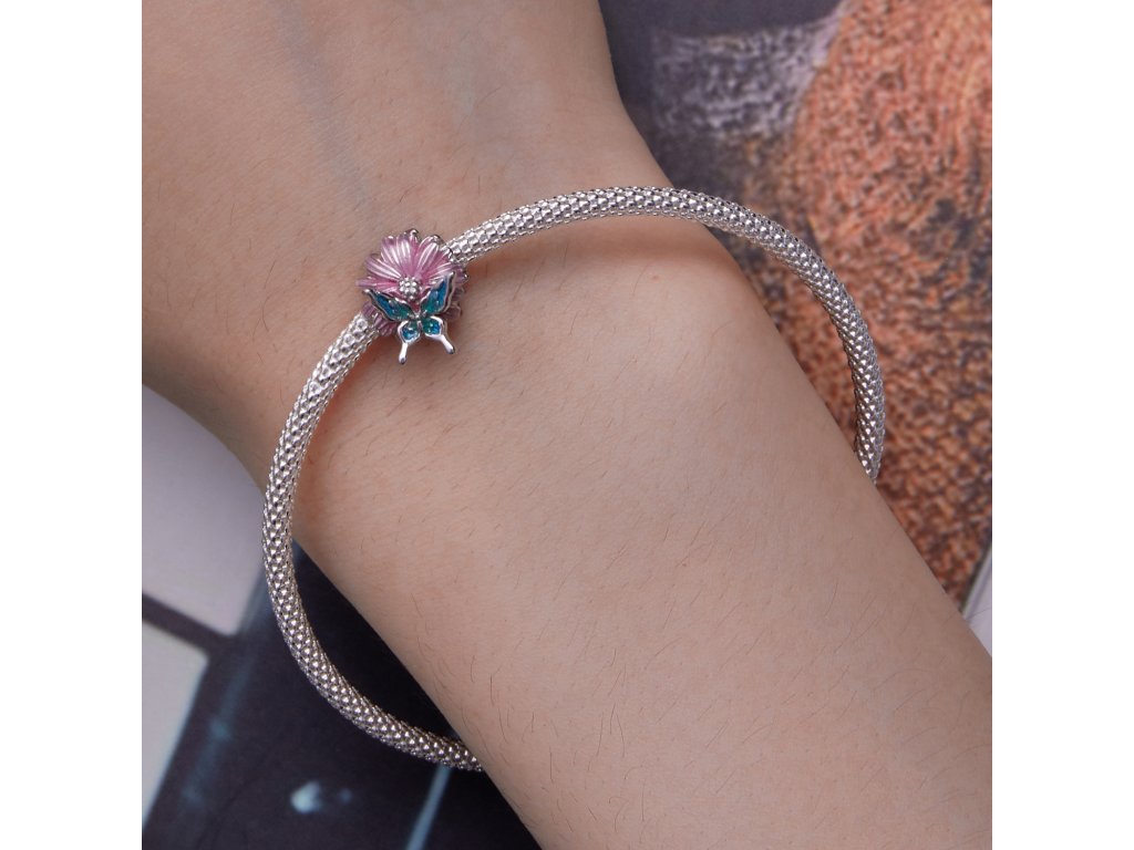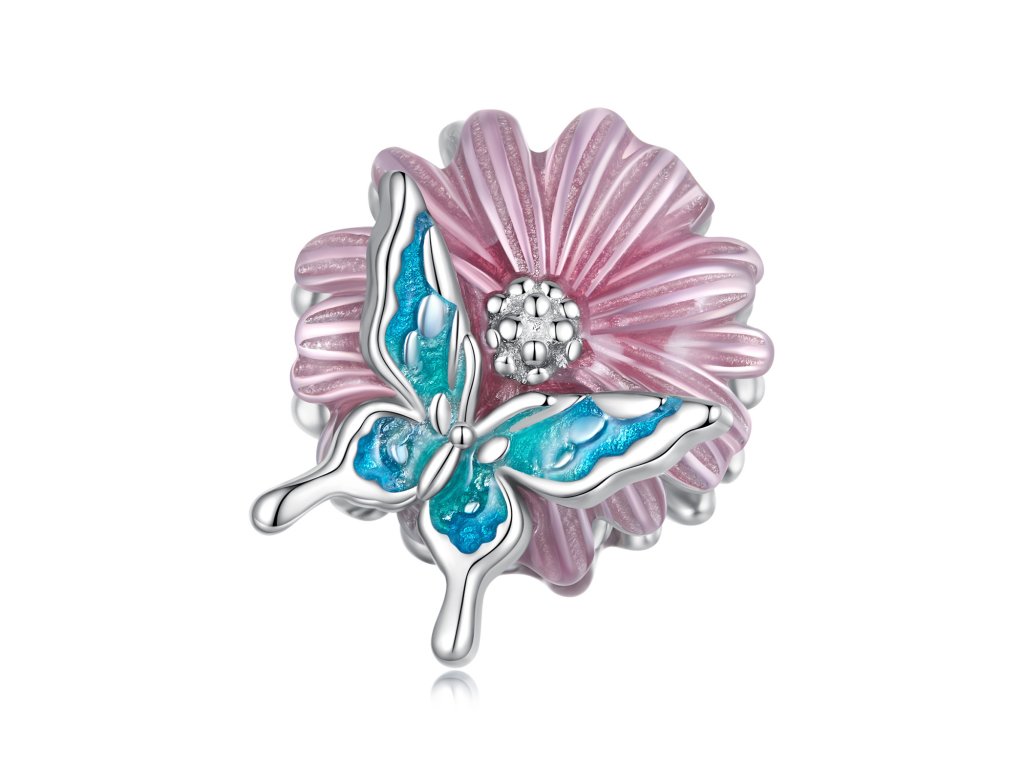 Stříbrný přívěsek ryzosti 925 v designu motýla na květině je šperk vyrobený ze stříbra s vysokou ryzostí 925, který je potažen speciální glazurou, která mu dodává lesk a třpytivý vzhled.