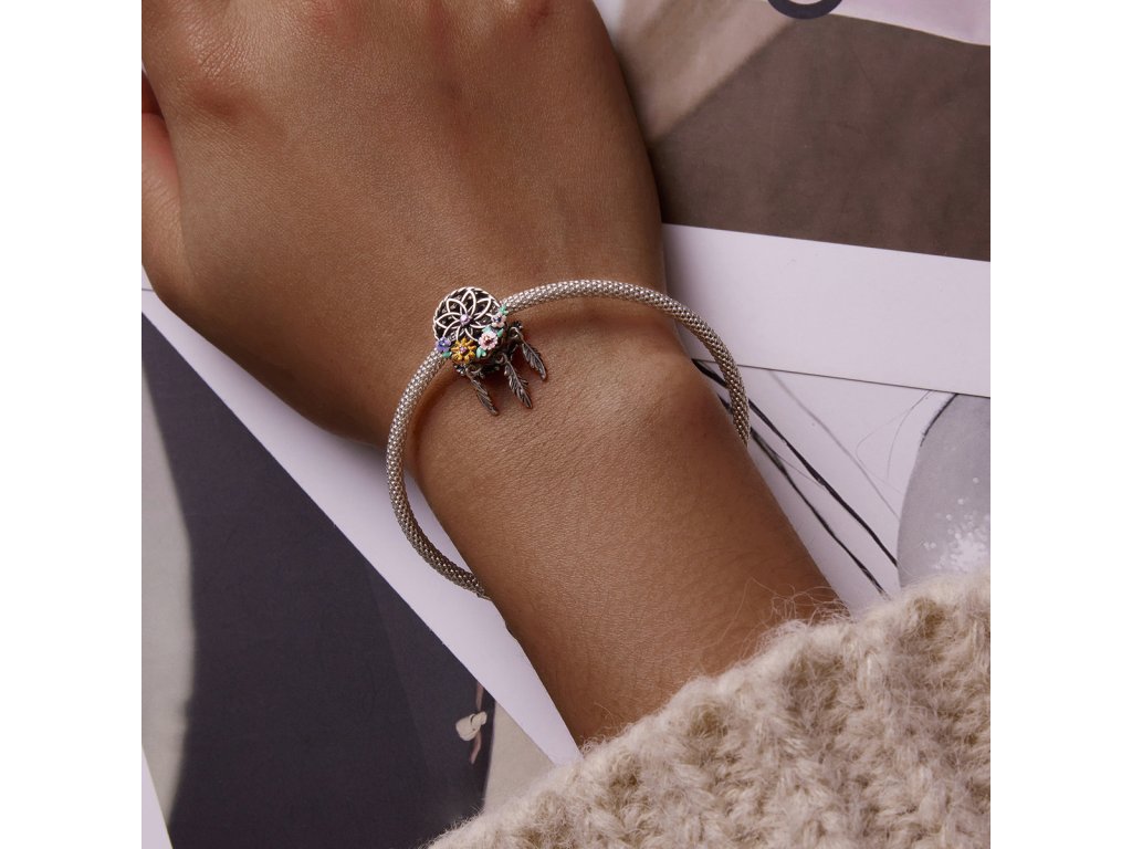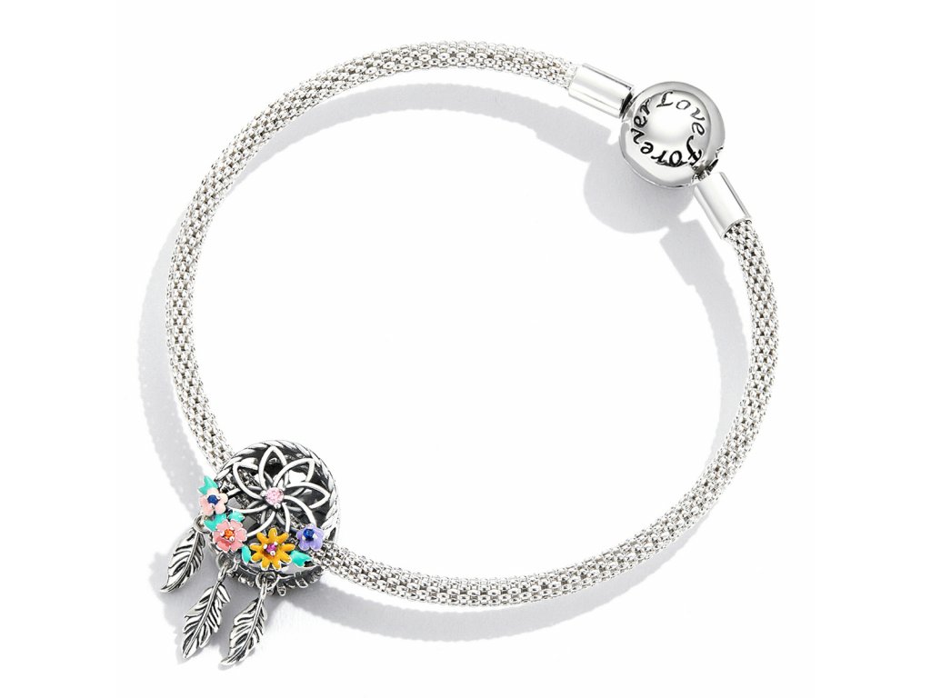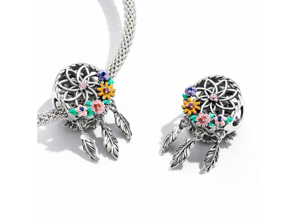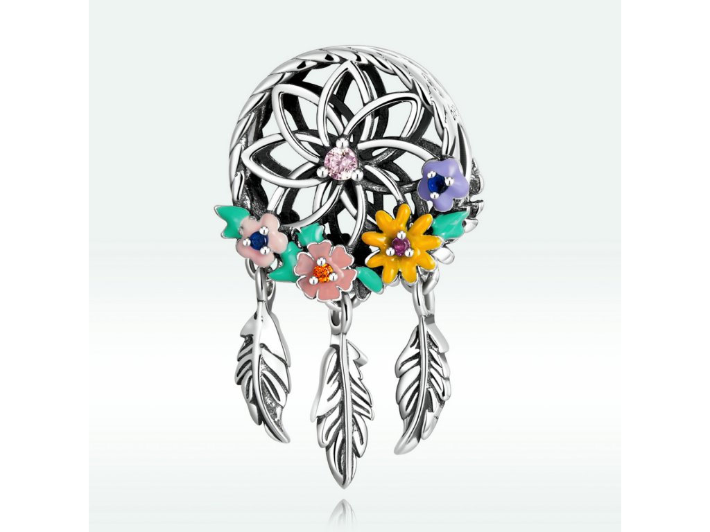 - Stříbrný přívěsek v designu spirituálního lapače snů zdobeného květy se třpytivými zirkony a ručně nanášenou barevnou glazurou. Originální design přívěsku, kvalitní zpracování a materiál, ručně dohotovené.