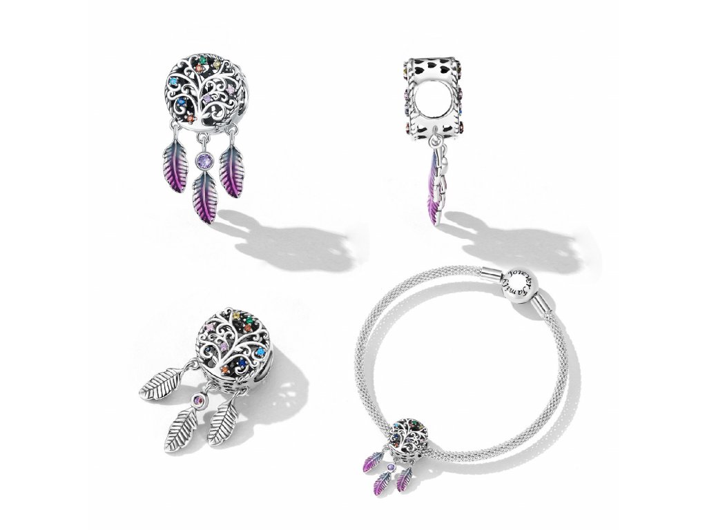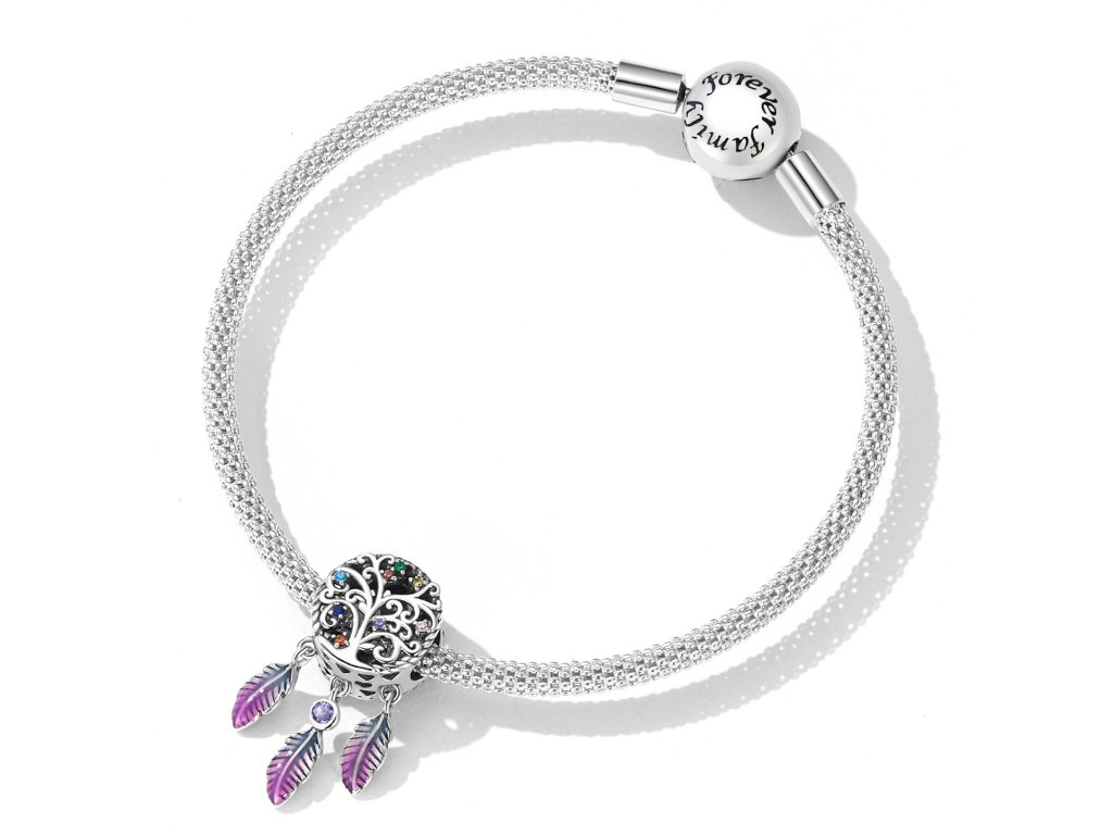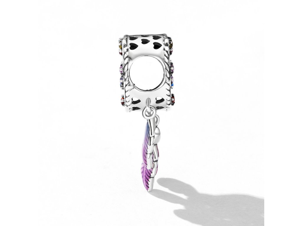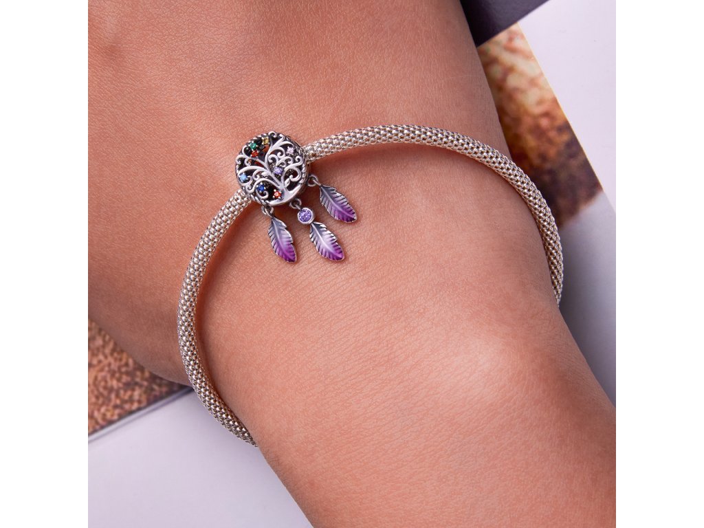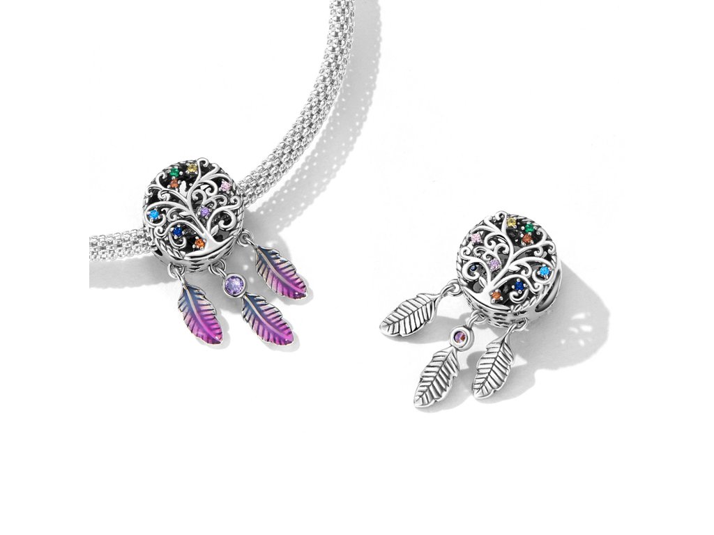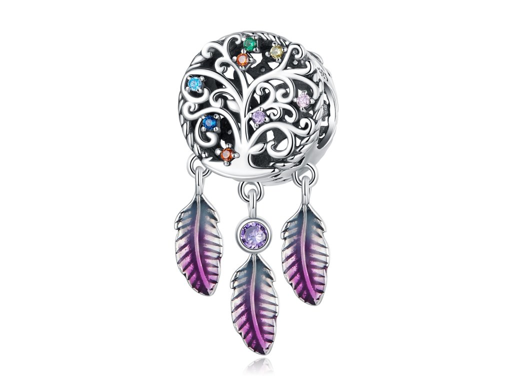 - Stříbrný přívěsek v designu krásného spirituálního lapače snů zdobeného barevnými třpytivými zirkony a ručně nanášenou fialovou glazurou. Přívěsek je také obohacen vyřezávanými milovanými srdíčky po stranách. Originální design přívěsku, kvalitní zpracování a materiál, ručně dohotovené.