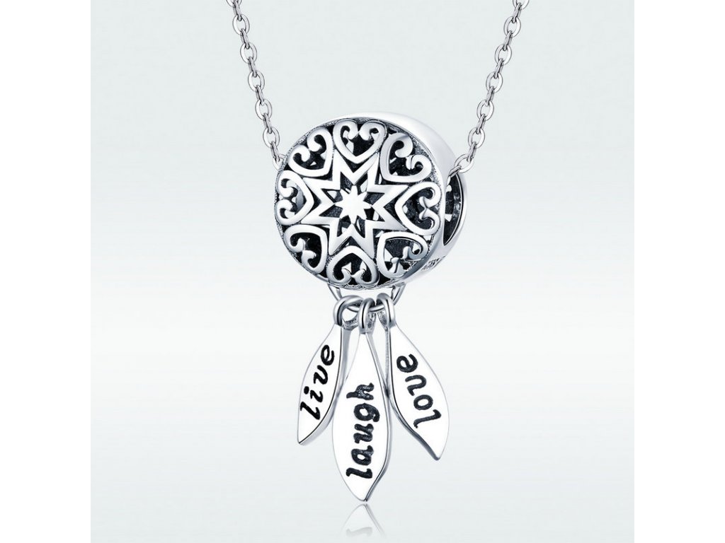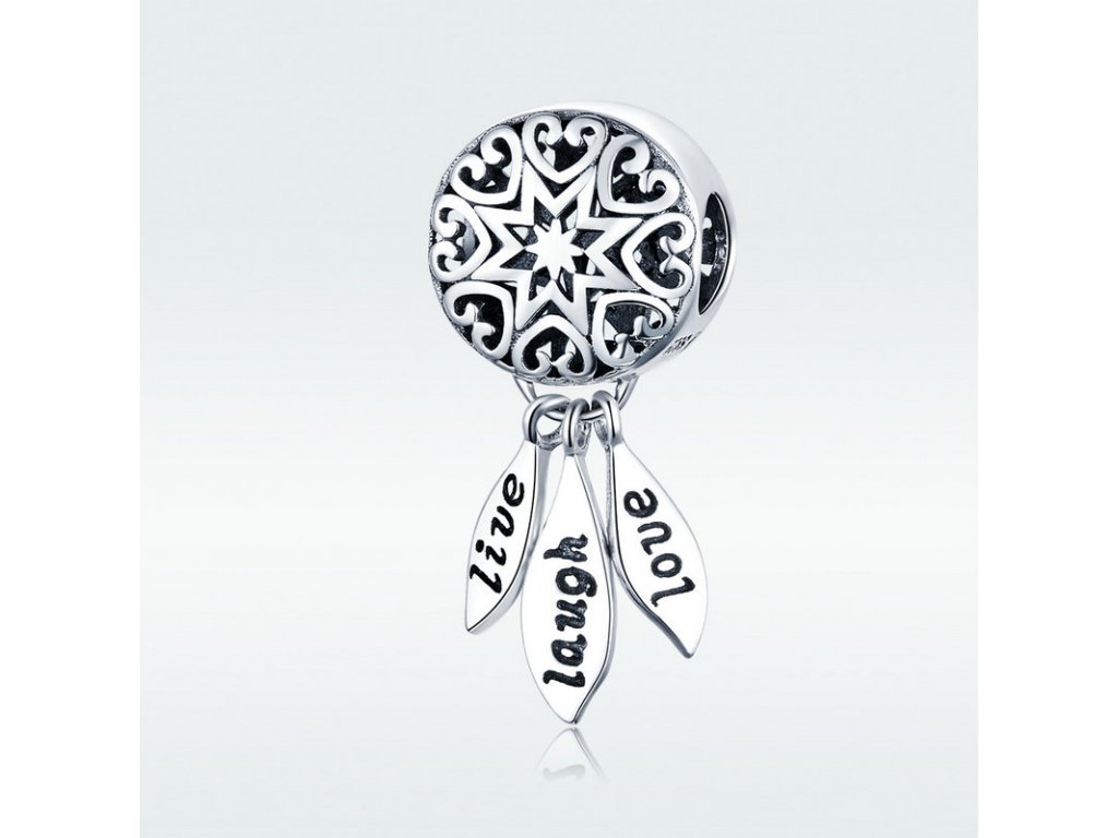 Luxusní stříbrný korálek v designu lapače snů s textem "Live, Laugh, Love" v překladu "Žij, Směj se, Miluj". Lapač snů se používá jako ochranný symbol pro dobrý spánek a celkově zlepšují atmosféru svým pozitivním vyzařováním. Originální design přívěsku, kvalitní zpracování a materiál, ručně dohotovené.