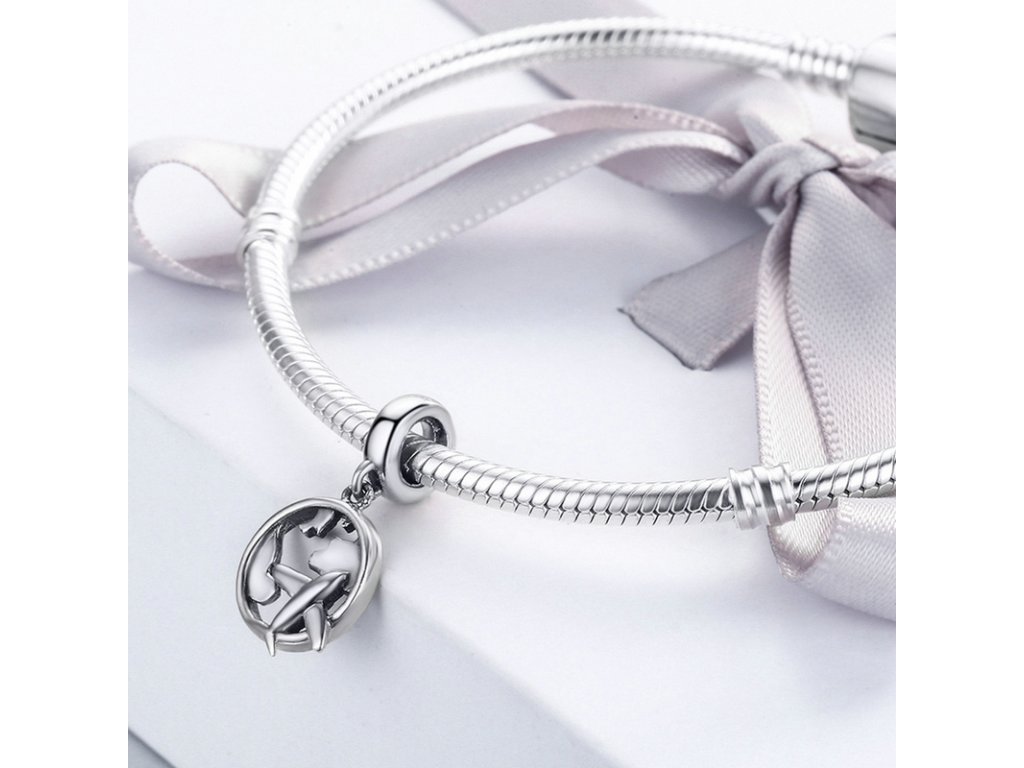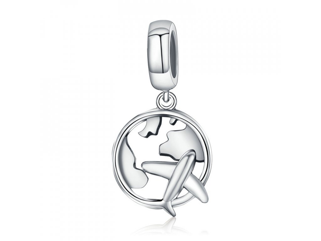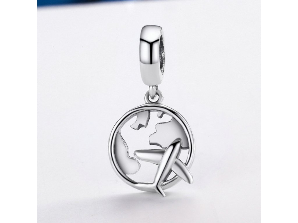 Krásný cestovatelský visací přívěsek z hladkého stříbra obohacený velkým letícím letadlem.