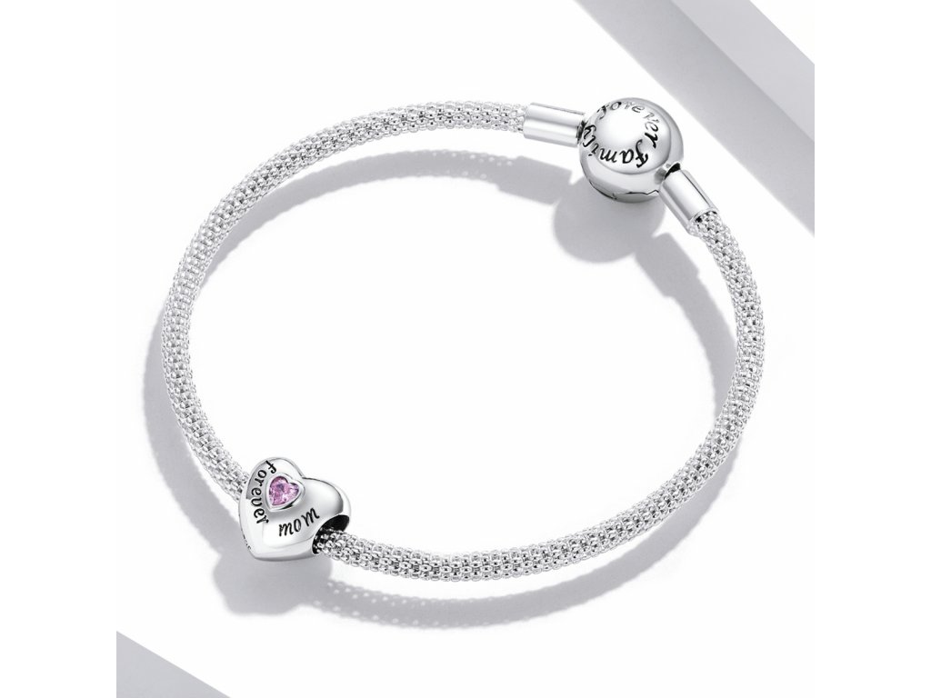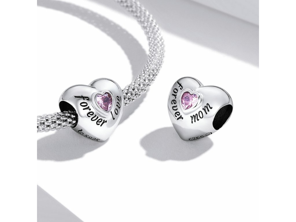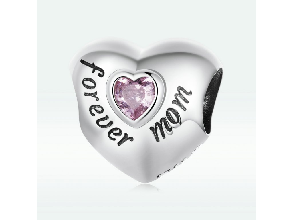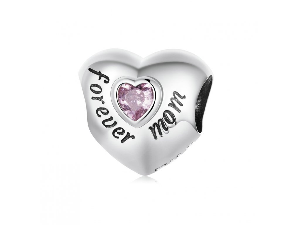 - Stříbrný přívěsek ve tvaru srdce zdobený růžovým broušeným zirkonem a anglickým nápisem "forever mom" a z druhé strany "forever love" v překladu "navždy maminka" "navždy láska". Originální design přívěsku, kvalitní zpracování a materiál, ručně dohotovené.
