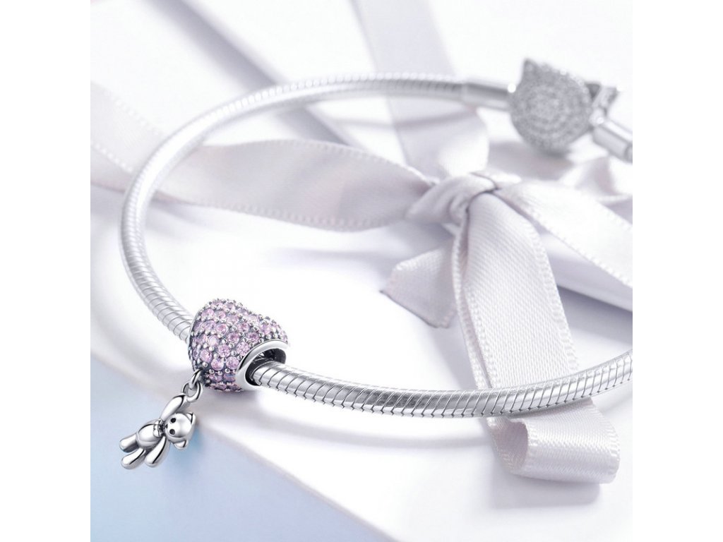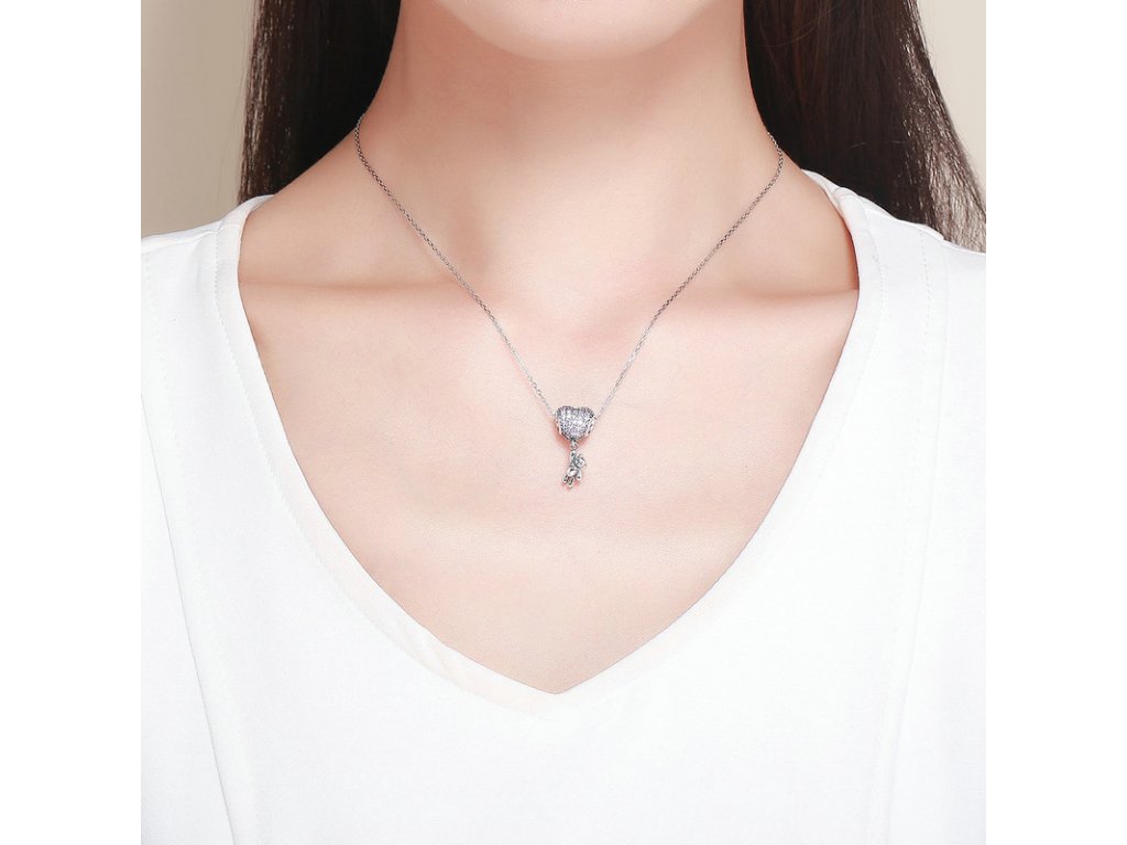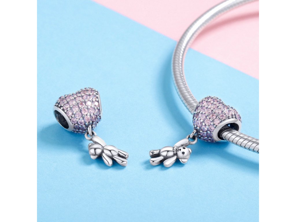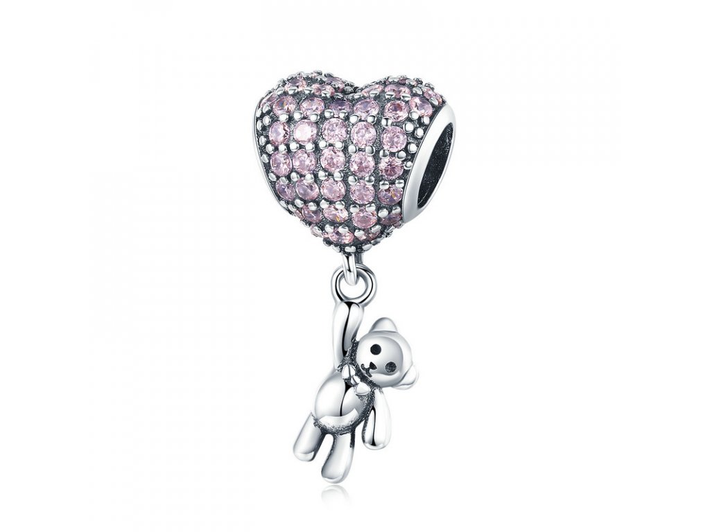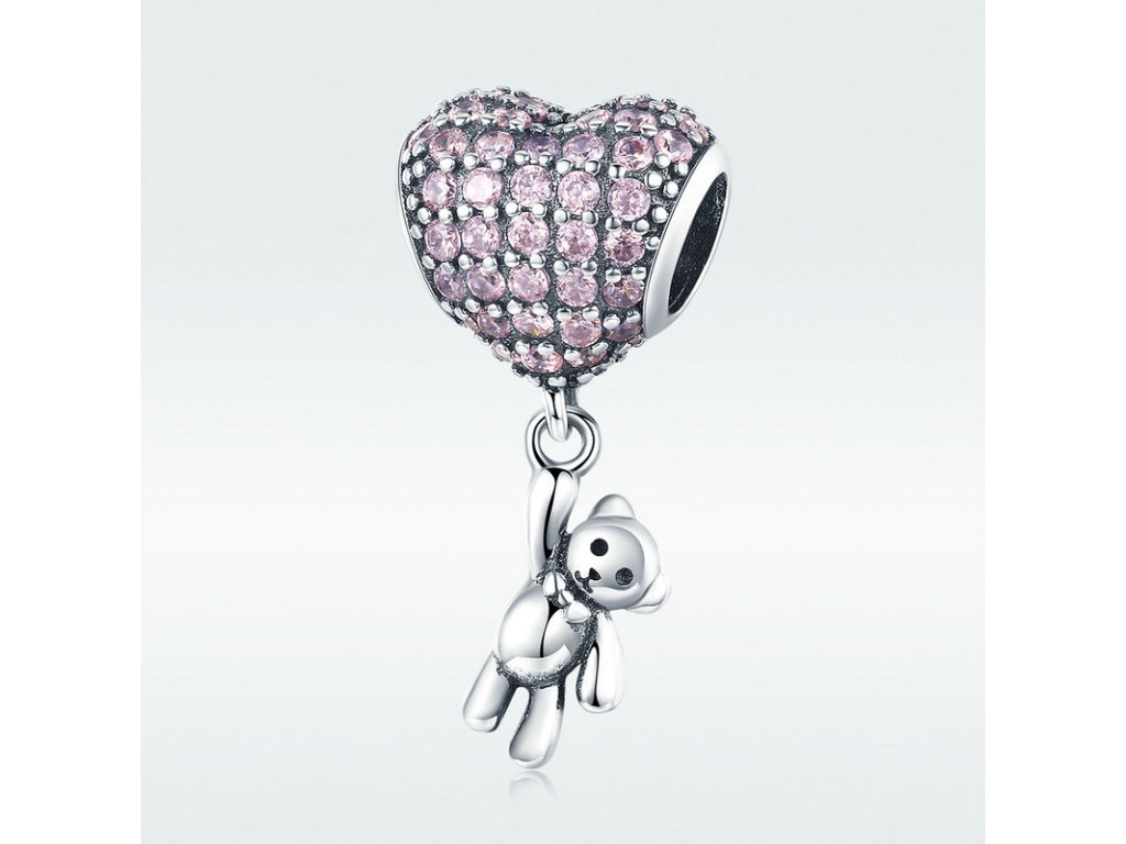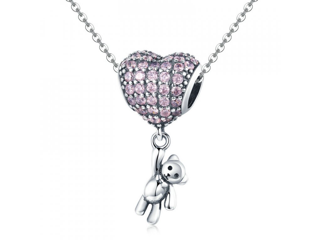 Luxusní a roztomilý přívěsek s růžovými zirkony v podobě srdcového balónu s letícím smaltovaným medvídkem. Originální design přívěsku, kvalitní zpracování a materiál, ručně dohotovené.