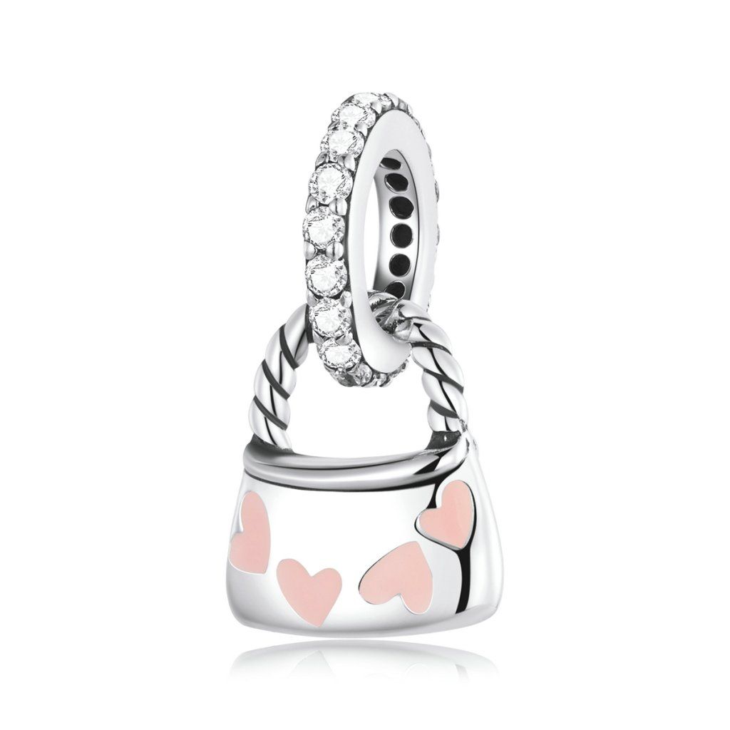 - Stříbrný visací přívěsek v designu milované kabelky zdobené srdíčky tvořenými ručně nanášenou růžovou glazurou. Přívěsek je také obohacen řadou čirých třpytivých zirkonů. Originální design přívěsku, kvalitní zpracování a materiál, ručně dohotovené.