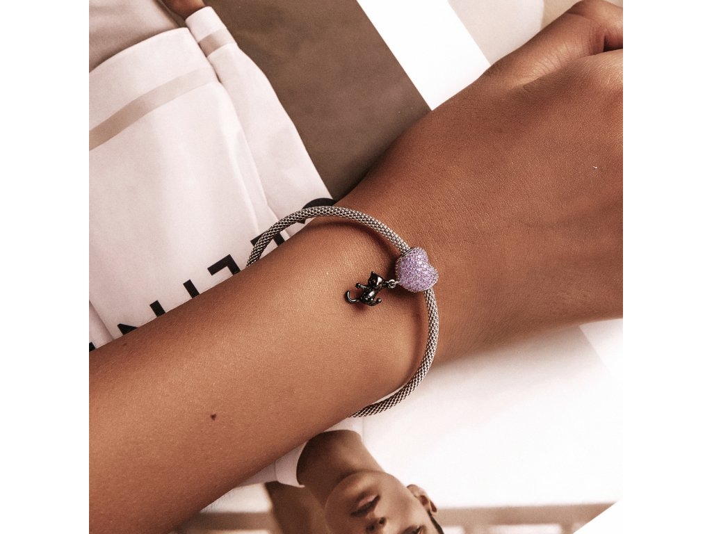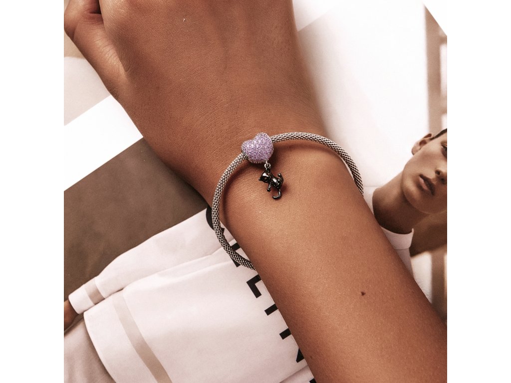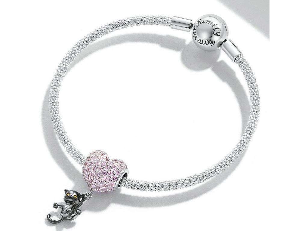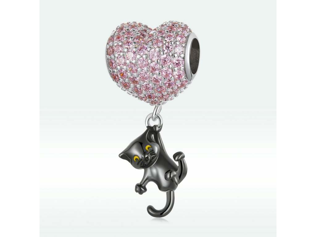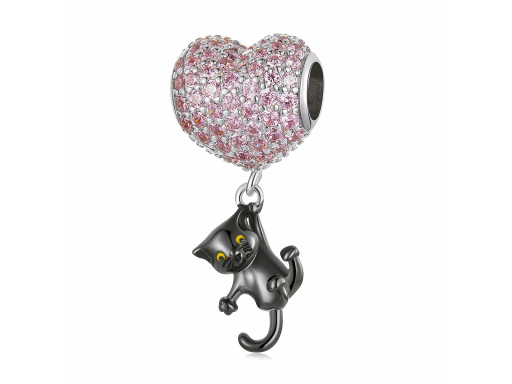 - Stříbrný přívěsek ve tvaru růžového srdce obohaceného třpytivými zirkony s přívěskem hravé kočičky zdobené ručně nanášenou černou glazurou. Originální design přívěsku, kvalitní zpracování a materiál, ručně dohotovené.