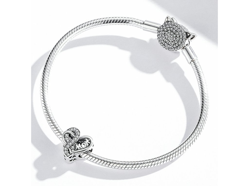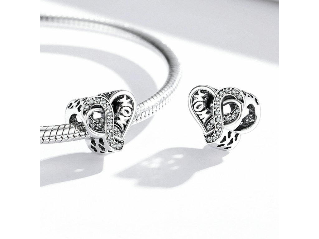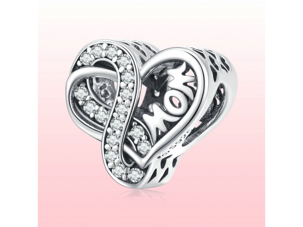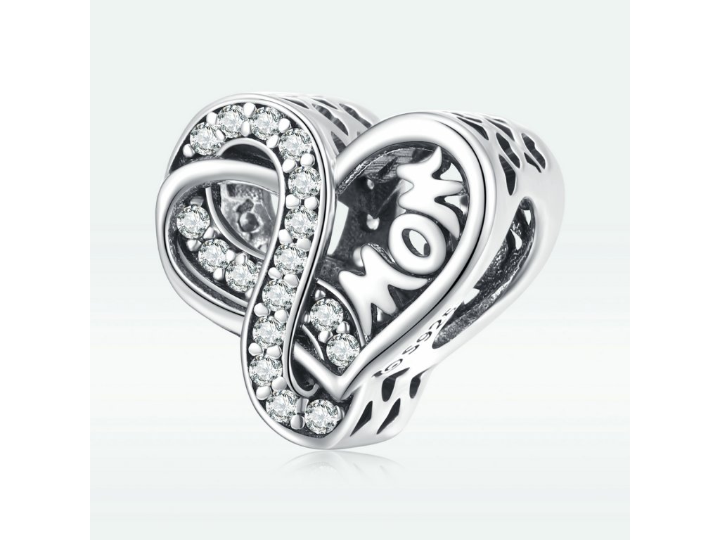 - Stříbrný přívěsek ve tvaru srdce zdobeného anglickým nápisem "mom" v překladu "maminka". Přívěsek dále zdobí třpytivý symbol nekonečna jako symbol nekonečné lásky. Strany přívěsku jsou obohaceny ručně vyřezávanými milovanými srdíčky. Originální design přívěsku, kvalitní zpracování a materiál, ručně dohotovené.