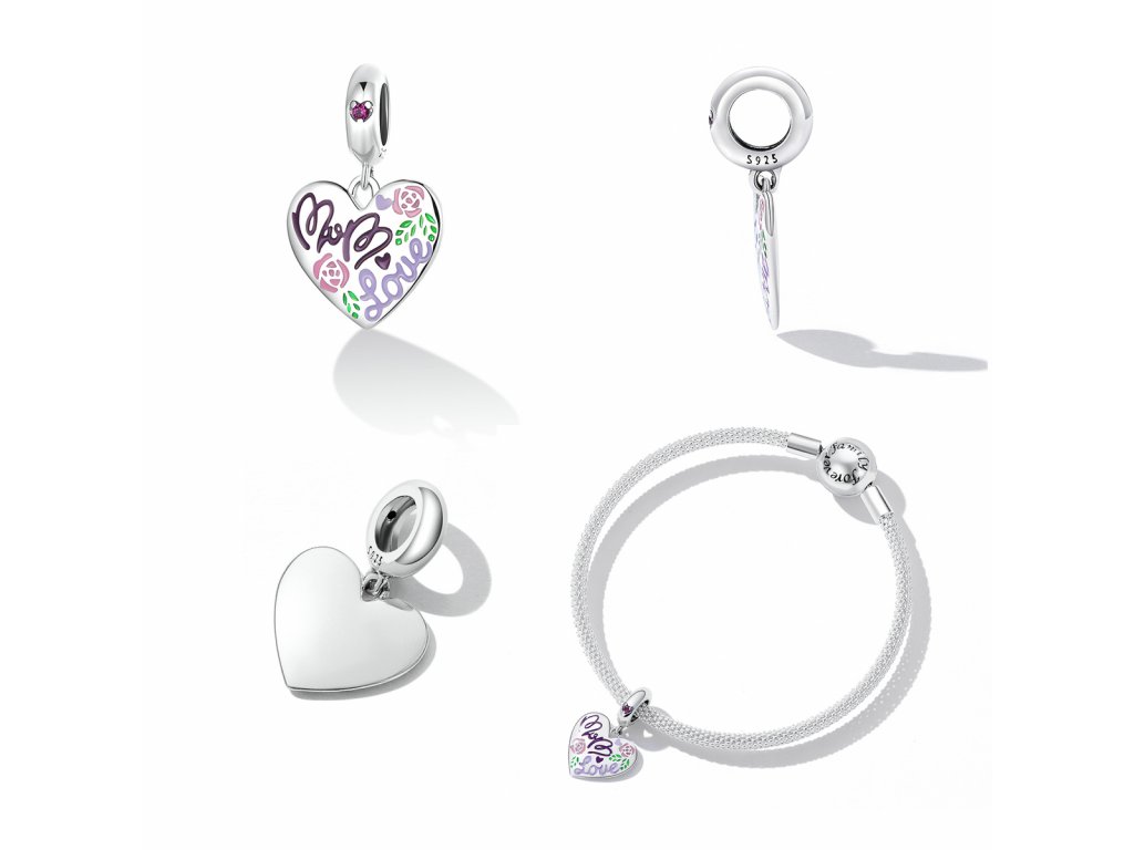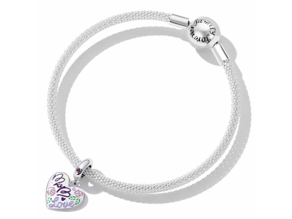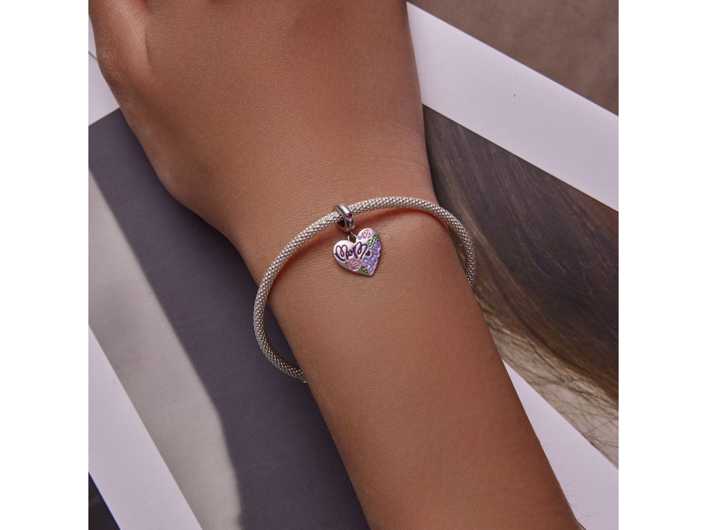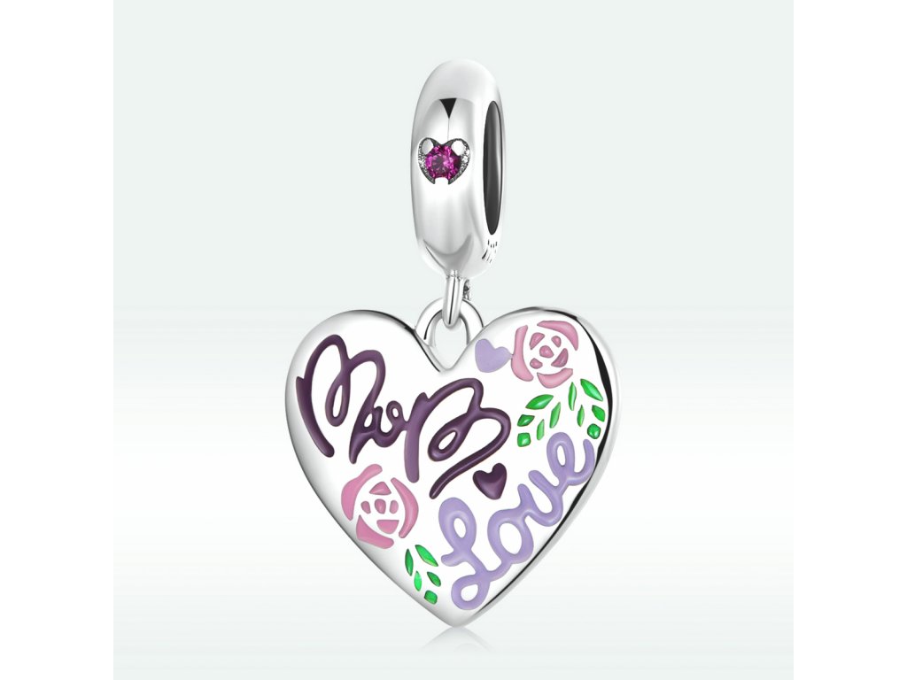 - Stříbrný visací přívěsek zdobený anglickými nápisy "Mom" a "Love" v překladu "Maminka" a "Láska". Květovaný přívěsek zdobený ručně nanášenou barevnou glazurou a fialovým třpytivým zirkonem. Originální design přívěsku, kvalitní zpracování a materiál, ručně dohotovené.