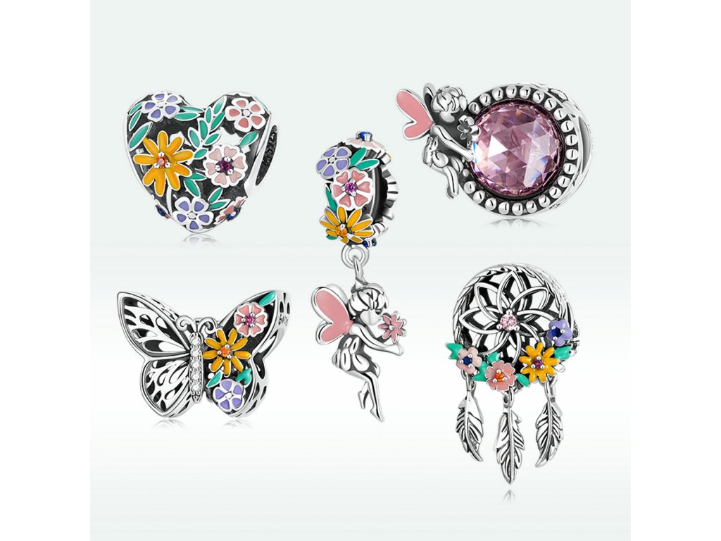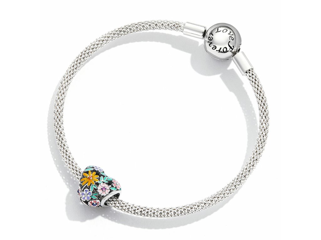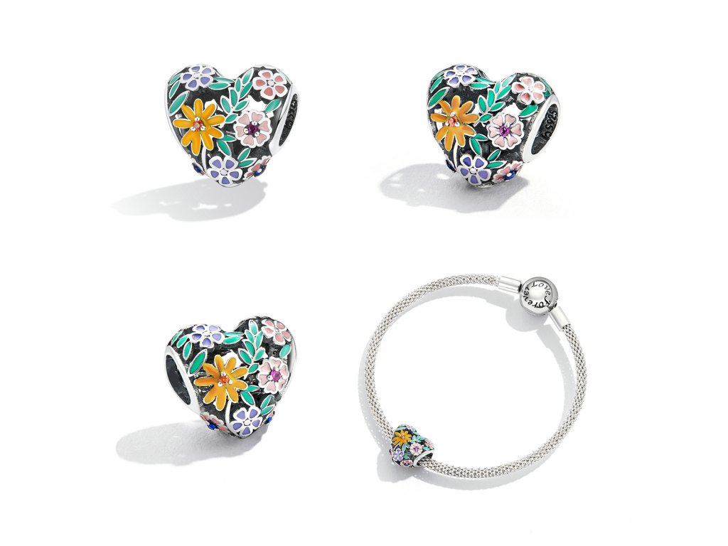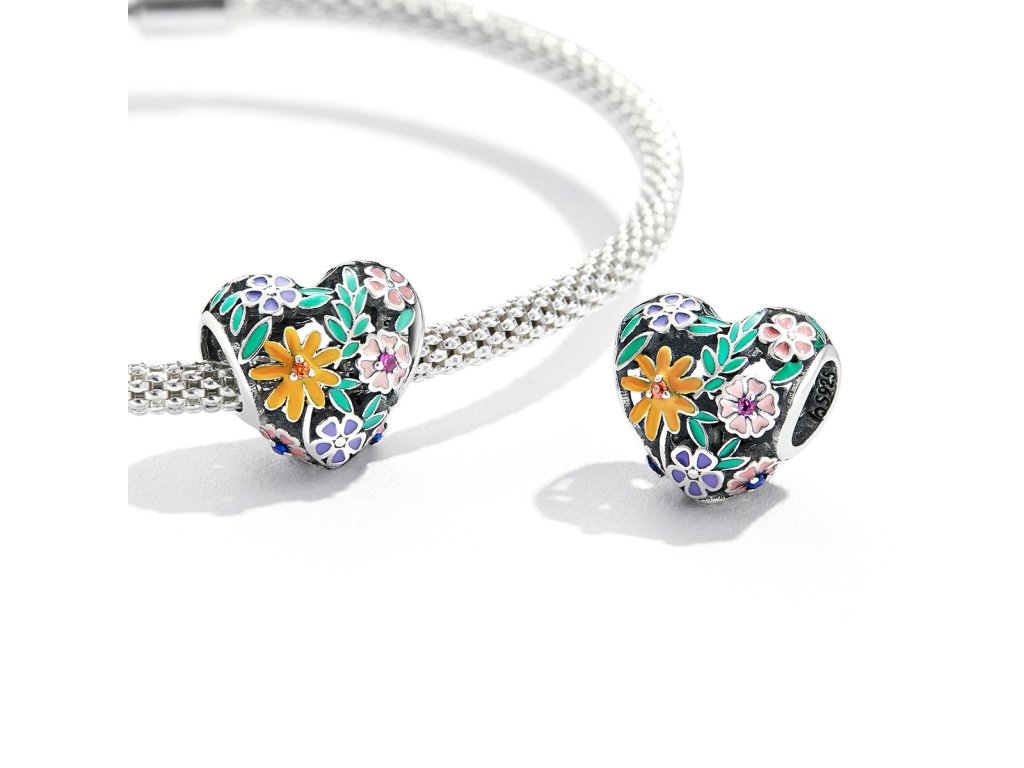 - Stříbrný přívěsek ve tvaru milovaného srdce obohaceného květy a lístky zdobenými ručně nanášenou barevnou glazurou. Originální design přívěsku, kvalitní zpracování a materiál, ručně dohotovené.