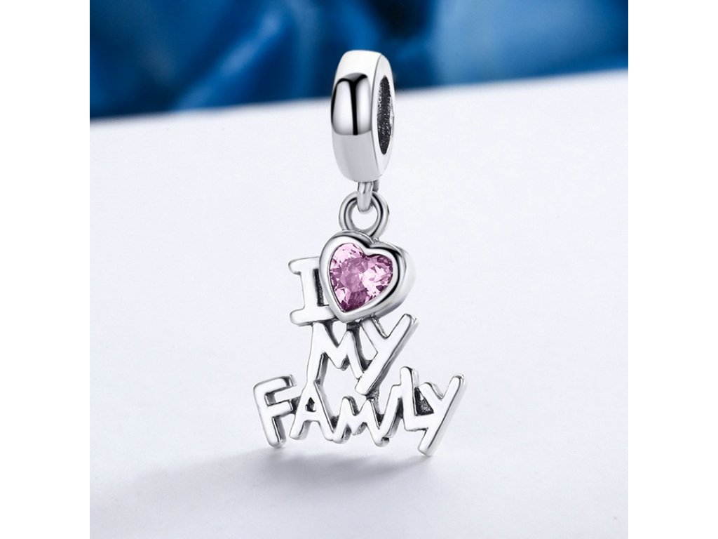 Krásný a milovaný visací přívěsek s růžovým zirkonem ve tvaru srdce a anglickým nápisem "I love my family" (v překladu "Miluji svoji rodinu").