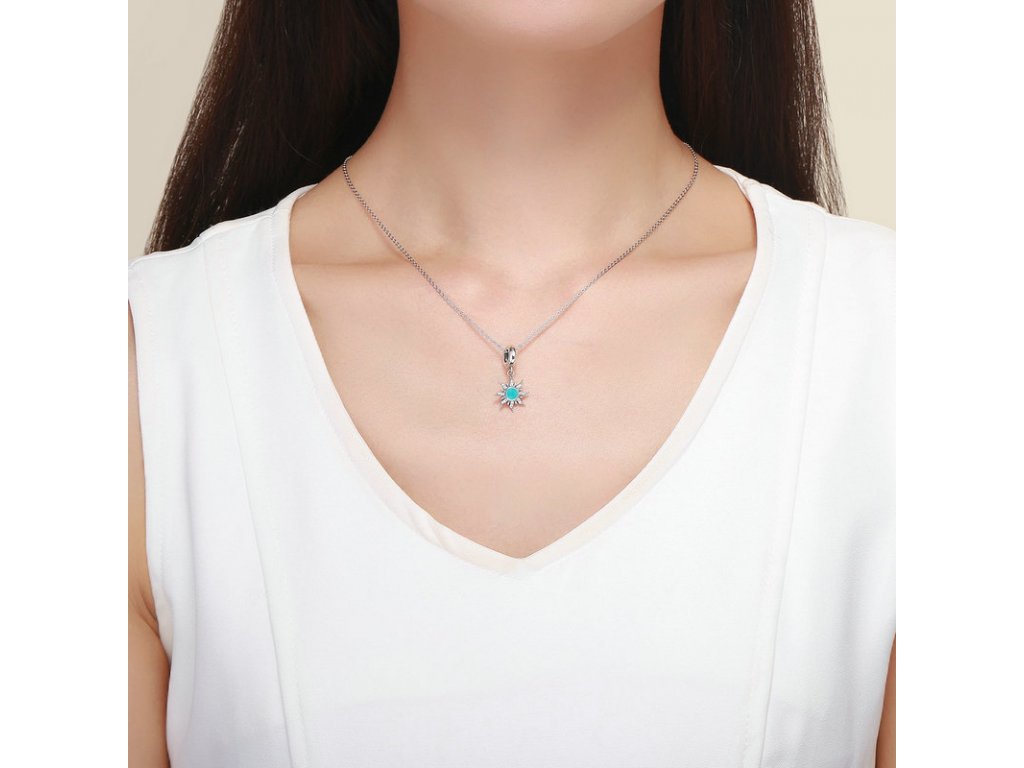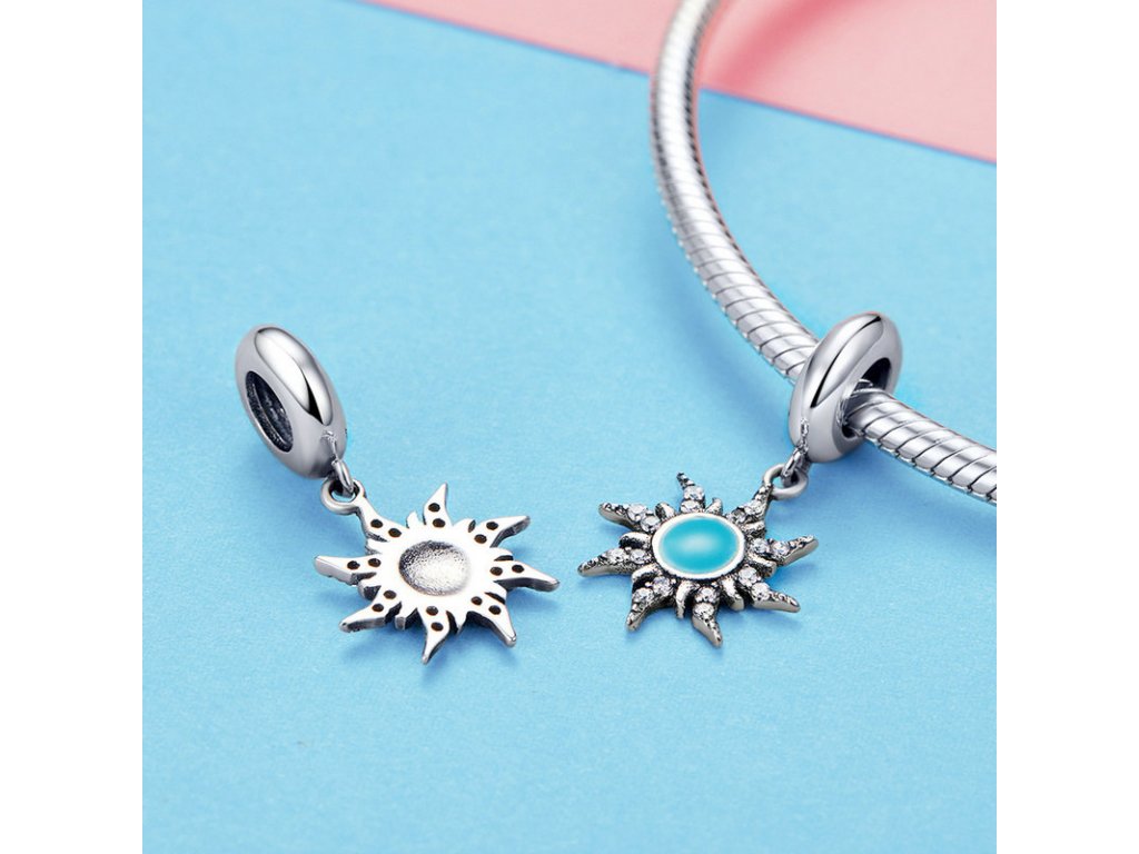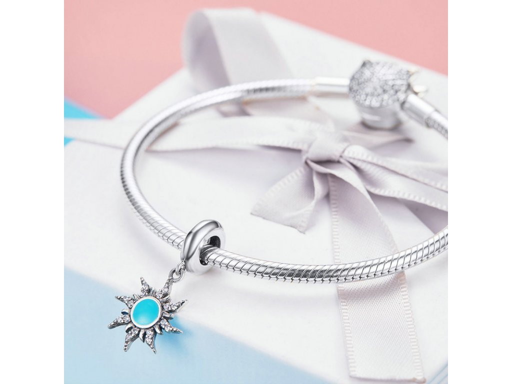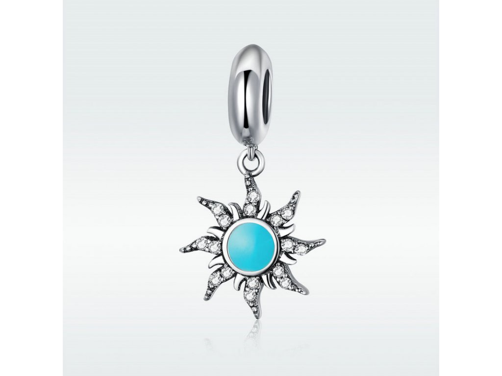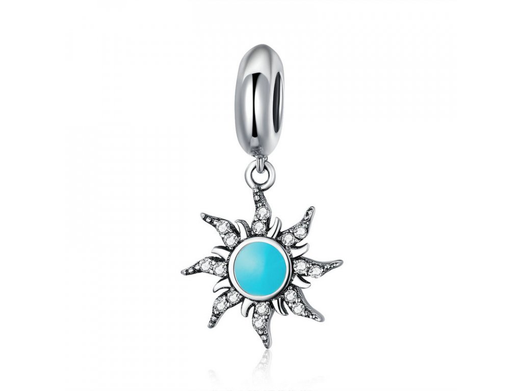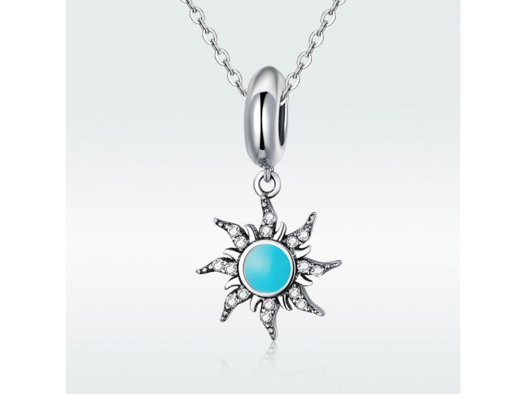Krásný stříbrný visací přívěsek ve tvaru slunce dekorované modrou glazurou a čirými zirkony. Originální design přívěsku, kvalitní zpracování a materiál, ručně dohotovené.