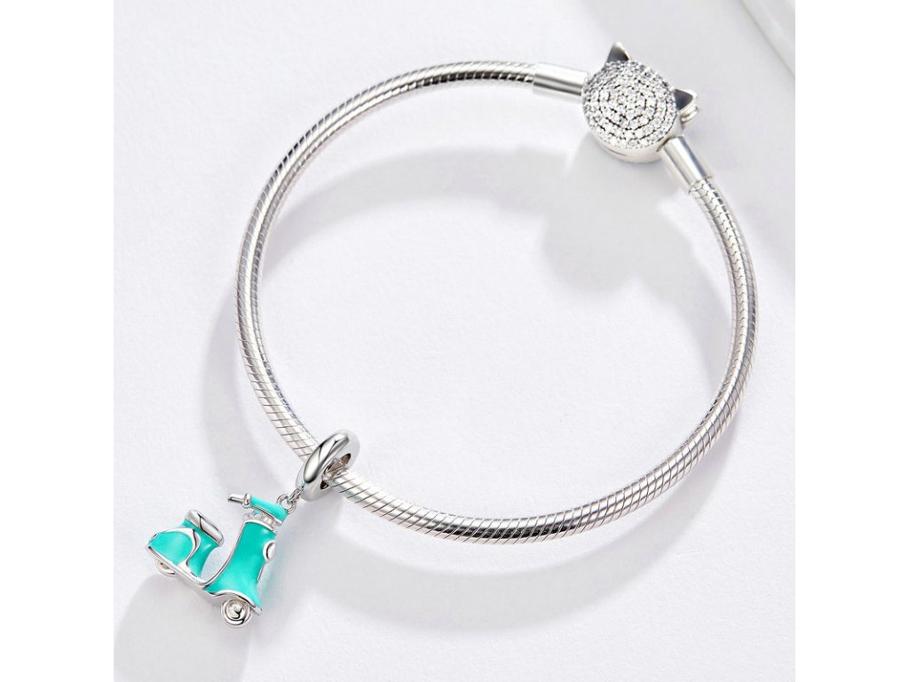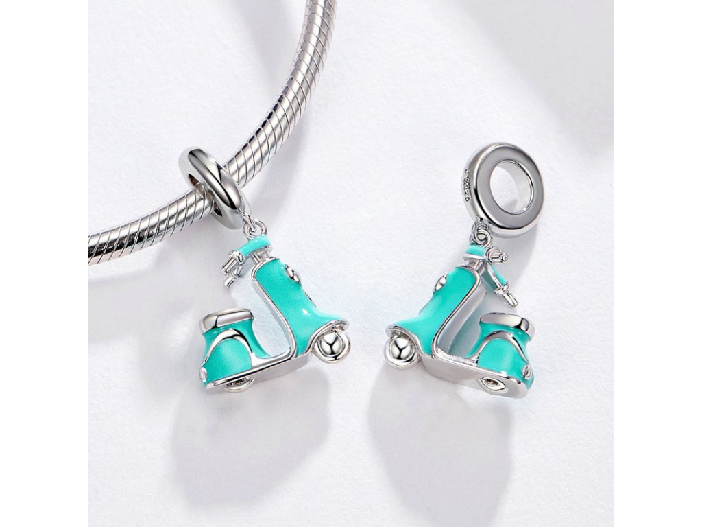 Stříbrný visací přívěsek v designu krásné motorky / skútru zdobeného ručně nanášenou tyrkysovou glazurou. Originální design přívěsku, kvalitní zpracování a materiál, ručně dohotovené.
