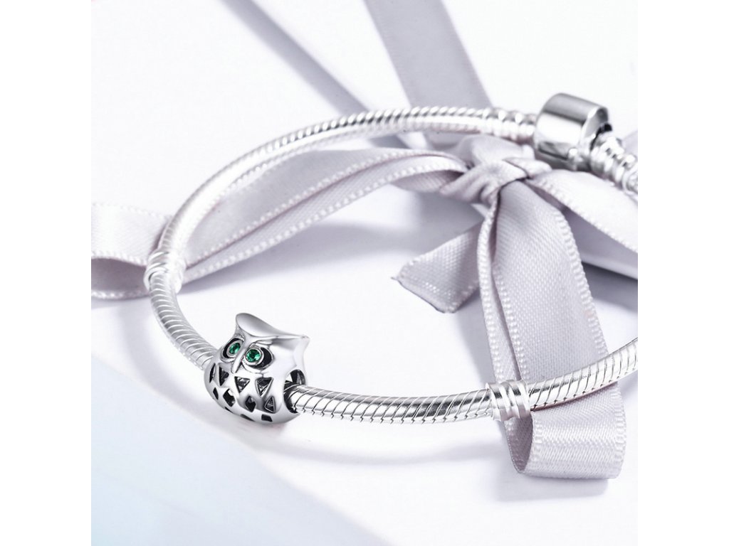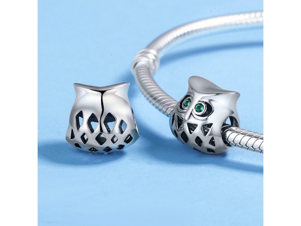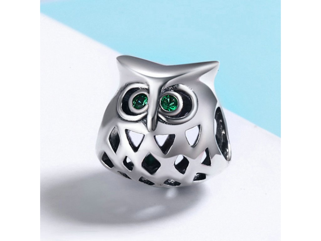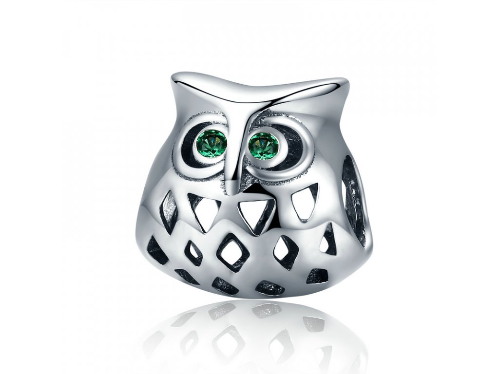 Luxusní a propracovaný přívěsek v designu moudré sovy obohacené zelenými třpytivými zirkony.