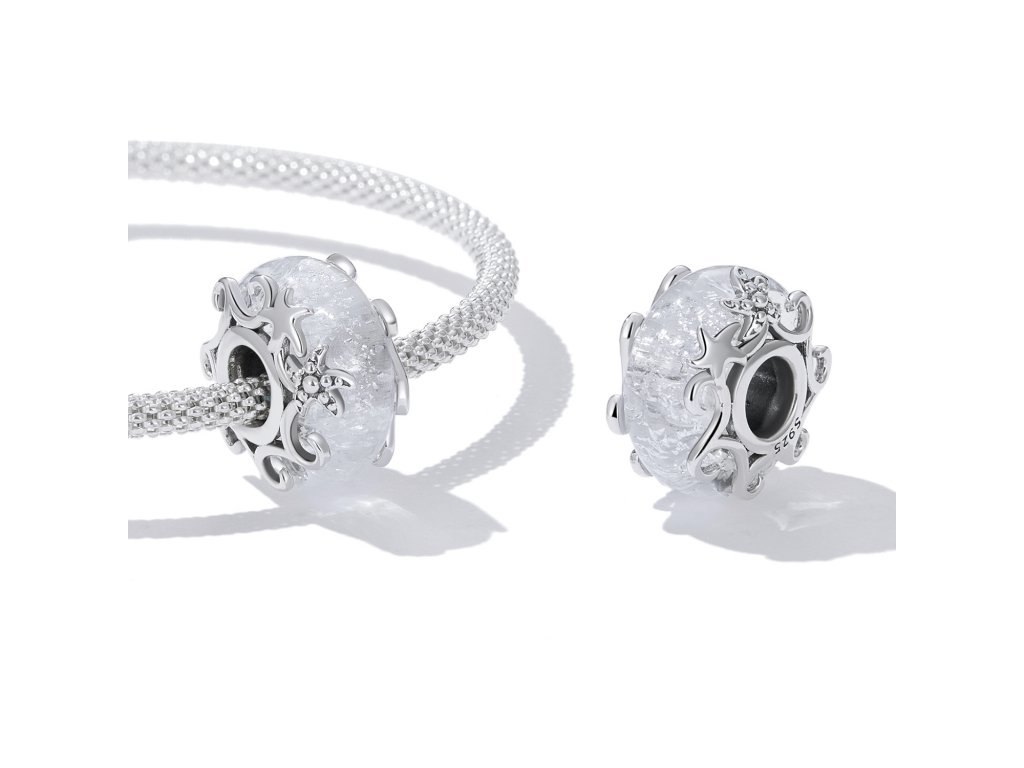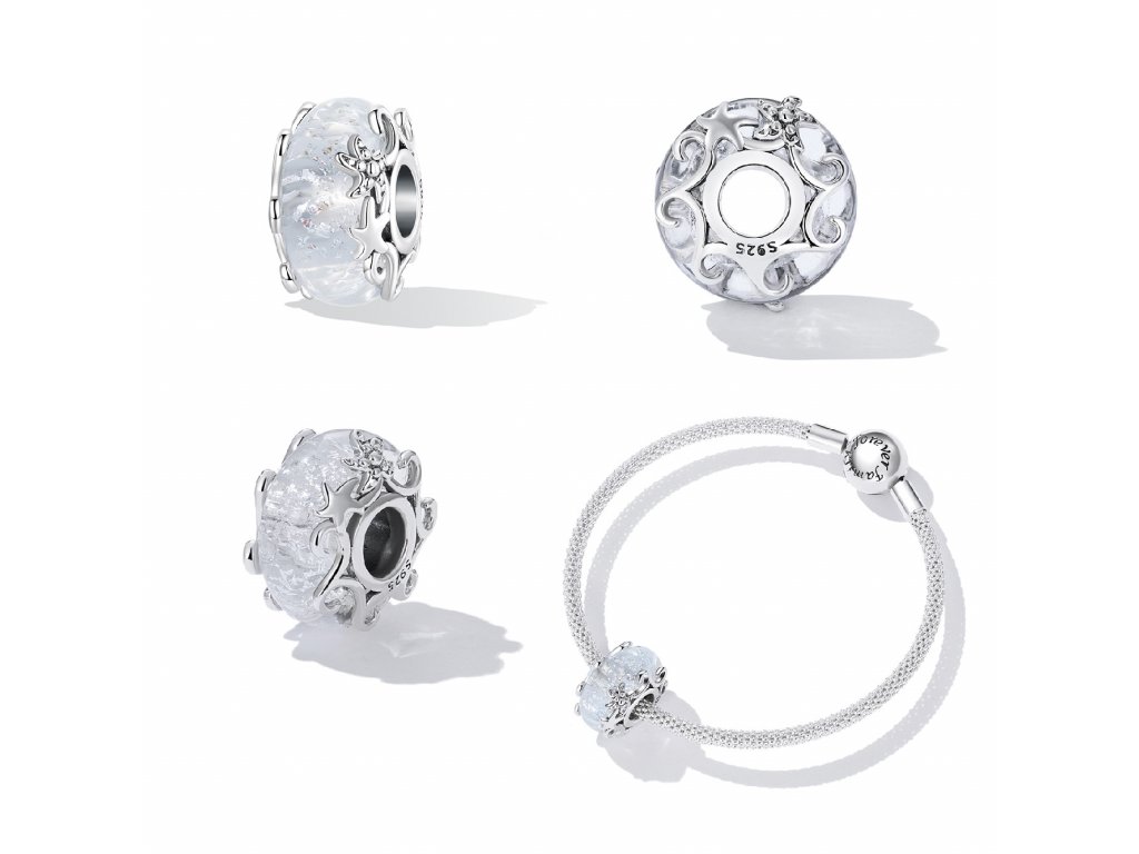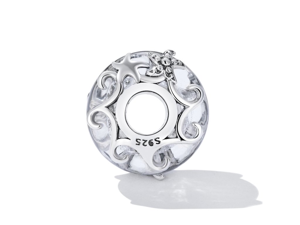 - Stříbrný přívěsek v designu průzračného jiskřivého moře. Murano korálek je po stranách zdobený stříbrnými hvězdicemi a vlnkami. Originální design přívěsku, kvalitní zpracování a materiál, ručně dohotovené.