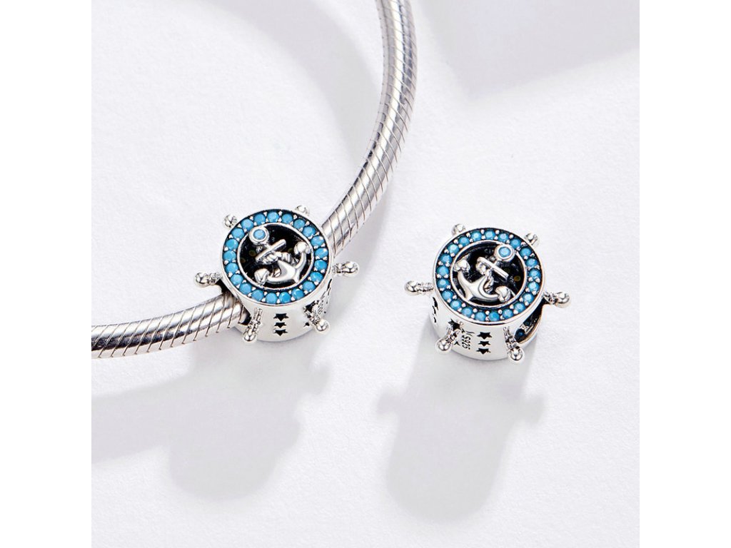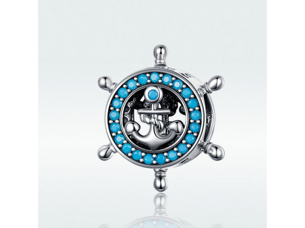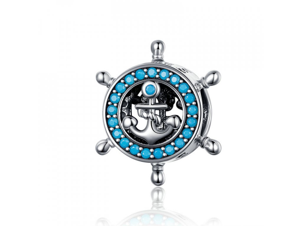 Stříbrný přívěsek v designu Námořnického kormidla zdobeného tyrkysovými zirkony a ručně vyřezávanými hvězdičkami po stranách. Originální design přívěsku, kvalitní zpracování a materiál, ručně dohotovené.