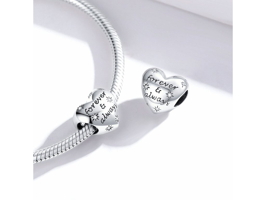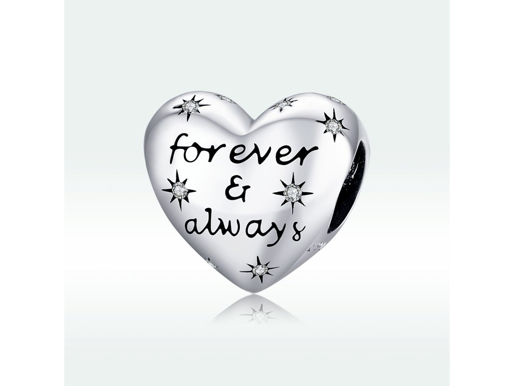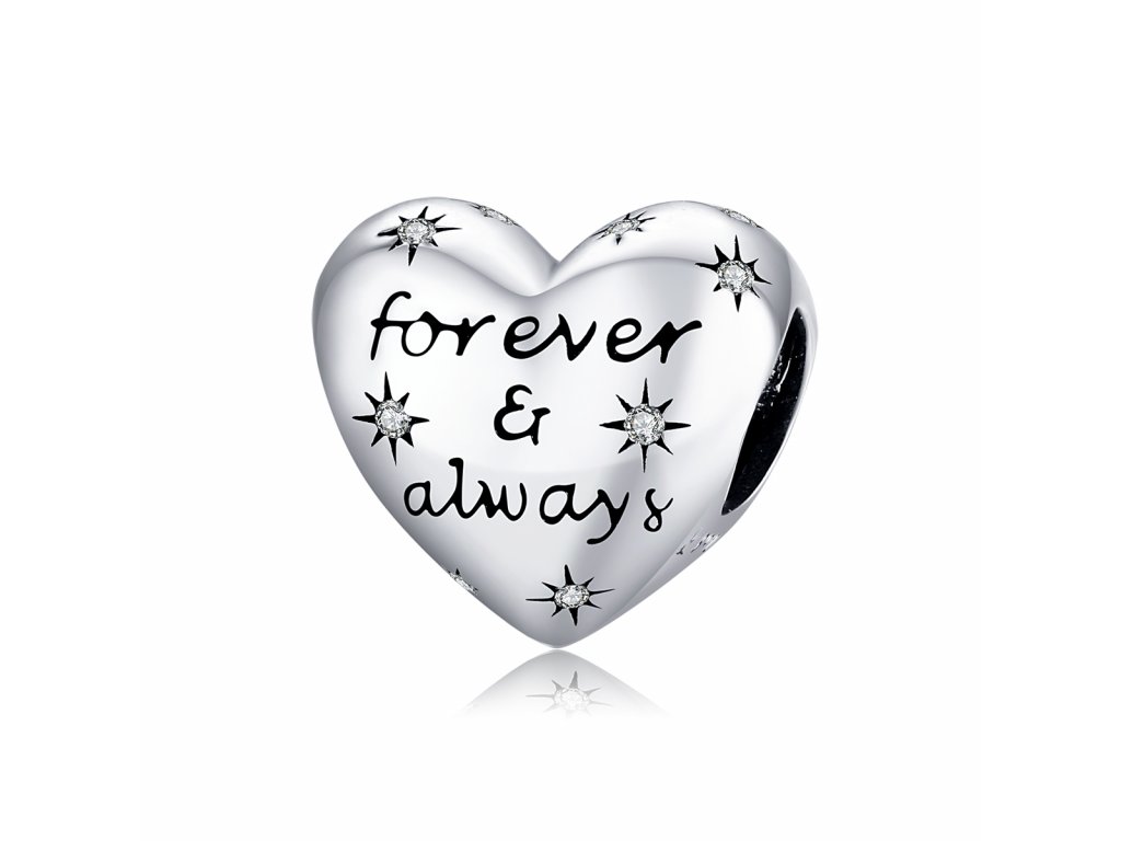 - Stříbrný přívěsek ve tvaru srdce zdobený anglickými nápisy "forever a always" v překladu "navždy a vždy". Přívěsek je také zdoben hvězdičkami s čirými třpytivými zirkony. Originální design přívěsku, kvalitní zpracování a materiál, ručně dohotovené.
