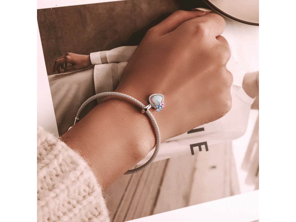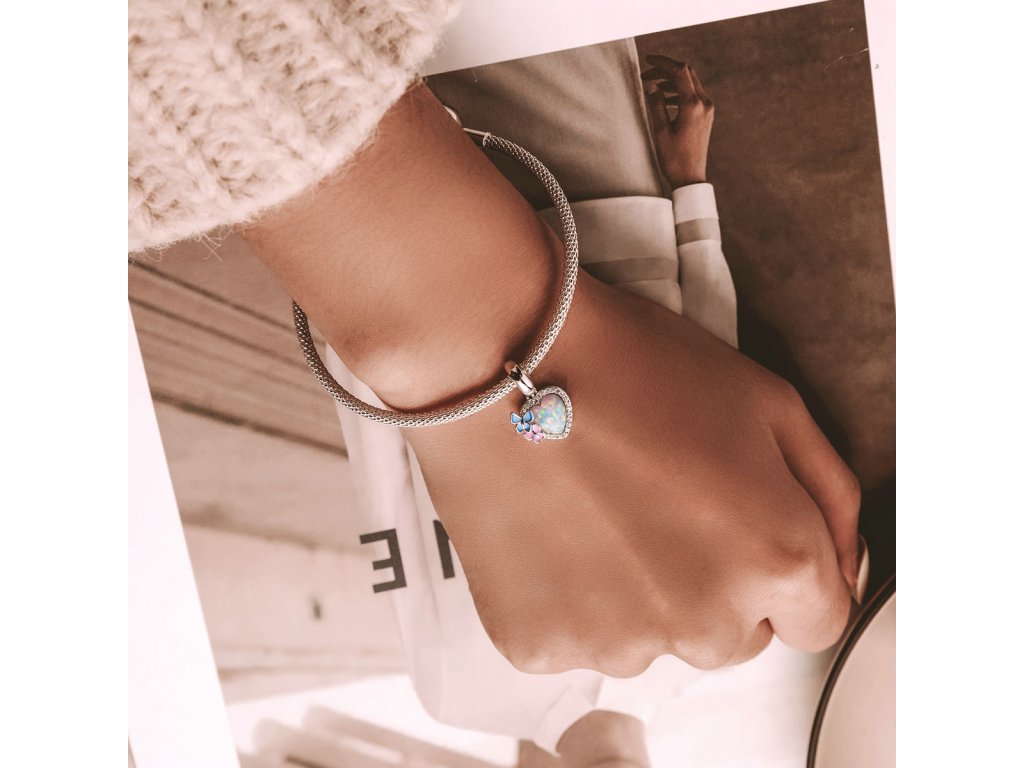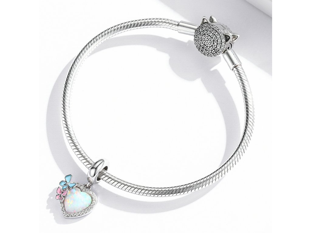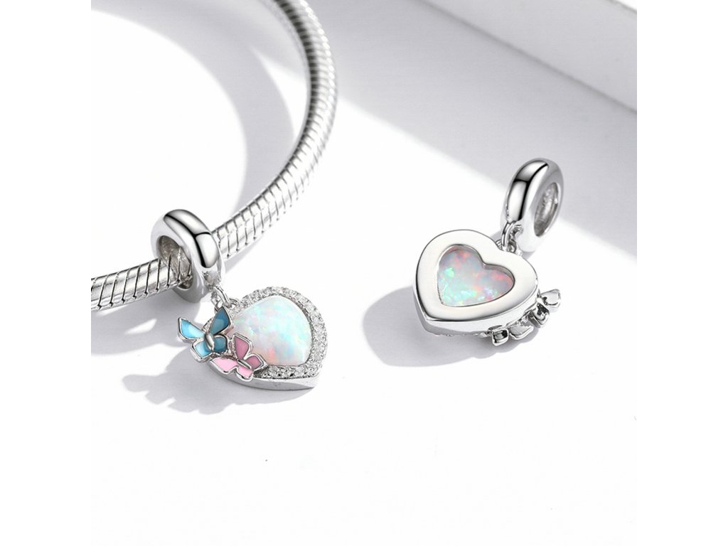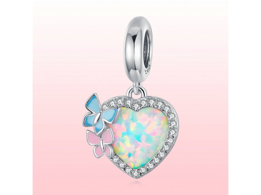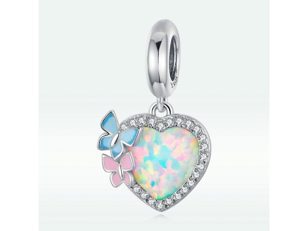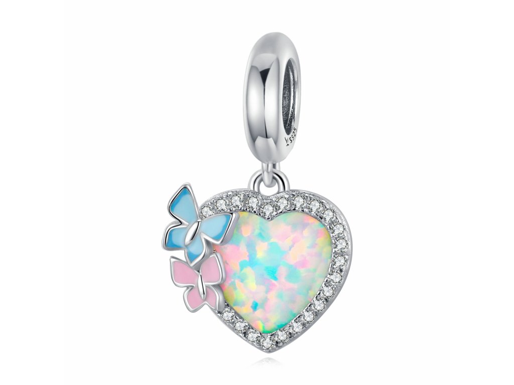 - Stříbrný visací přívěsek v designu opálového srdce zdobeného čirými třpytivými zirkony a motýlky tvořenými ručně nanášenou barevnou glazurou. Originální design přívěsku, kvalitní zpracování a materiál, ručně dohotovené.