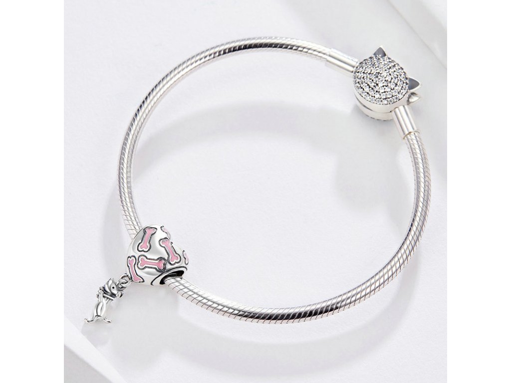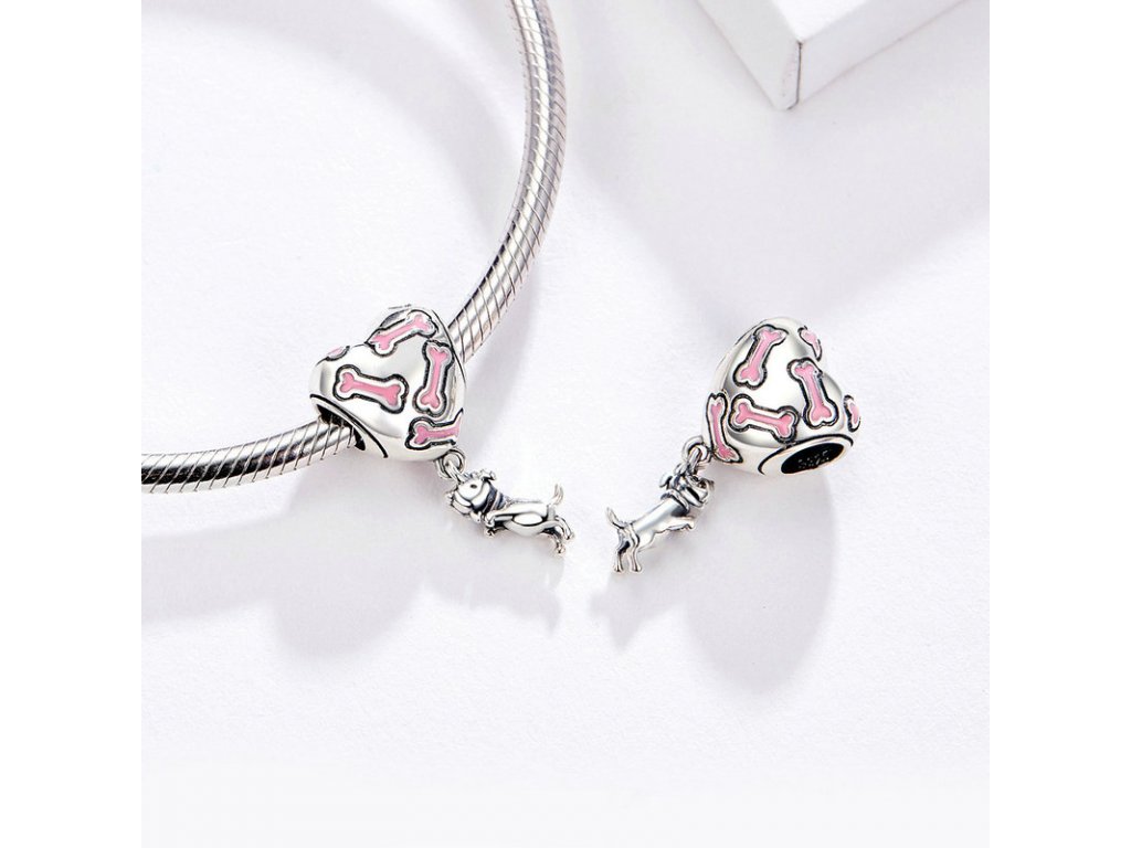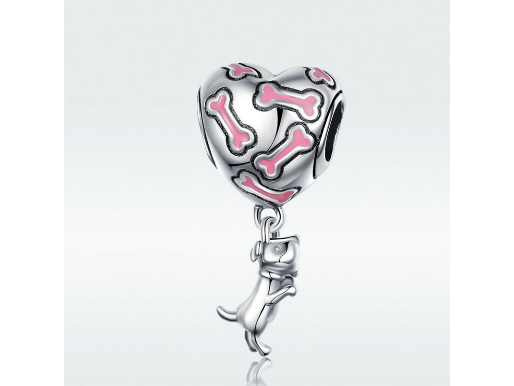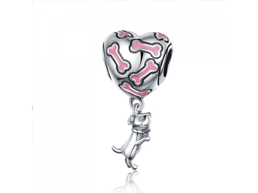 Stříbrný přívěsek v designu srdce s kostičkami zdobenými ručně nanášenou růžovou glazurou a visacím přívěskem ve tvaru pejska. Originální design přívěsku, kvalitní zpracování a materiál, ručně dohotovené.