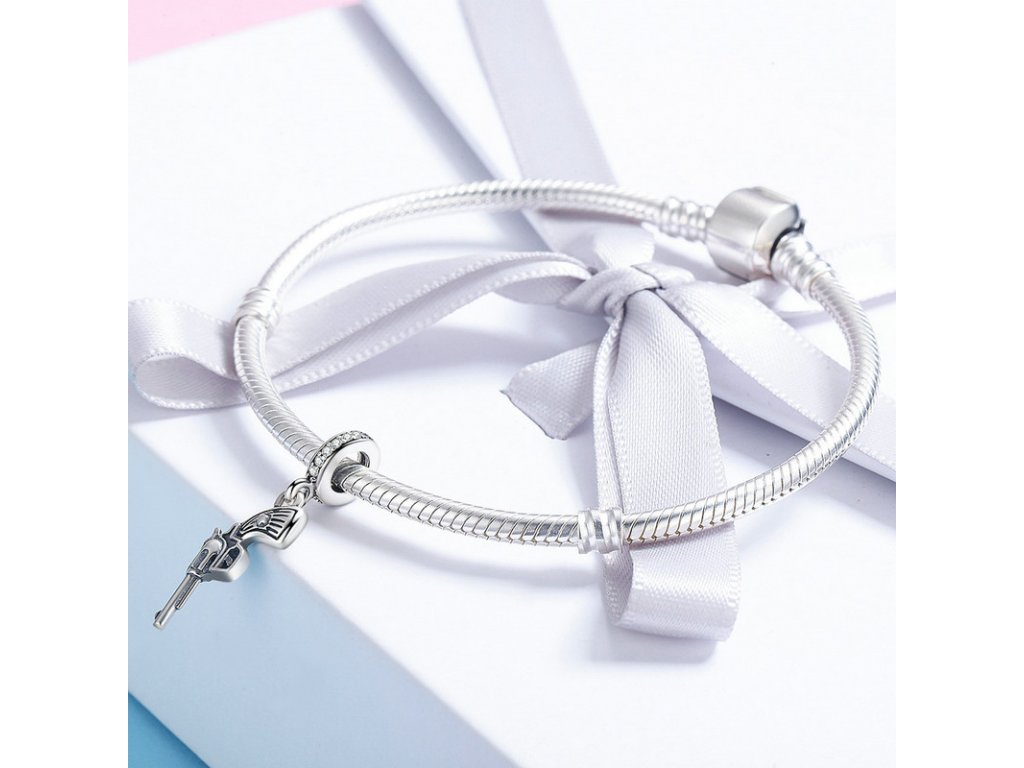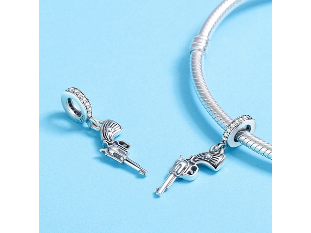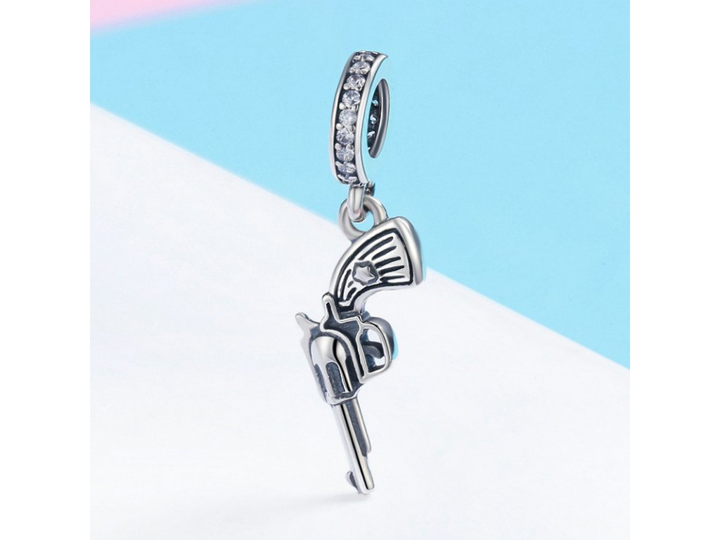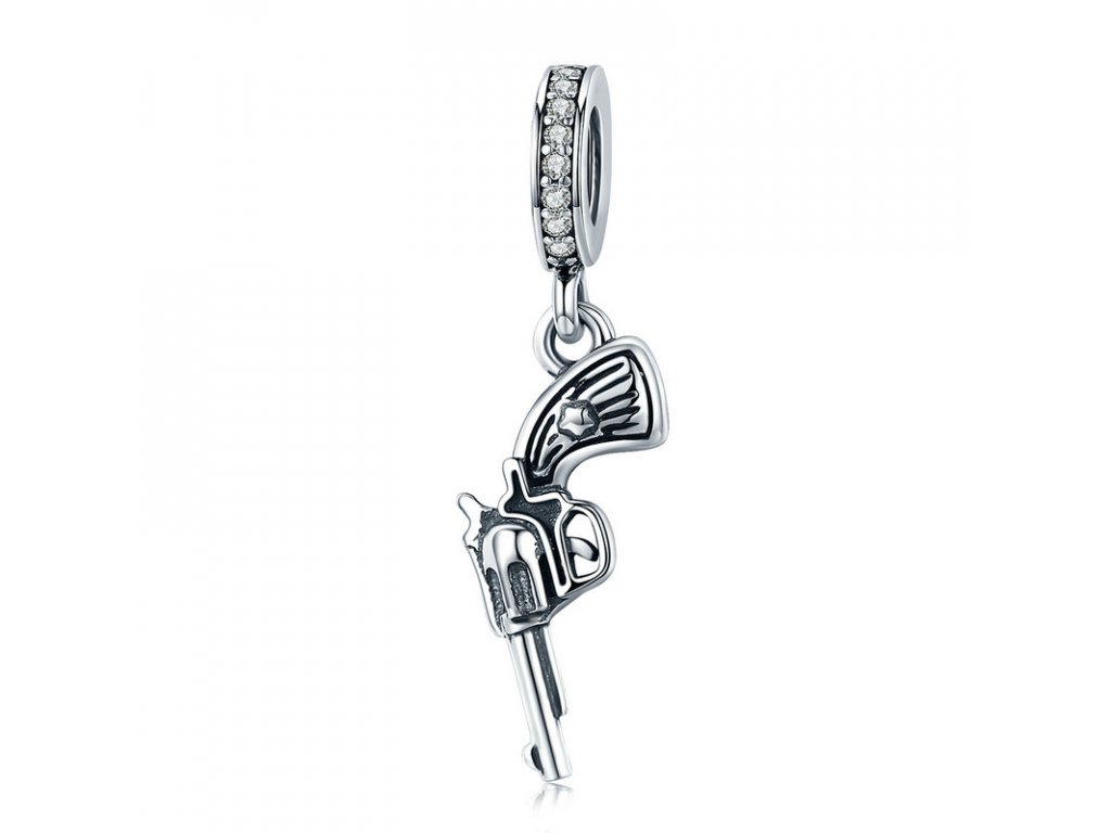 - Přívěsek v designu pistole zdobený třpytivými zirkony.