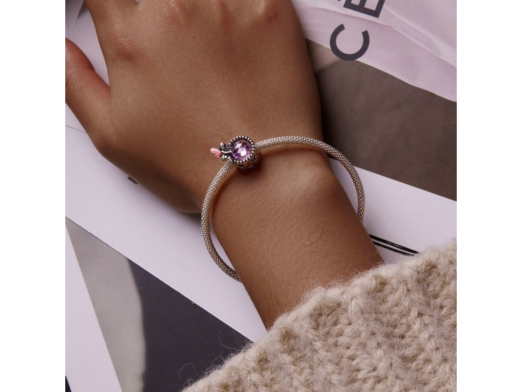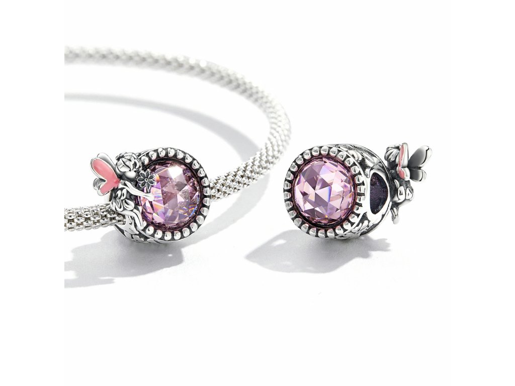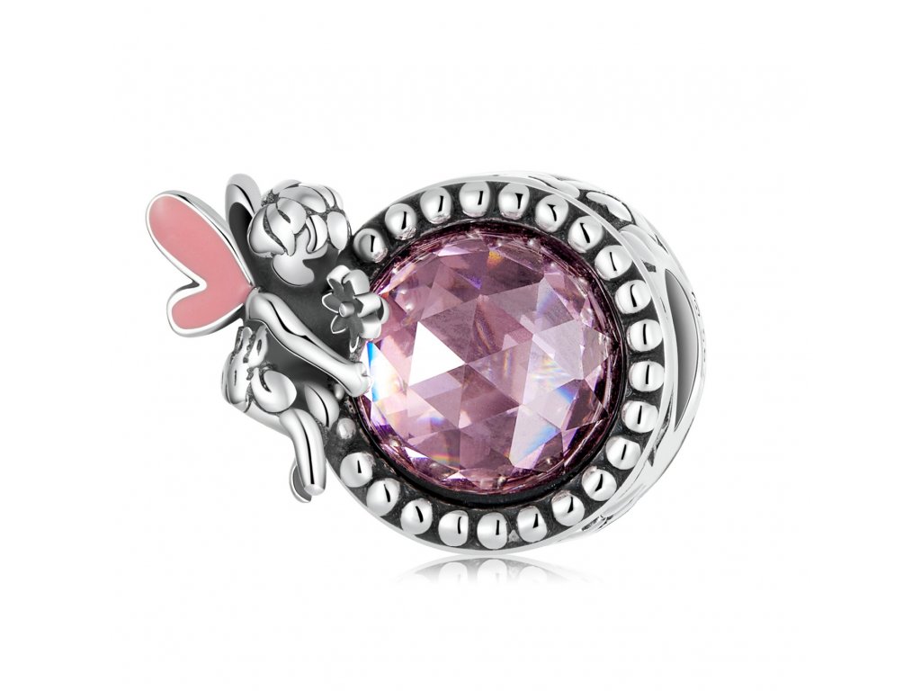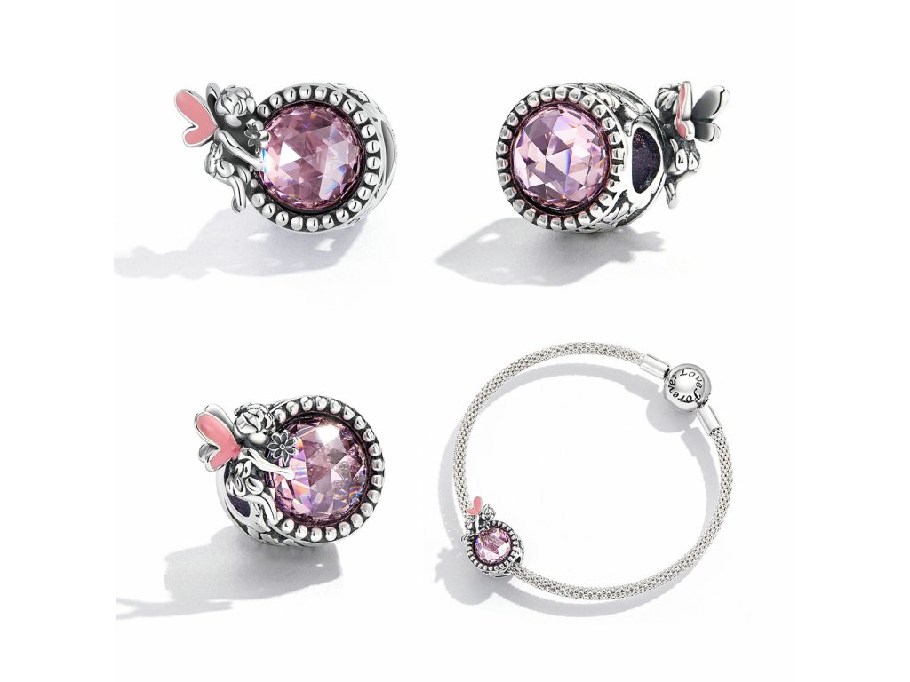 - Stříbrný přívěsek v designu luční víly s podkladem zdobeným čirými třpytivými zirkony a růžovým broušeným leštěným sklem. Originální design přívěsku, kvalitní zpracování a materiál, ručně dohotovené.