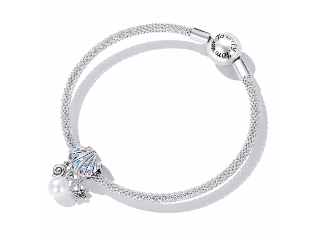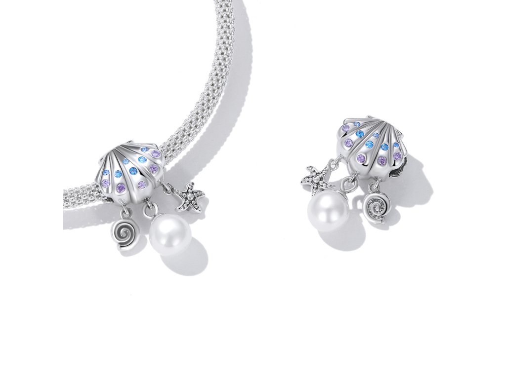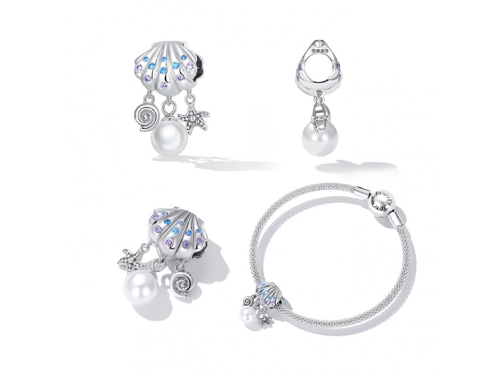 - Stříbrný přívěsek v designu pokladů moře tvořených ze třpytivé mušle, šneka, jemné perly a hvězdice. Originální design přívěsku, kvalitní zpracování a materiál, ručně dohotovené.