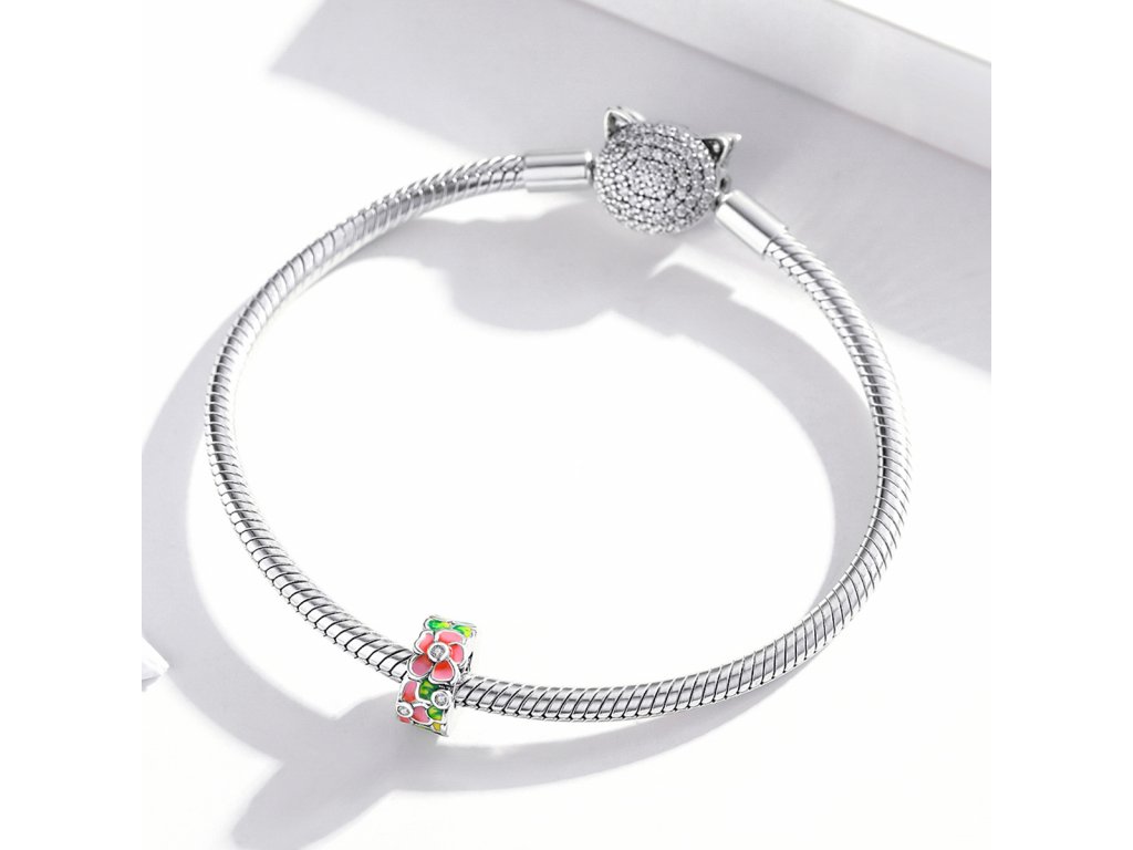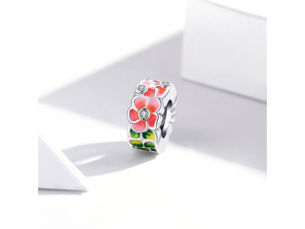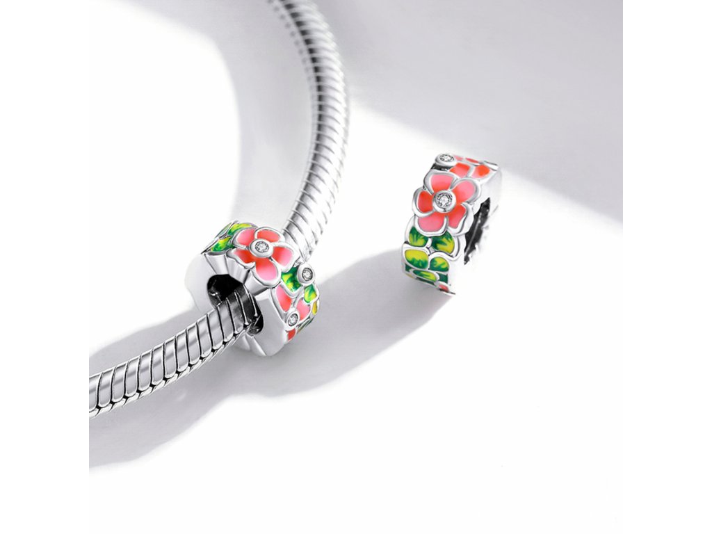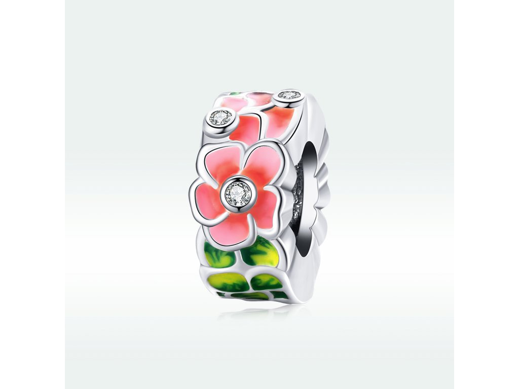 - Stříbrný přívěsek nebol-li spacer v designu květin zdobených čirými třpytivými zirkony a ručně nanášenou barevnou glazurou. Originální design přívěsku, kvalitní zpracování a materiál, ručně dohotovené.