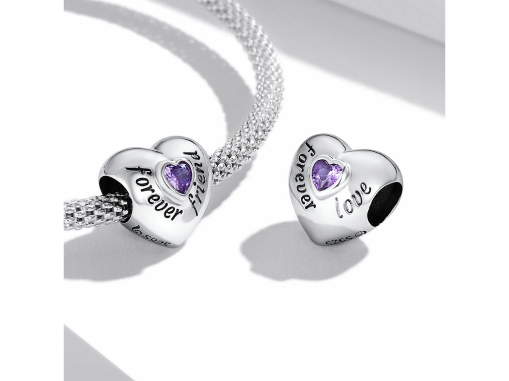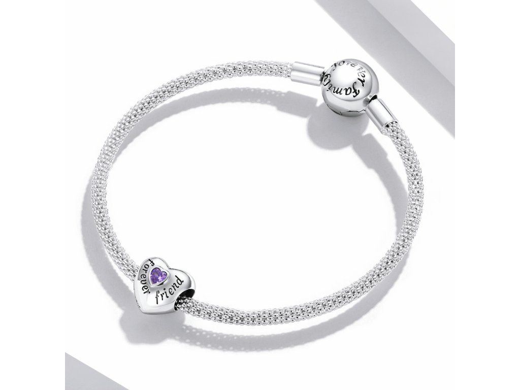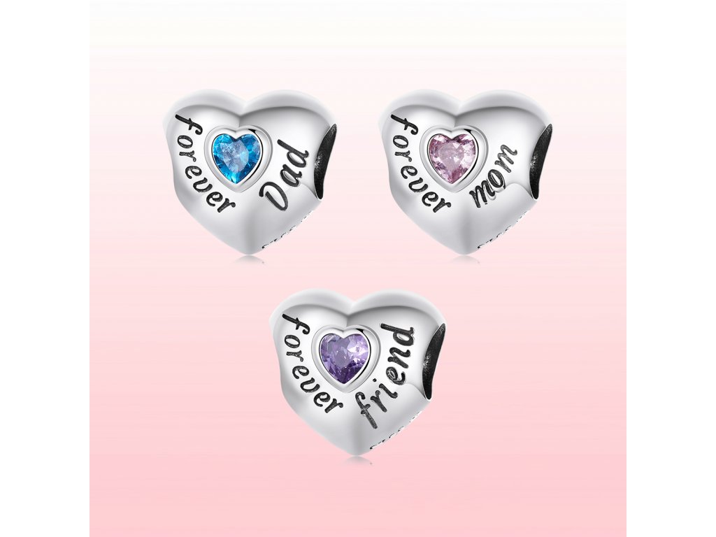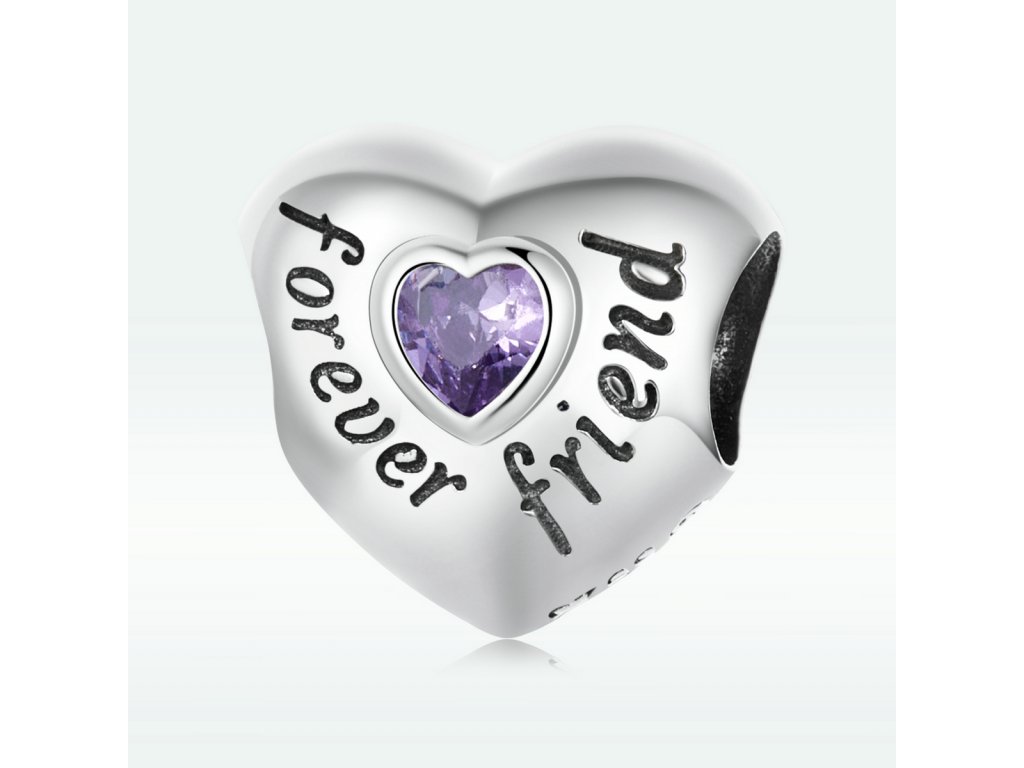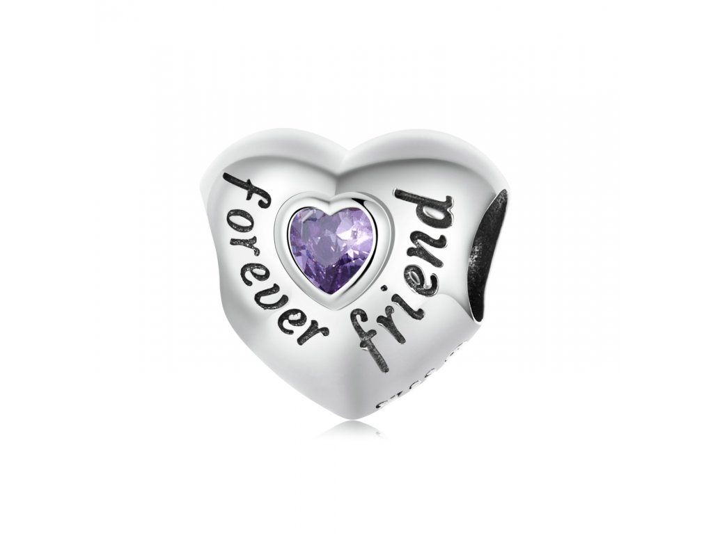 - Stříbrný přívěsek ve tvaru srdce zdobený fialovým broušeným zirkonem a anglickým nápisem "forever friend" a z druhé strany "forever love" v překladu "navždy přítel" "navždy láska". Originální design přívěsku, kvalitní zpracování a materiál, ručně dohotovené.