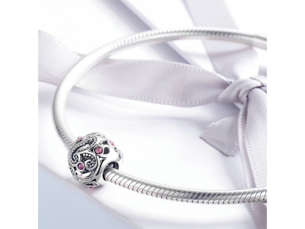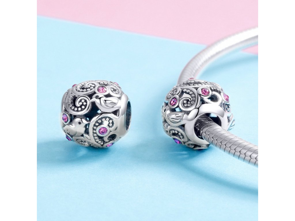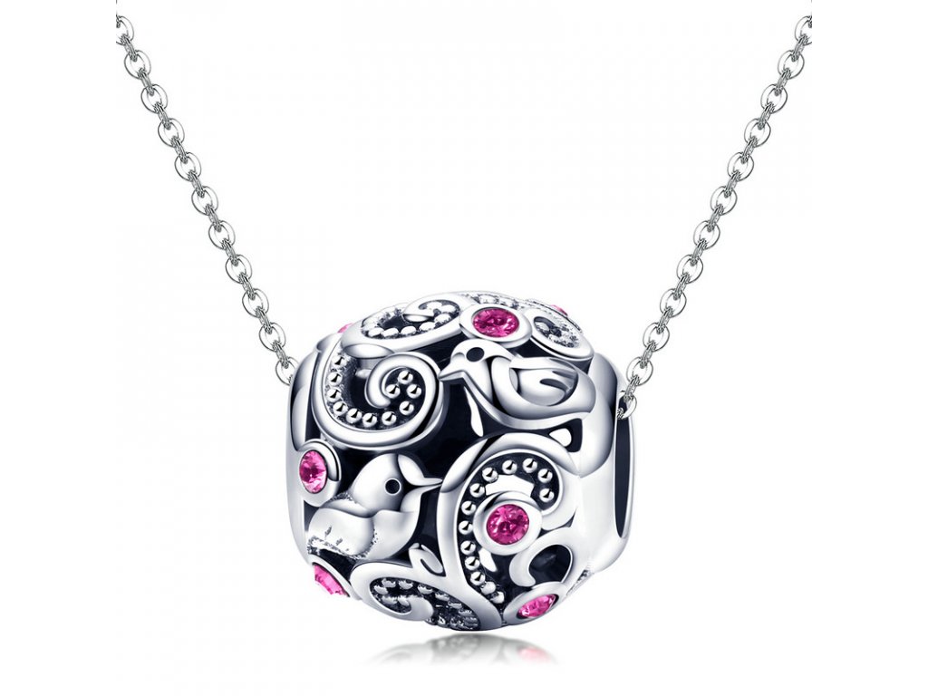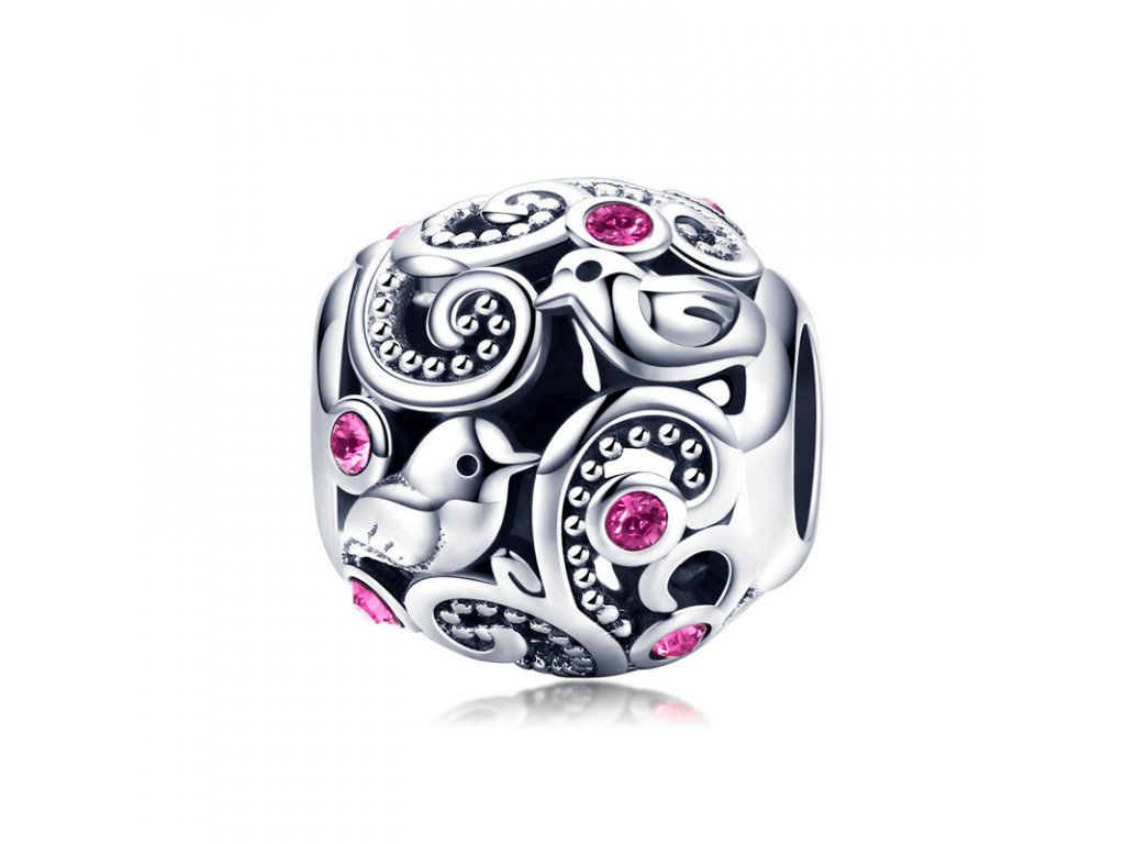Krásný stříbrný korálek kulatého tvaru obohacený ptáčky a zirkony růžové barvy. Originální design přívěsku, kvalitní zpracování a materiál, ručně dohotovené.
