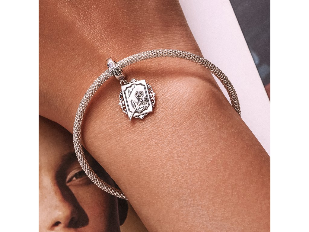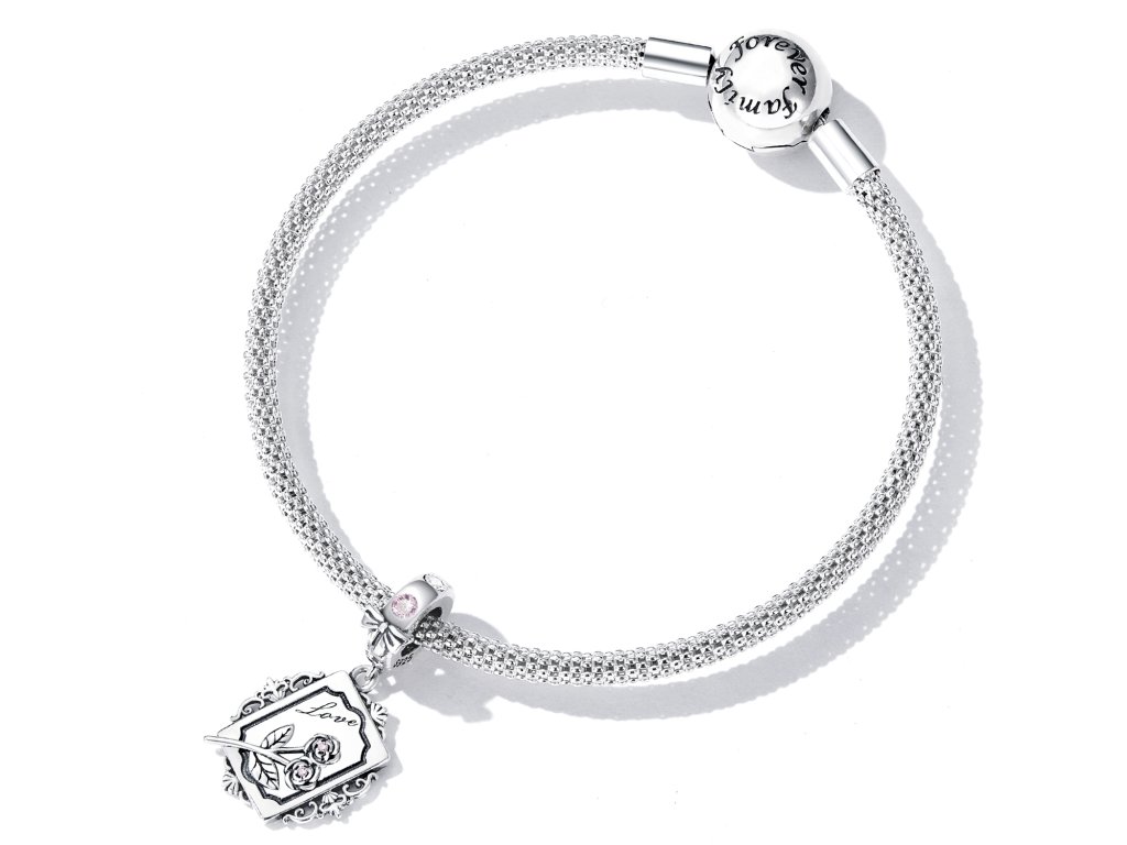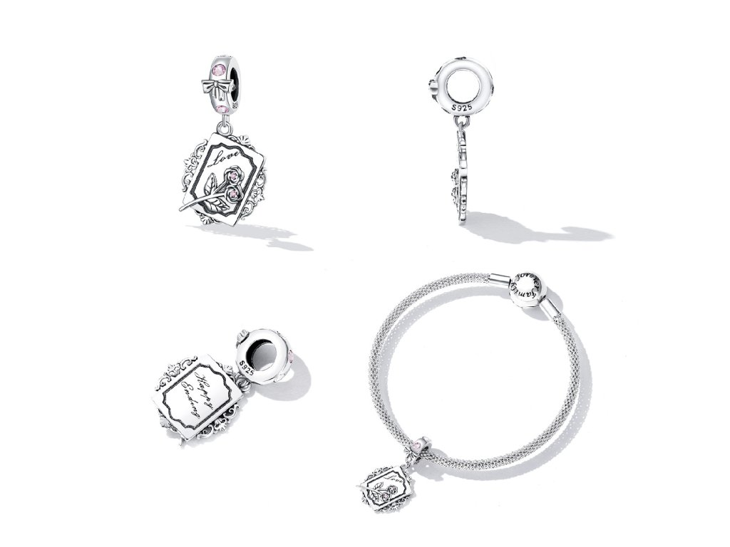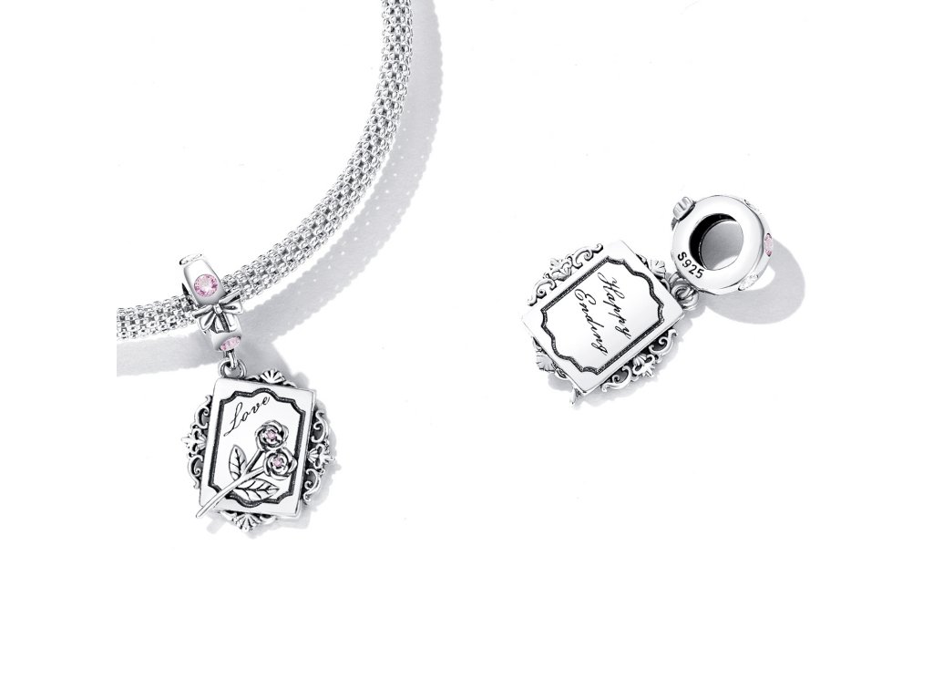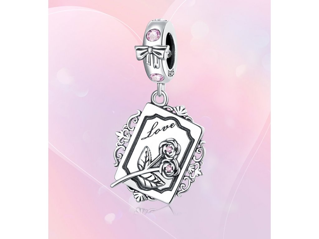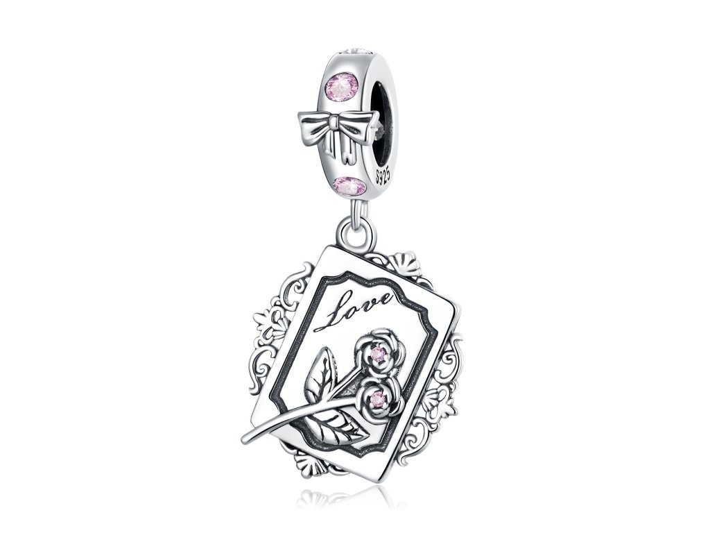 - Stříbrný visací přívěsek v designu romantického deníku zdobeného krásnou růží a třpytivými růžovými zirkony. Přívěsek je také obohacený anglickými nápisy "Love" a "Happy ending" v překladu "Láska" a "Šťastný konec". Originální design přívěsku, kvalitní zpracování a materiál, ručně dohotovené.
