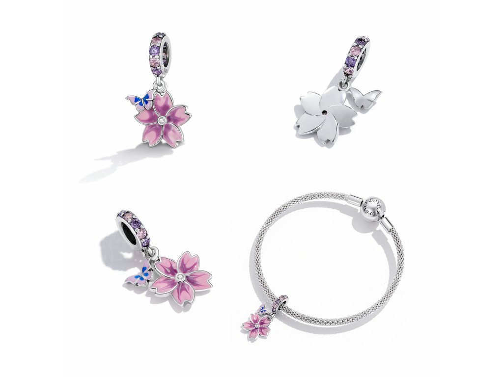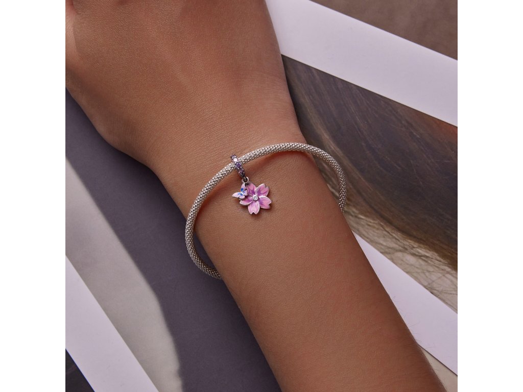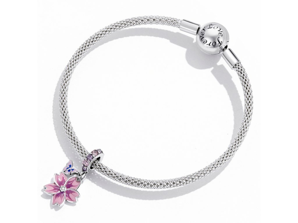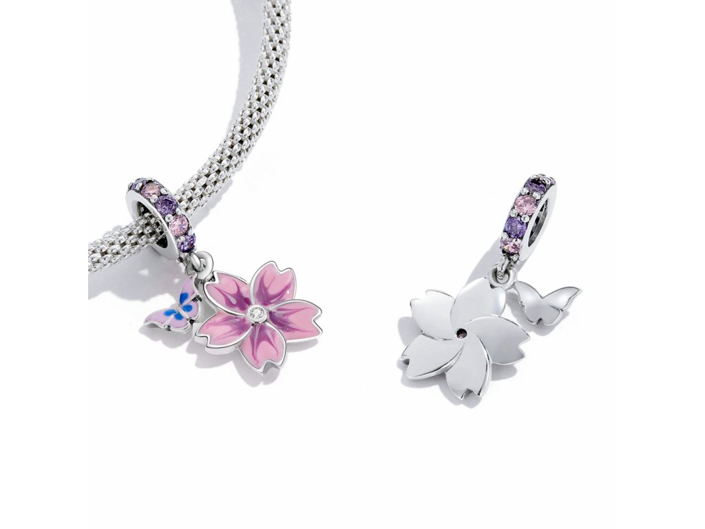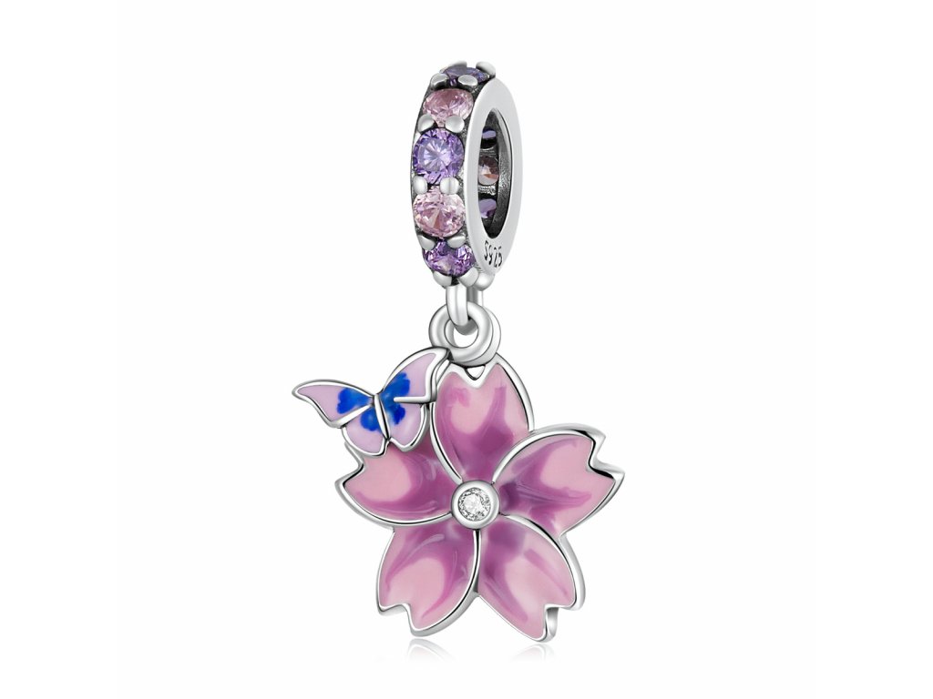 - Stříbrný visací přívěsek v designu krásného motýlka a rozkvetlého květu zdobeného ručně nanášenou růžovo-fialovou glazurou. Přívěsek je také obohacen třpytivými čirými, růžovými a fialovými zirkony. Originální design přívěsku, kvalitní zpracování a materiál, ručně dohotovené.