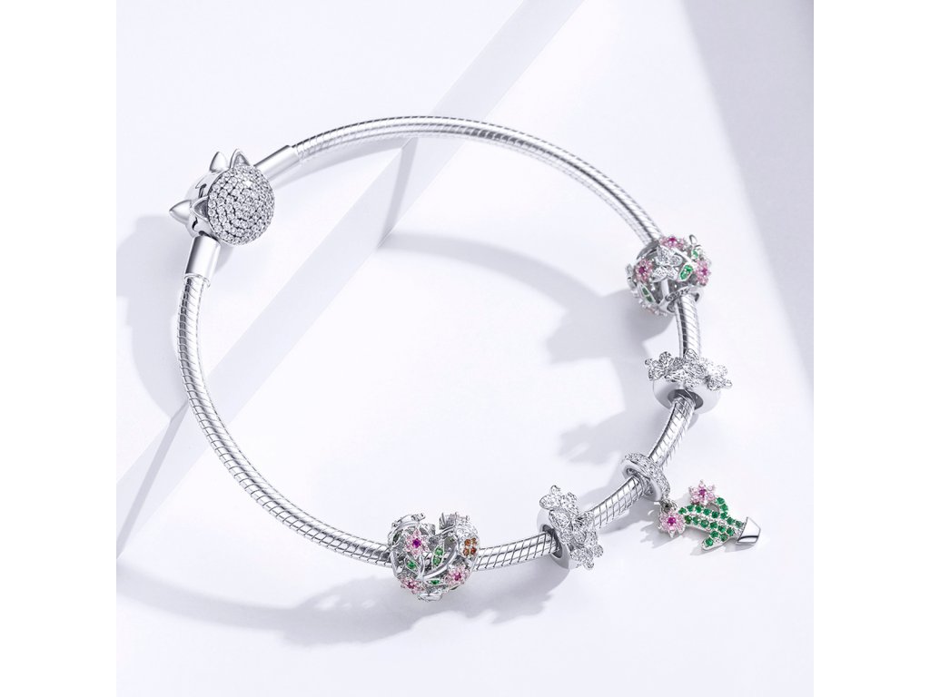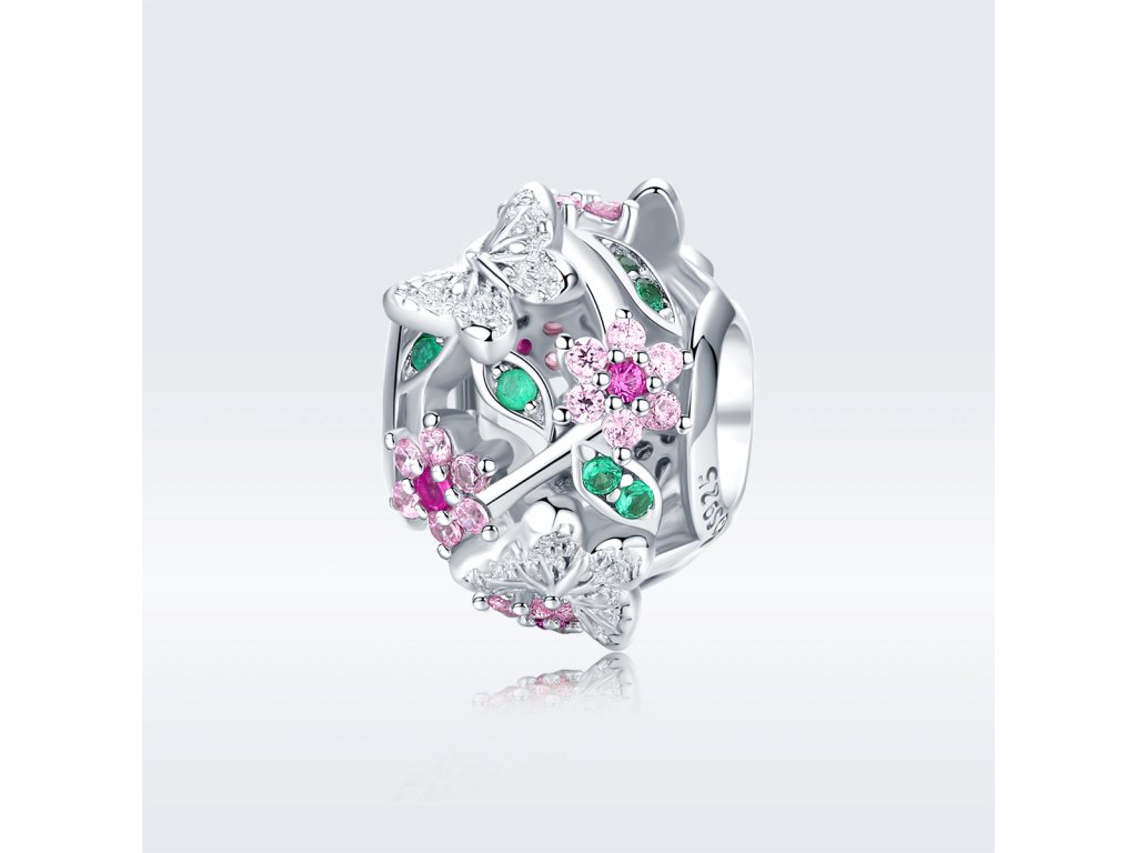 - Stříbrný přívěsek / korálek v designu Rozkvetlé louky zdobený motýlky, růžovými květy a lístky s barevnými zirkony. Originální design přívěsku, kvalitní zpracování a materiál, ručně dohotovené.