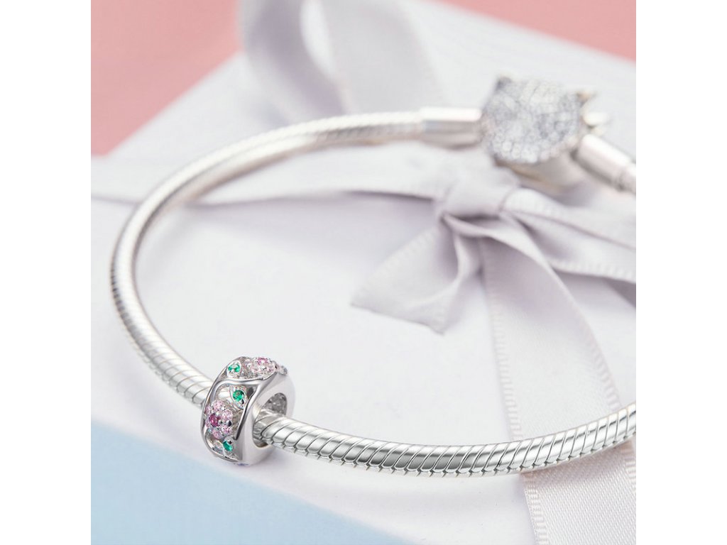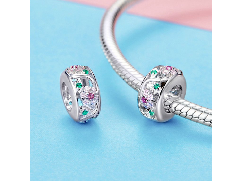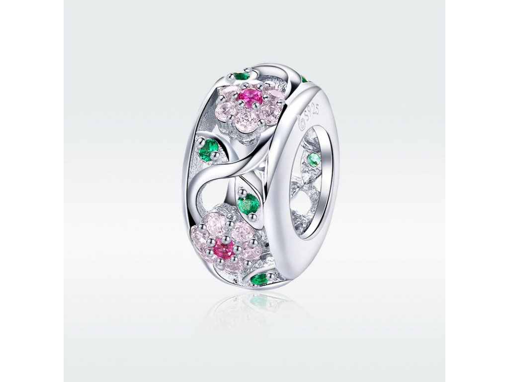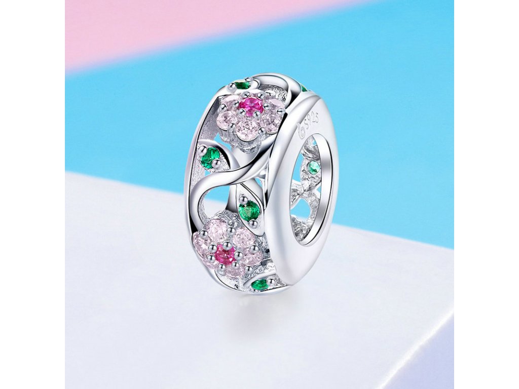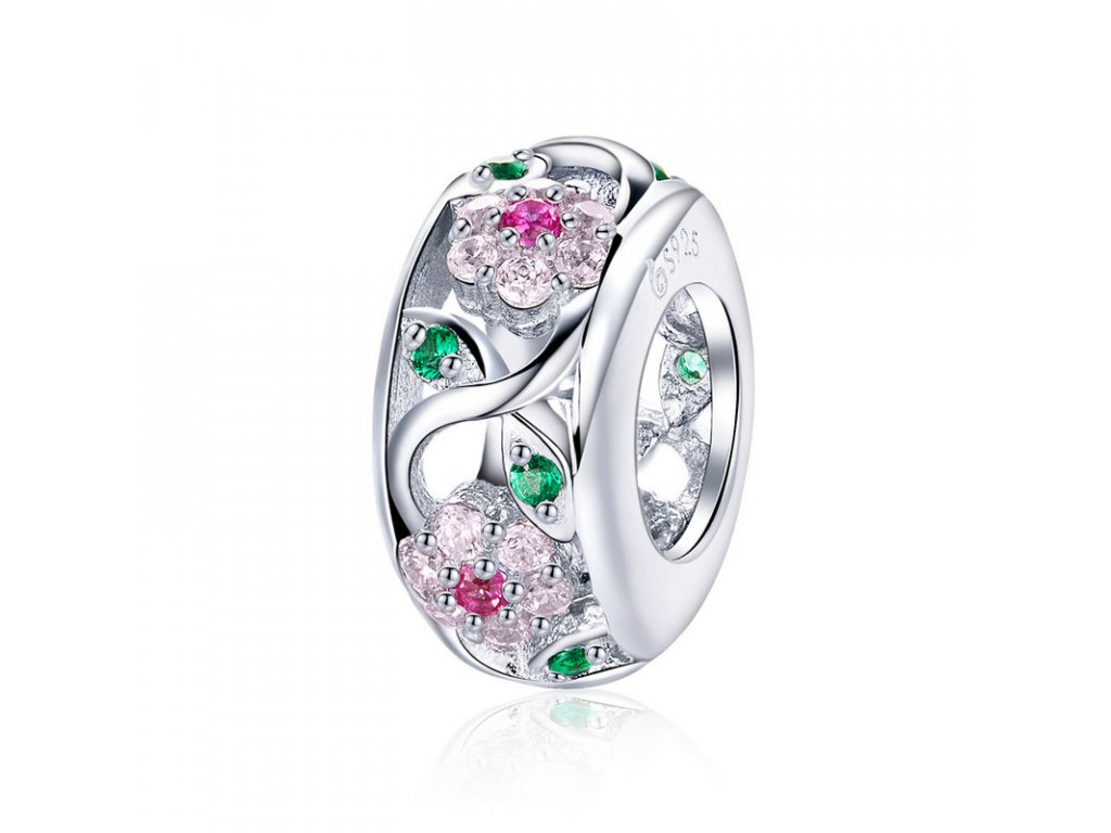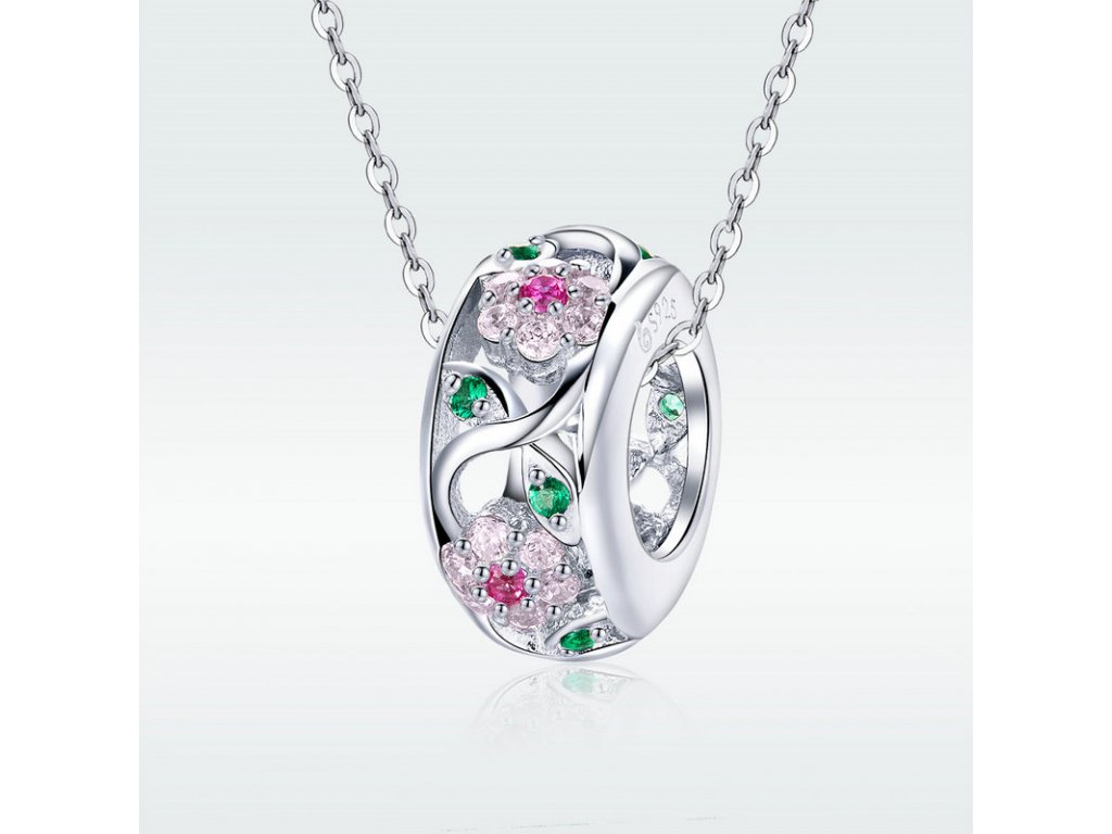 - Stříbrný propracovaný přívěsek v designu Rozkvetlé přírody zdobený růžovými a zelenými kameny v podobě třpytivých zirkonů. Originální design přívěsku, kvalitní zpracování a materiál, ručně dohotovené.