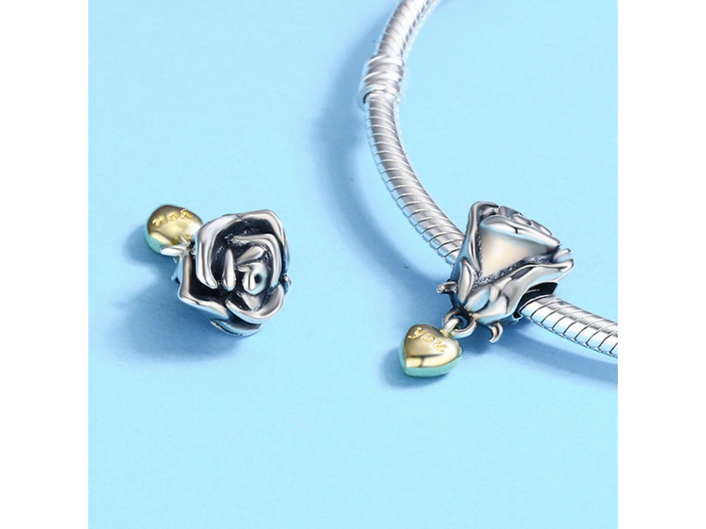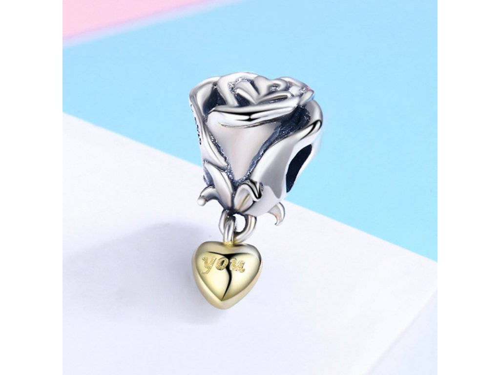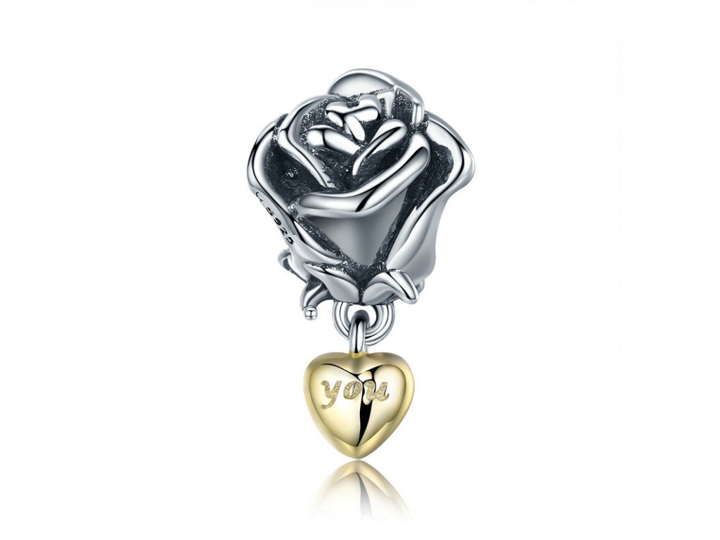 Luxusní a propracovaný přívěsek v designu krásné rozkvetlé růže a menším srdíčkem s anglickým nápisem "You" v překladu "Ty".