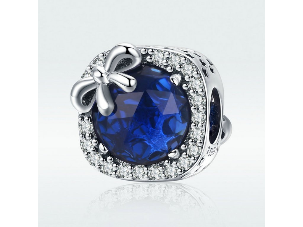 Luxusní stříbrný přívěsek / korálek se zirkony v designu safírového dárečku, který je po svém obvodu zdoben krajkou s vyřezávanými hvězdičkami. Originální design přívěsku, kvalitní zpracování a materiál, ručně dohotovené.