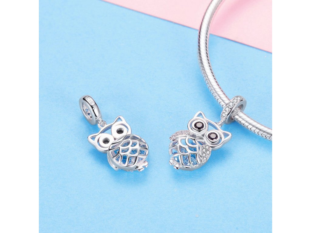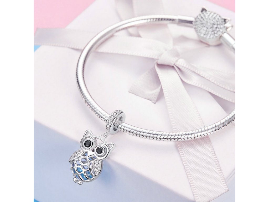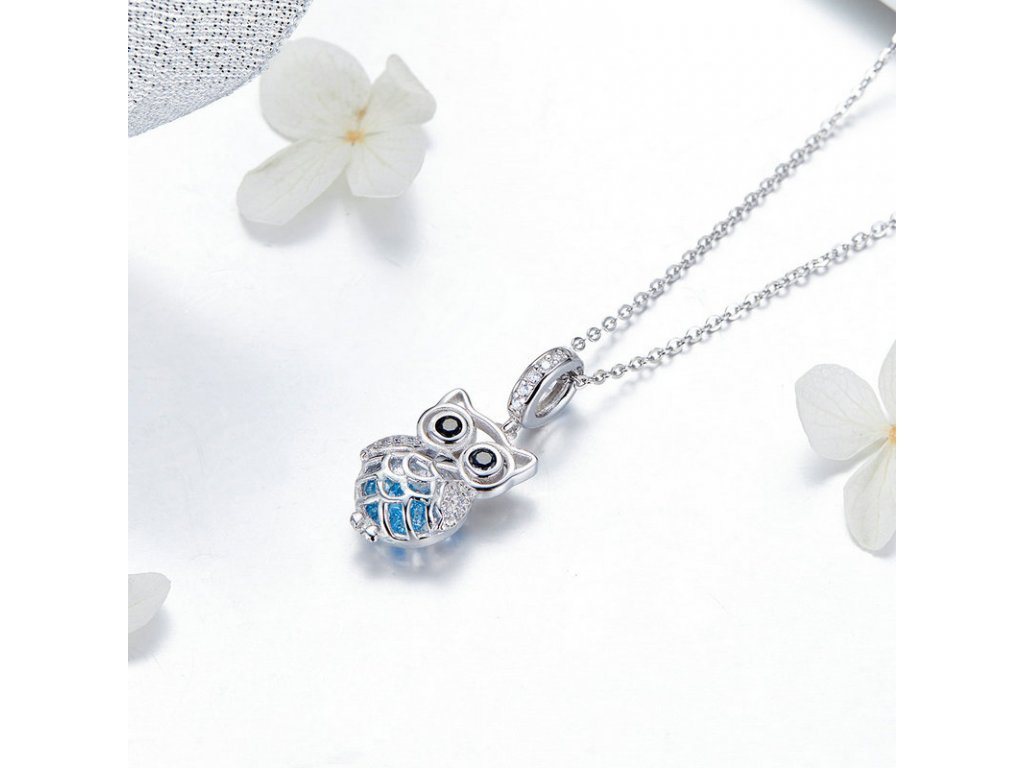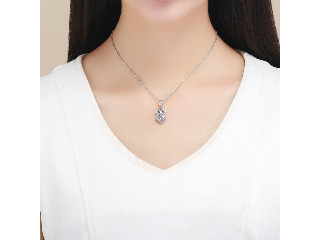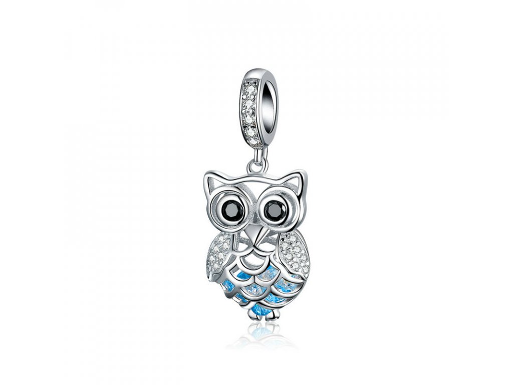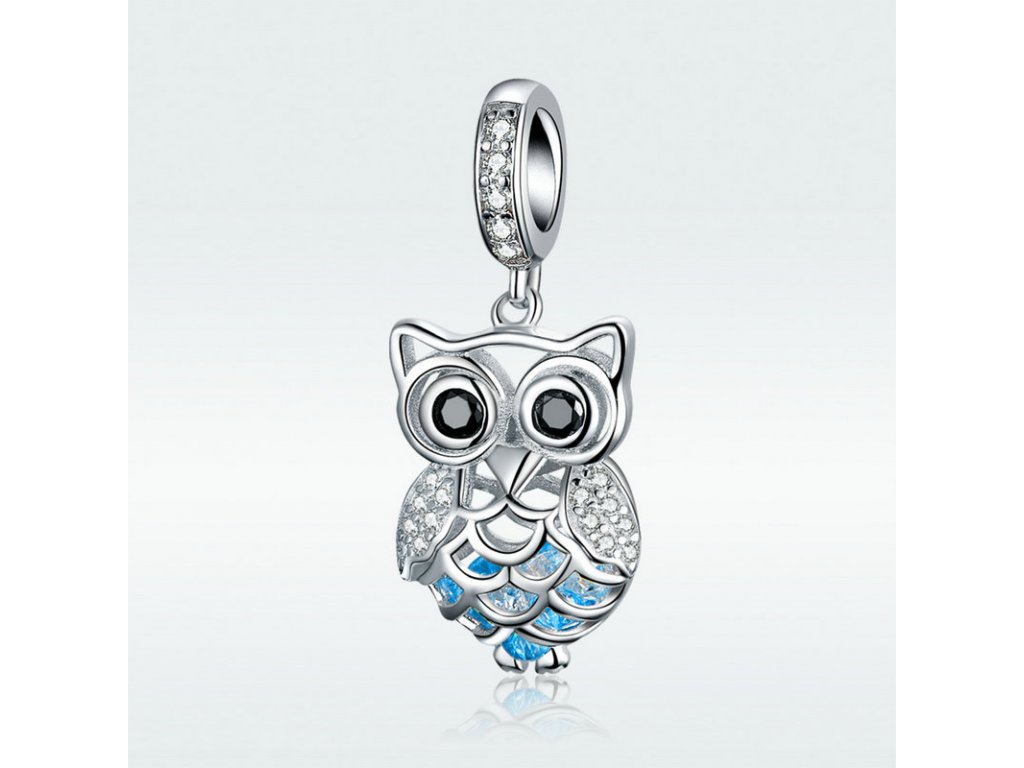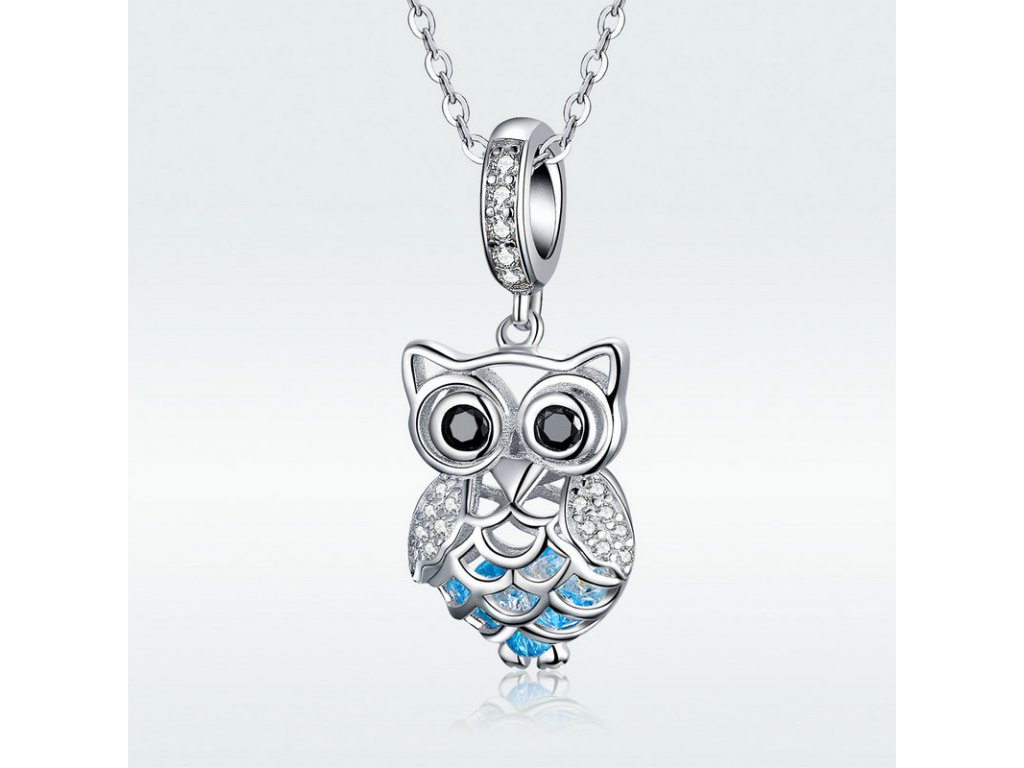 Krásný a propracovaný stříbrný visací přívěsek zobrazující půvabnou sovu zdobenou zirkony čiré a černé barvy, která v sobě ukrývá poklad v podobě modrých zirkonů. Originální design přívěsku, kvalitní zpracování a materiál, ručně dohotovené.