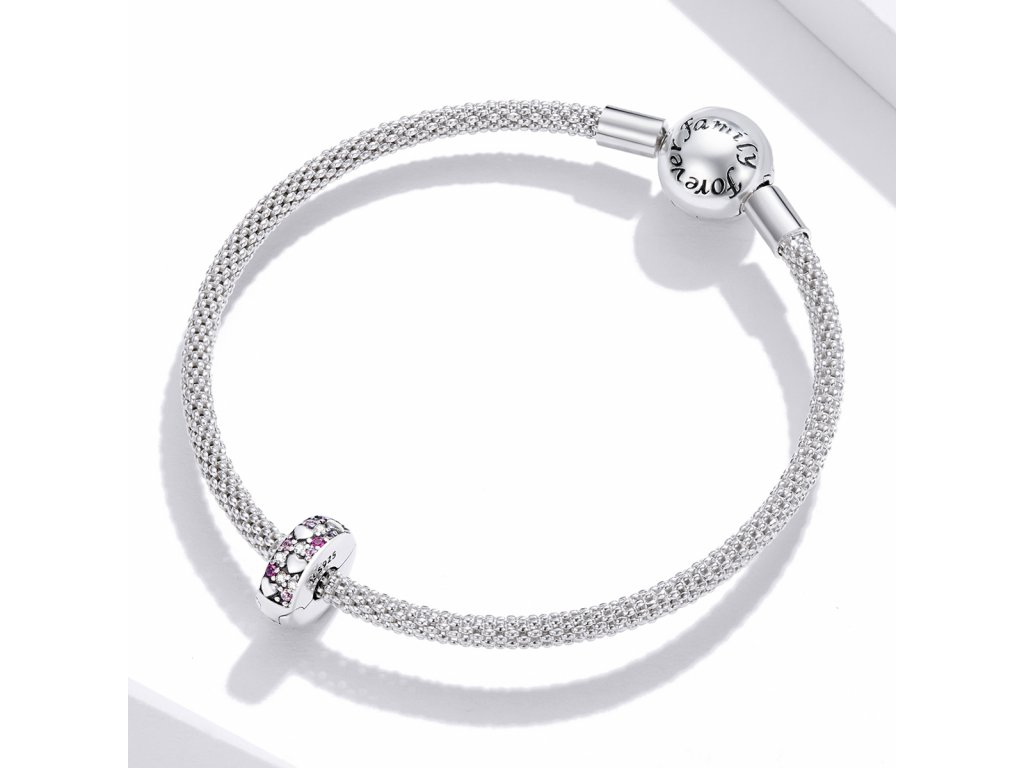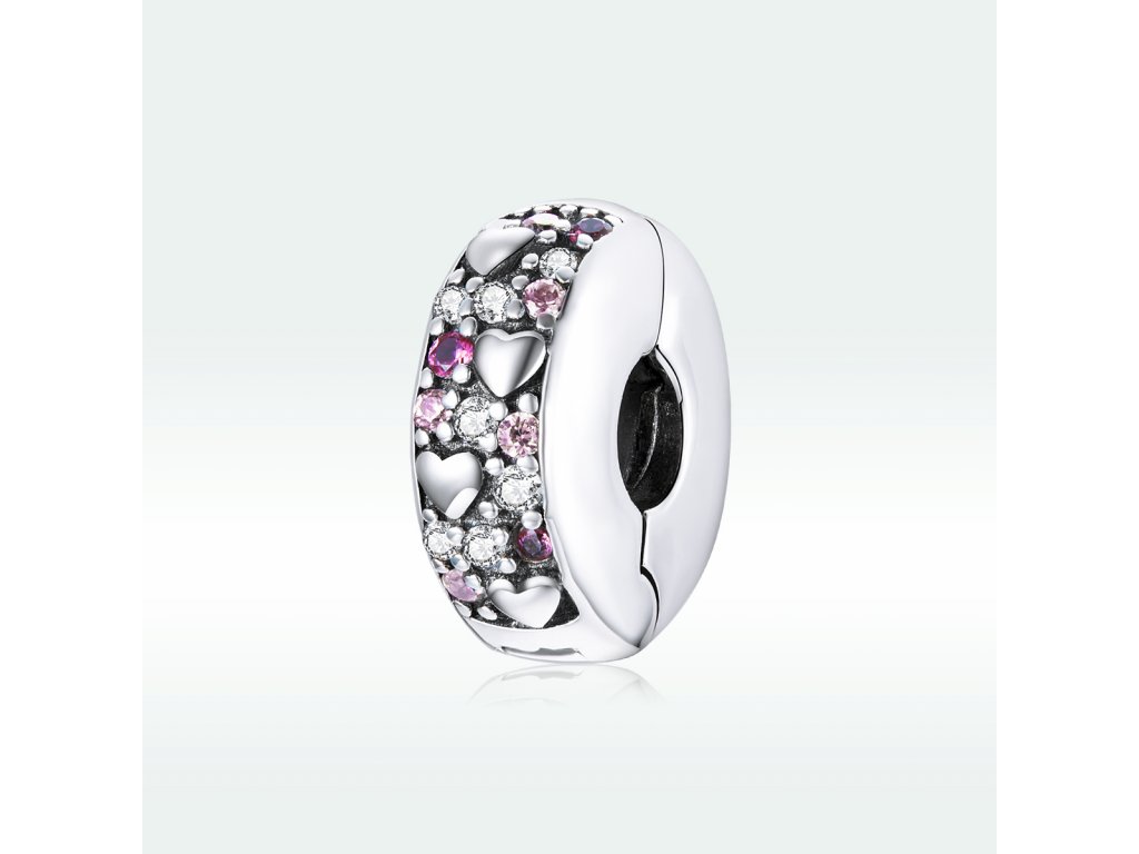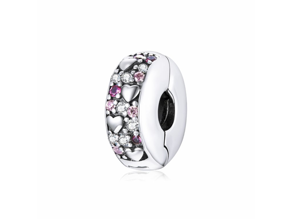 - Stříbrný přívěsek / spacer v designu Zářivé lásky zdobený růžovými a čirými kameny v podobě třpytivých zirkonů. Přívěsek je také zdoben lesklými miniaturními milovanými srdíčky. Originální design přívěsku, kvalitní zpracování a materiál, ručně dohotovené.