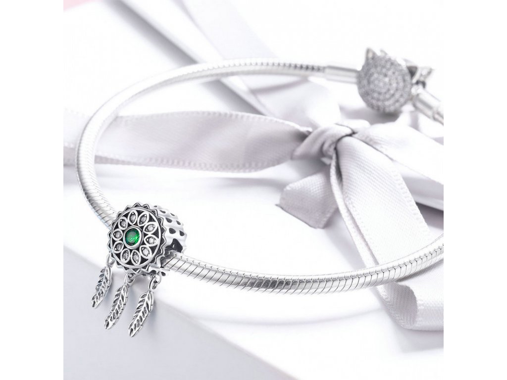 Luxusní a propracovaný stříbrný přívěsek v designu spirituálního lapače snů zdobený zirkony.