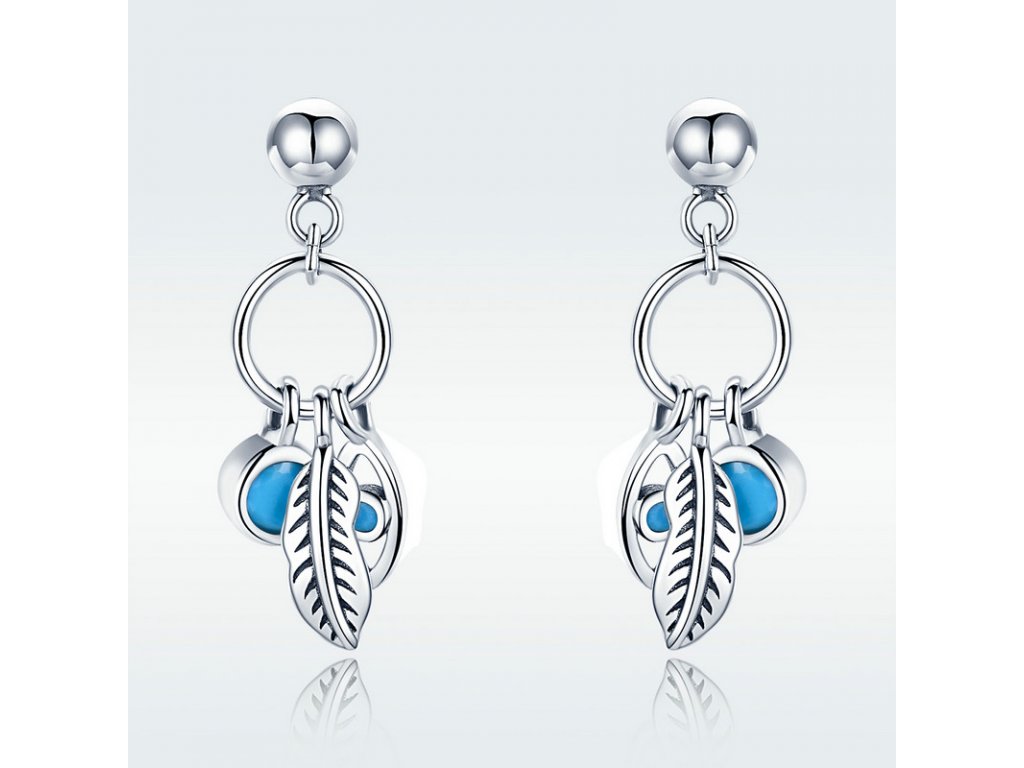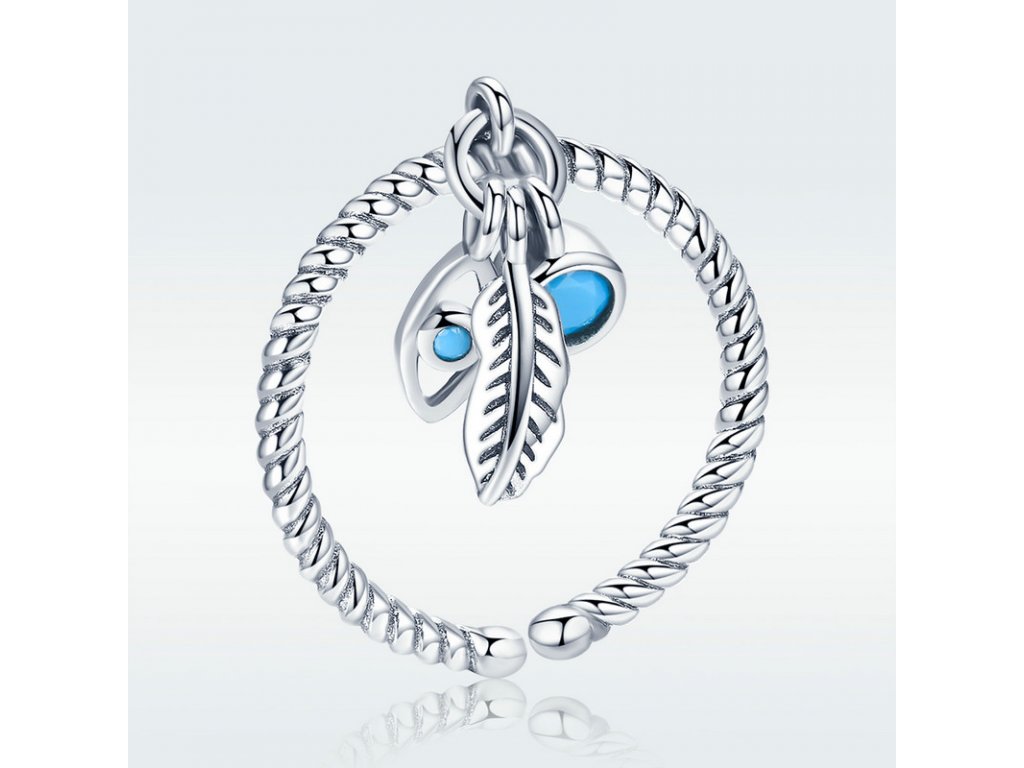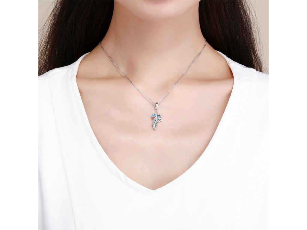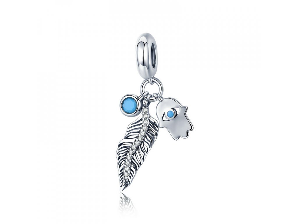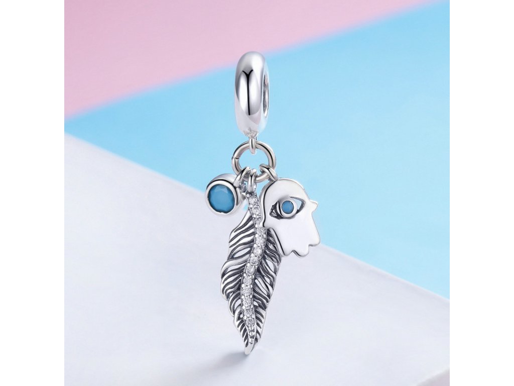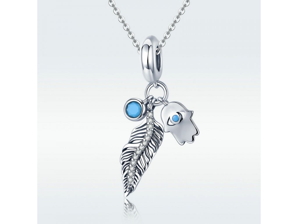 Luxusní a propracovaný visací stříbrný přívěsek v designu spirituálního pírka zdobený zirkony.