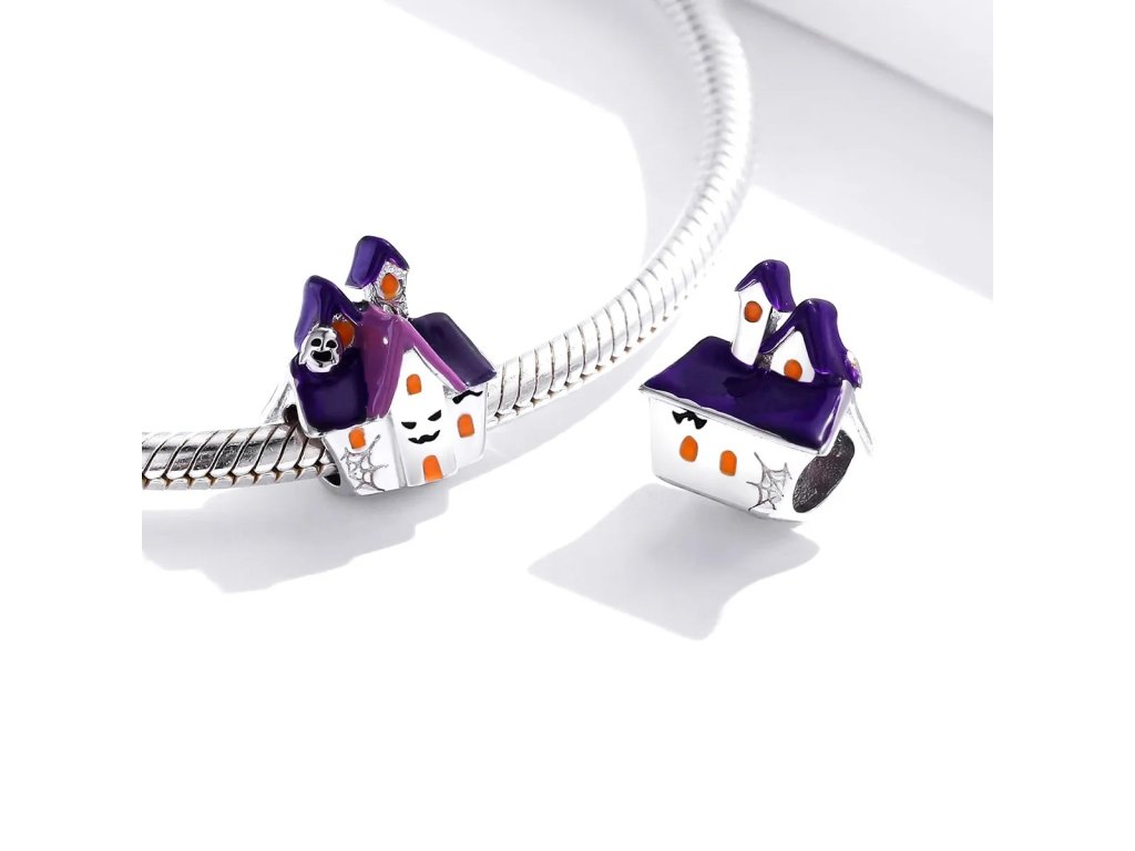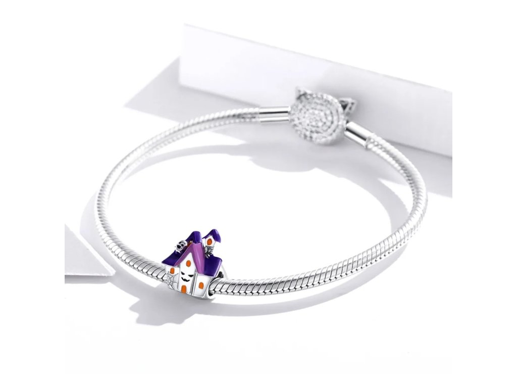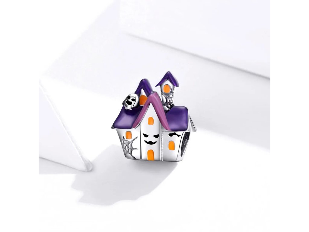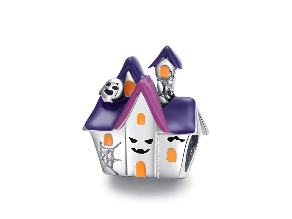 - Stříbrný přívěsek z kolekce Halloween. Přívěsek v designu strašidelného domu je detailně zdobený ručně nanášenou barevnou glazurou.