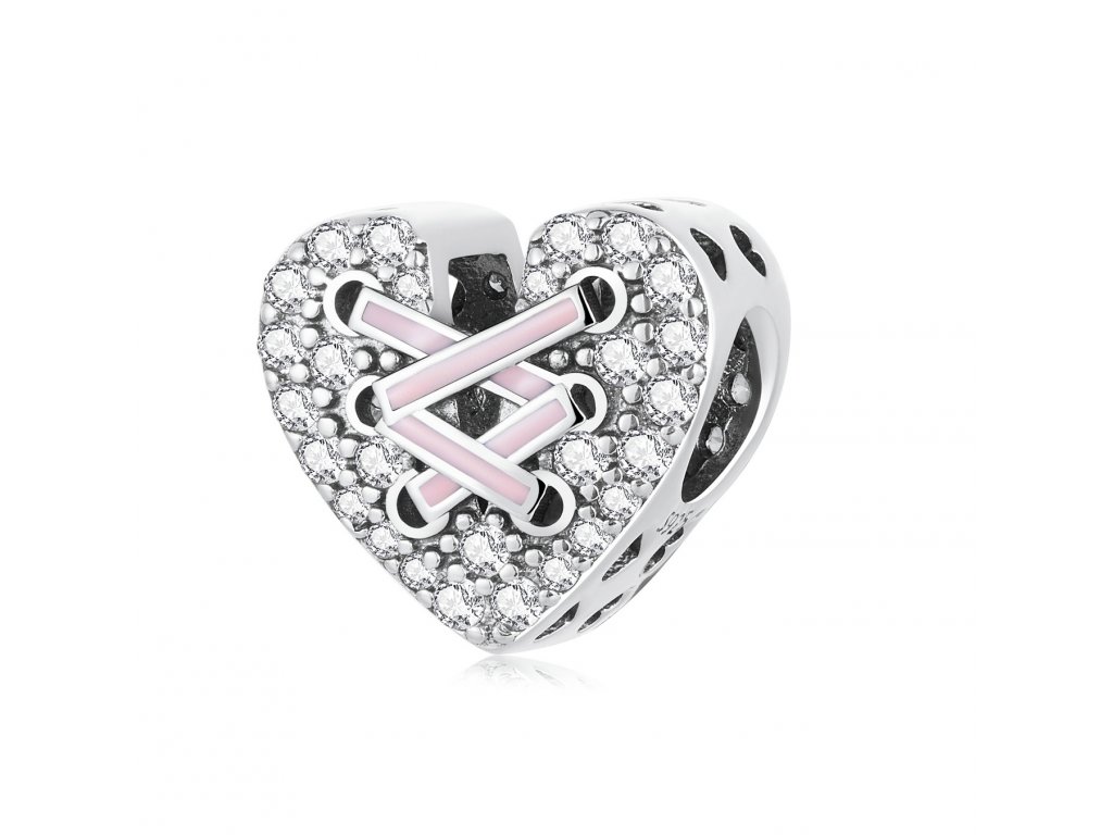 - Stříbrný přívěsek ve tvaru srdce se stuhou zdobený čirými třpytivými zirkony a ručně nanášenou růžovou glazurou. Přívěsek je také zdoben ručně vyřezávanými milovanými srdíčky po stranách. Originální design přívěsku, kvalitní zpracování a materiál, ručně dohotovené.