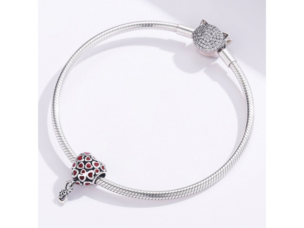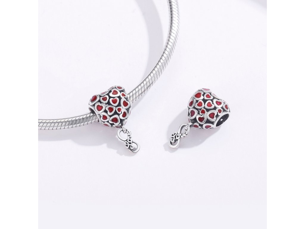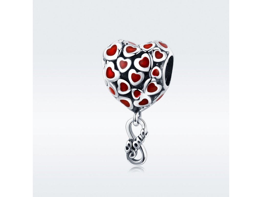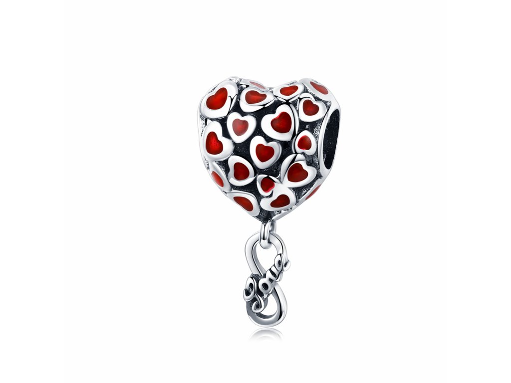 Stříbrný přívěsek v designu Pouta nekonečné lásky ve tvaru srdce zdobeného ručně nanášenou červenou glazurou a přívěskem v podobě symbolu nekonečna s anglickým nápisem "Love" v překladu "Láska". Originální design přívěsku, kvalitní zpracování a materiál, ručně dohotovené.