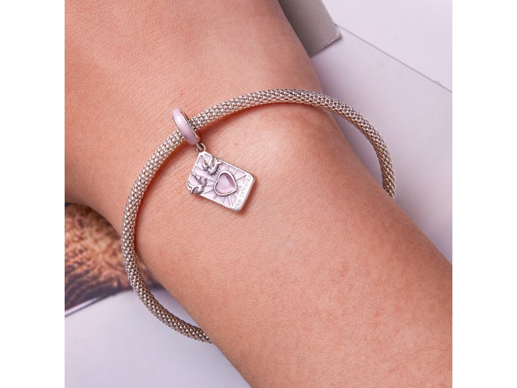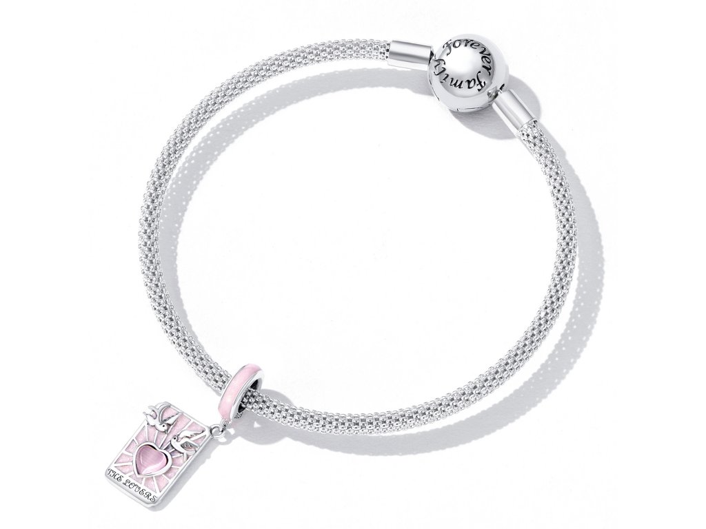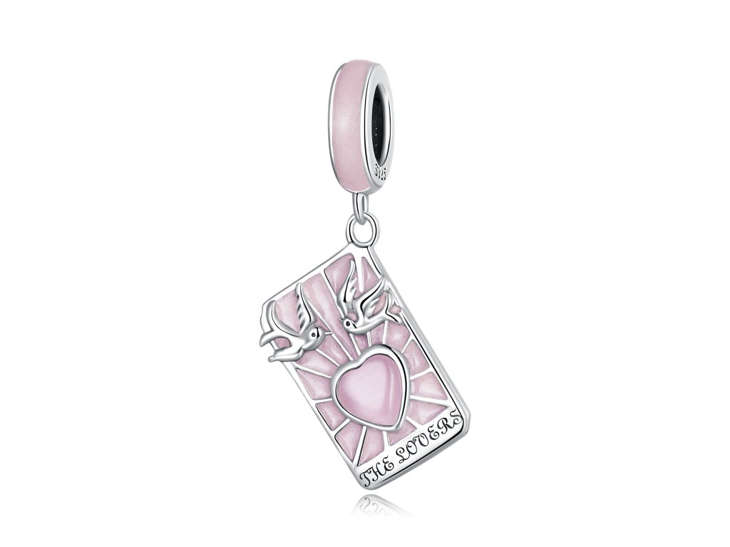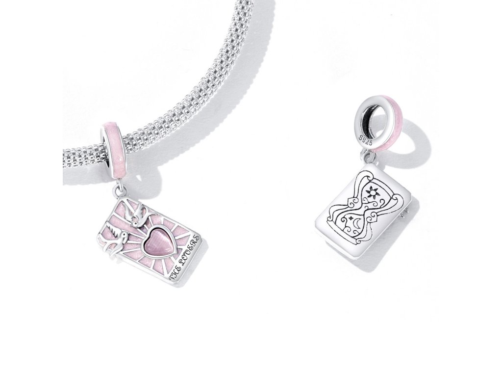 - Stříbrný visací přívěsek v designu tarotových karet zdobených milovaným srdcem holubicemi a ručně nanášenou třpytivou růžovou glazurou. Originální design přívěsku, kvalitní zpracování a materiál, ručně dohotovené.