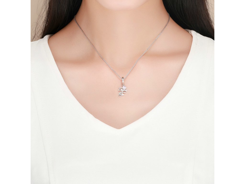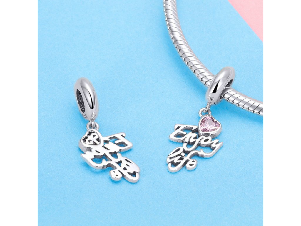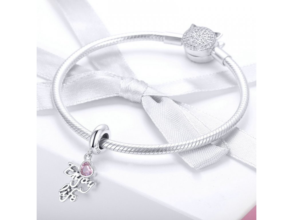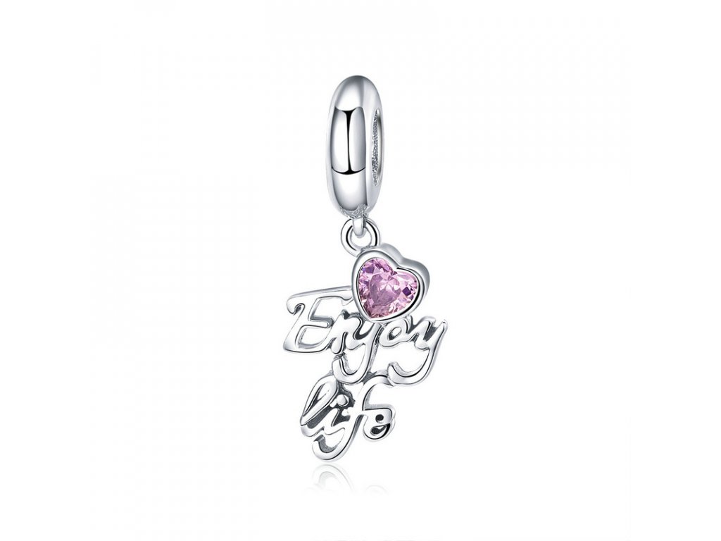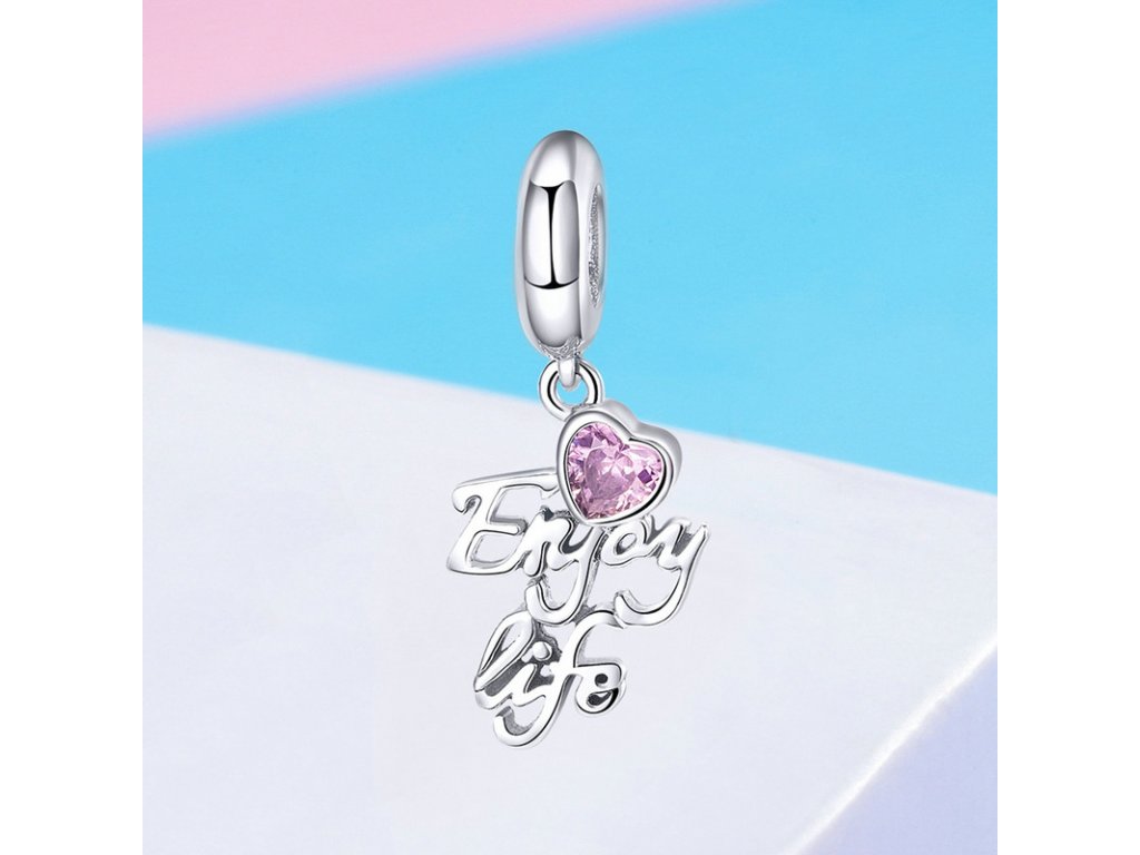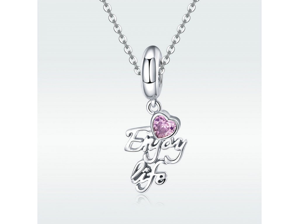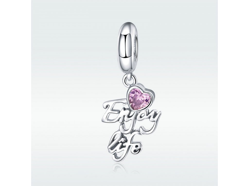 Luxusní a propracovaný visací přívěsek s anglickým nápisem "Enjoy life" v překladu "užívej života", který je obohacený ručně posázeným srdíčkem v podobě růžového zirkonu. Originální design přívěsku, kvalitní zpracování a materiál, ručně dohotovené. Obdarujte sebe nebo své blízké tímto stříbrným kouzlem.
