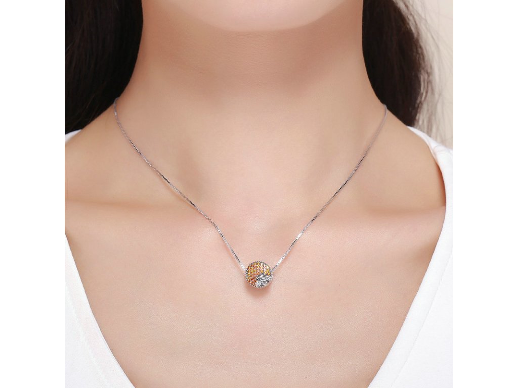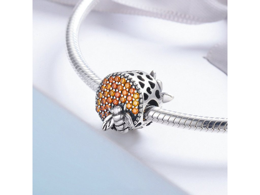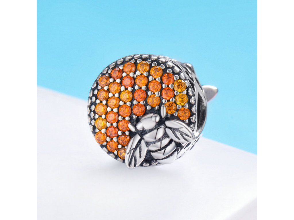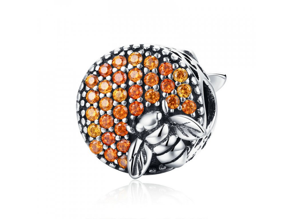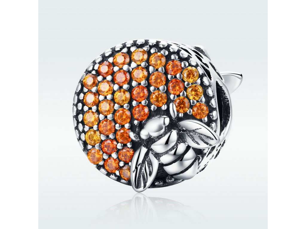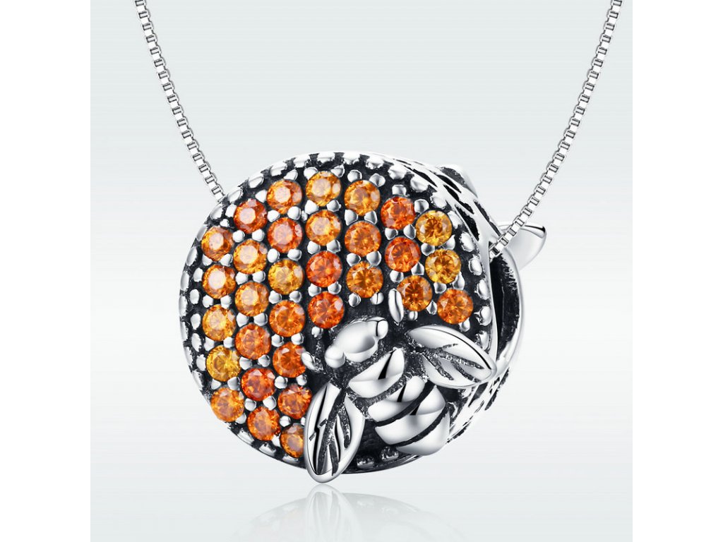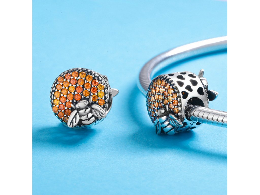 - Detailně propracovaný korálek kulatého tvaru s oranžovými zirkony a smaltované včely, která je symbolem pozitivních a užitečných vlastností - harmonie, píle a nesobeckosti. Originální design přívěsku, kvalitní zpracování a materiál, ručně dohotovené.