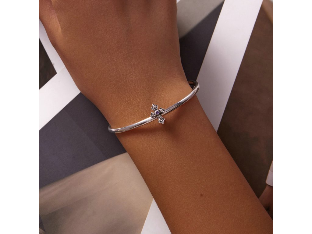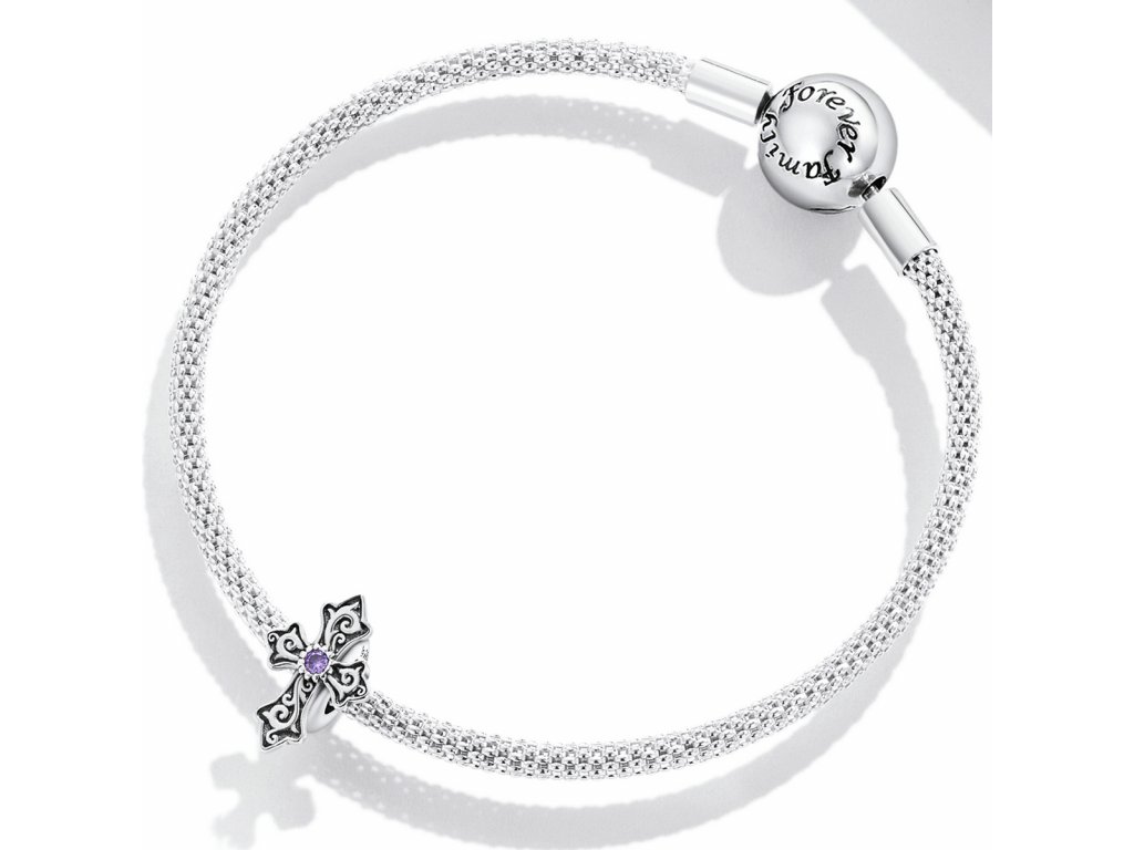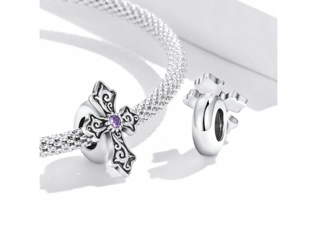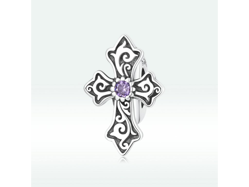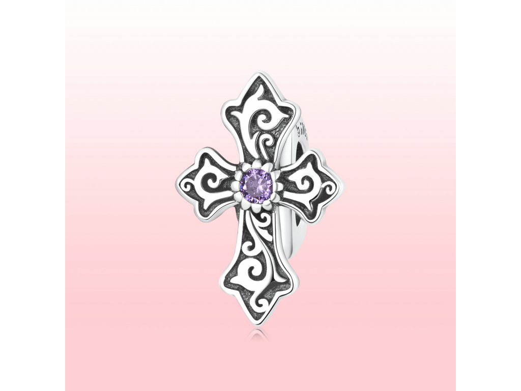 - Stříbrný přívěsek spacer v designu vintage kříže zdobeného fialovým zirkonem. Originální design přívěsku, kvalitní zpracování a materiál, ručně dohotovené.