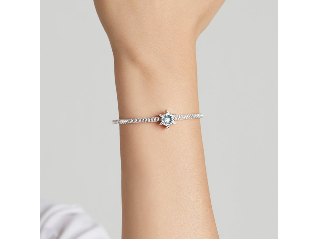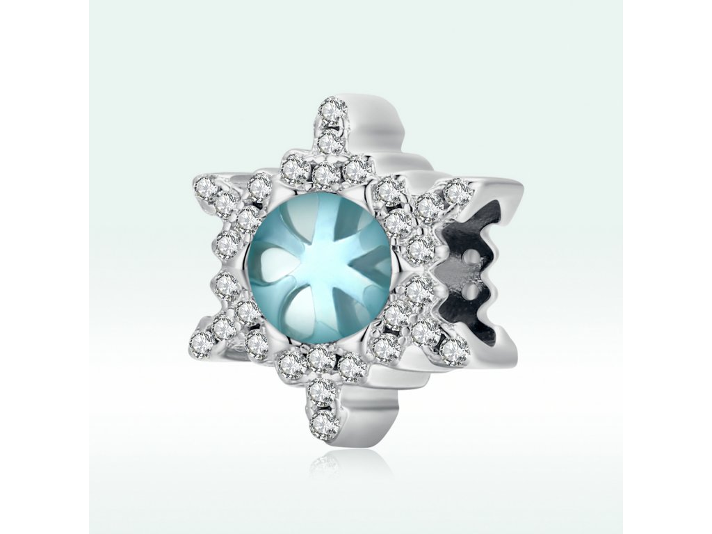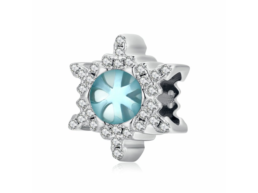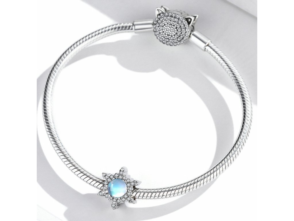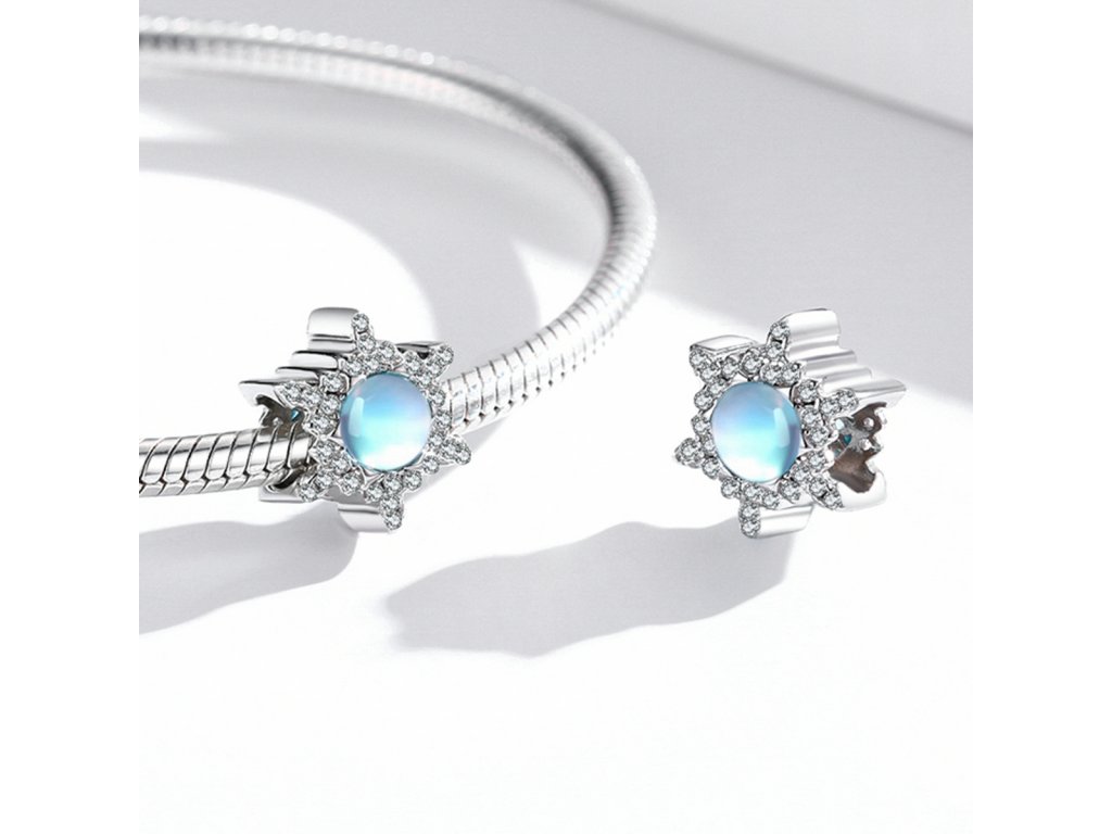 - Stříbrný přívěsek v designu krásné zimní sněhové vločky zdobené duhovým měsíčním kamenem Moonstone a čirými třpytivými zirkony. Originální design přívěsku, kvalitní zpracování a materiál, ručně dohotovené.