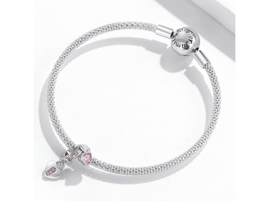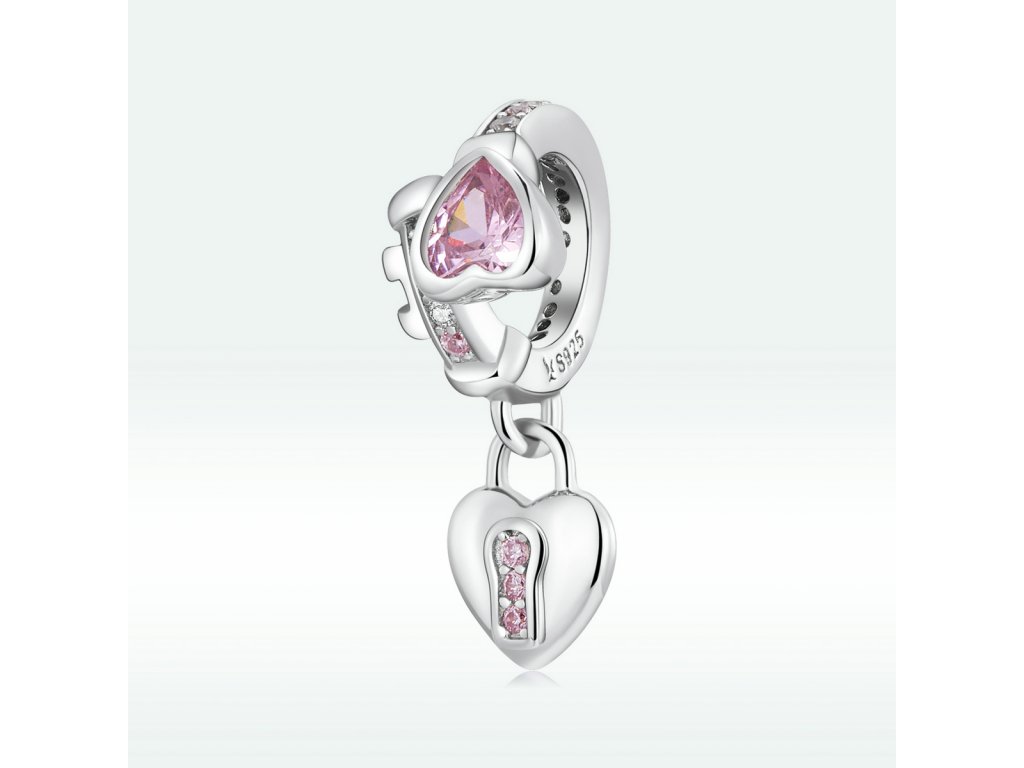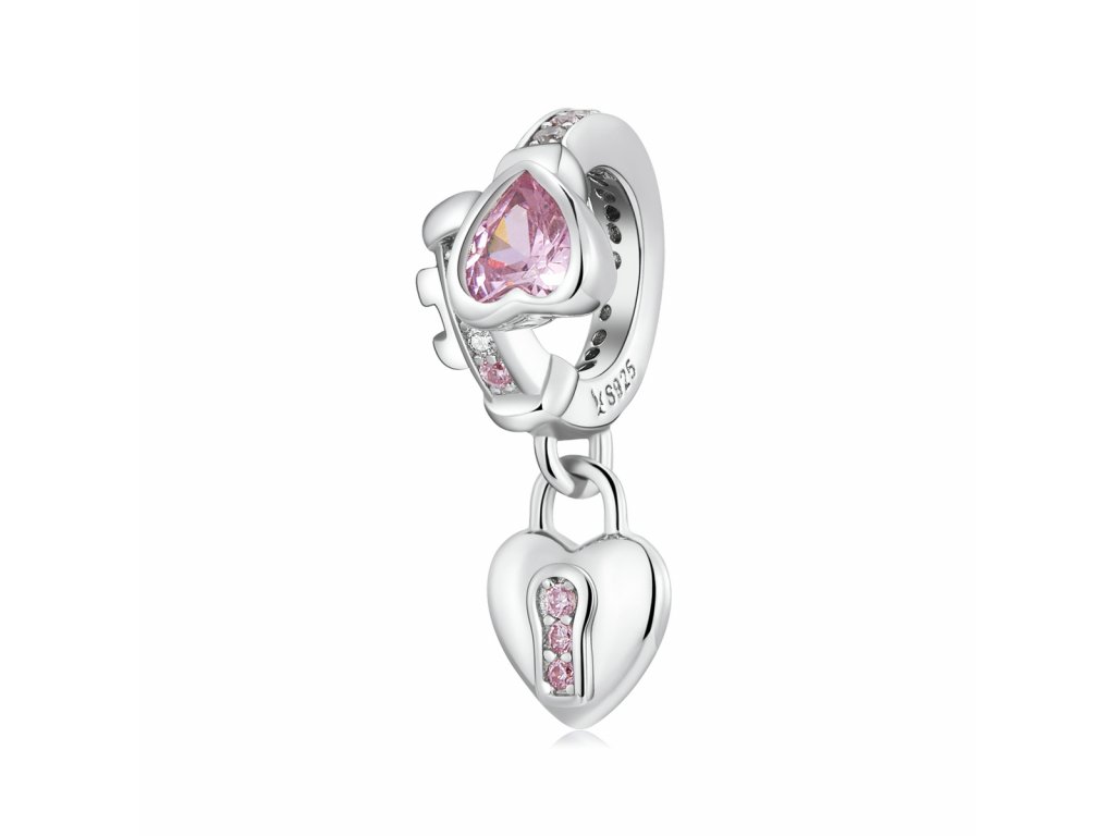- Stříbrný přívěsek v designu romantického klíčku a zámku zdobeného čirými třpytivými a růžovými zirkony. Originální design přívěsku, kvalitní zpracování a materiál, ručně dohotovené.